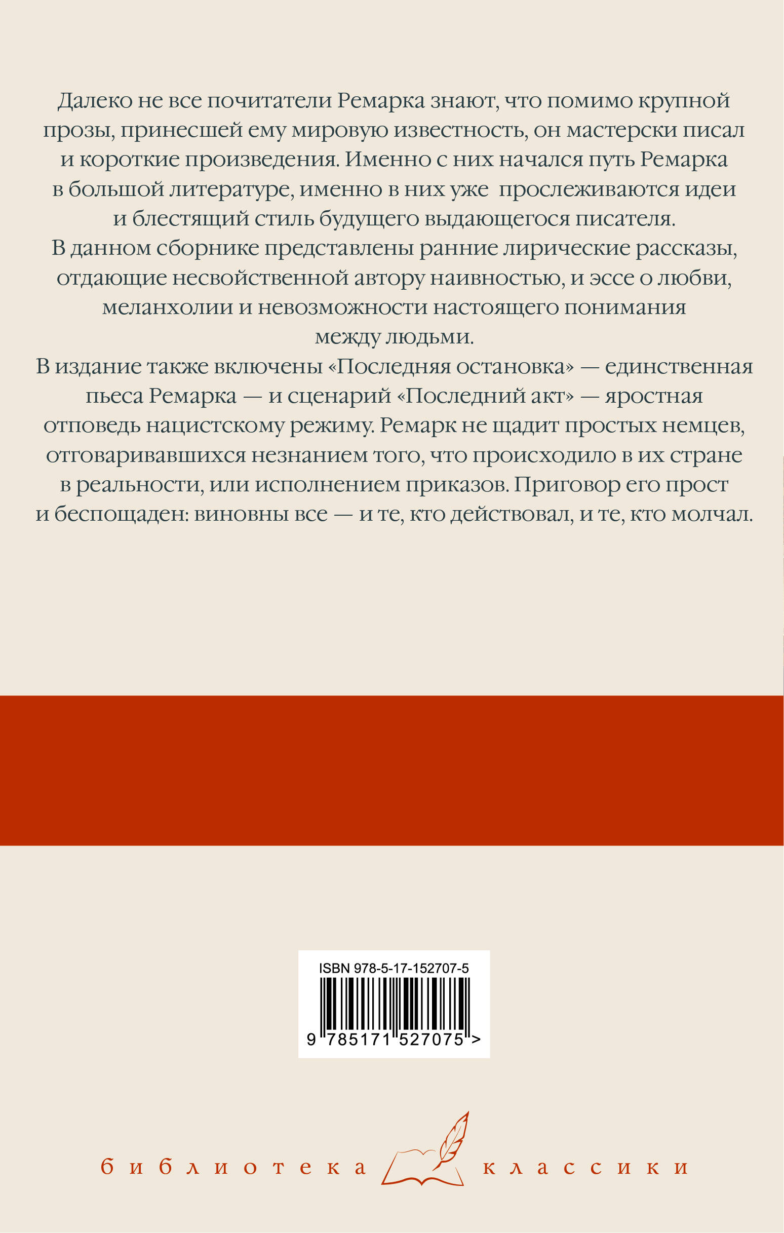 Далеко не все почитатели Ремарка знают, что помимо крупной прозы, принесшей ему мировую известность, он мастерски писал и короткие произведения. Именно с них начался путь Ремарка в большой литературе, именно в них уже прослеживаются идеи и блестящий стиль будущего выдающегося писателя. В данном сборнике представлены ранние лирические рассказы, отдающие несвойственной автору наивностью, и эссе о любви, меланхолии и невозможности настоящего понимания между людьми. В издание также включены "Последняя остановка" - единственная пьеса Ремарка, а также сценарий "Последний акт" - яростная отповедь нацистскому режиму. Ремарк не щадит простых немцев, отговаривавшихся незнанием того, что происходило в их стране в реальности, или исполнением приказов. Приговор его прост и беспощаден: виновны все - и те, кто действовал, и те, кто молчал.