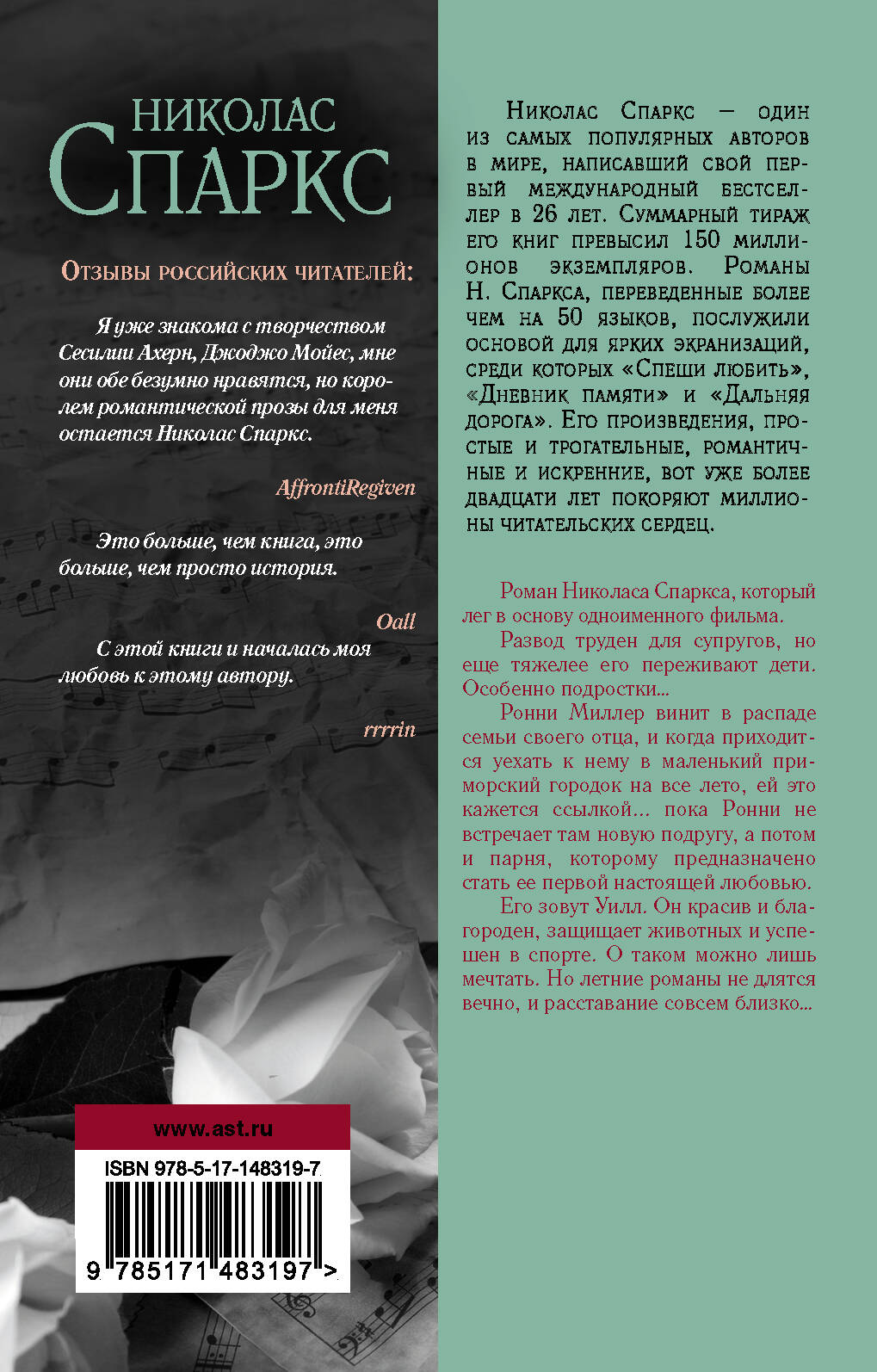 Роман Николаса Спаркса, который лег в основу одноименного фильма. Развод труден для супругов, но еще тяжелее его переживают дети. Особенно подростки… Ронни Миллер винит в распаде семьи своего отца, и когда приходится уехать к нему в маленький приморский городок на все лето, ей это кажется ссылкой... пока Ронни не встречает там новую подругу, а потом и парня, которому предназначено стать ее первой настоящей любовью. Его зовут Уилл. Он красив и благороден, защищает животных и успешен в спорте. О таком можно лишь мечтать. Но летние романы не длятся вечно, и расставание совсем близко…| Издательство | АСТ |