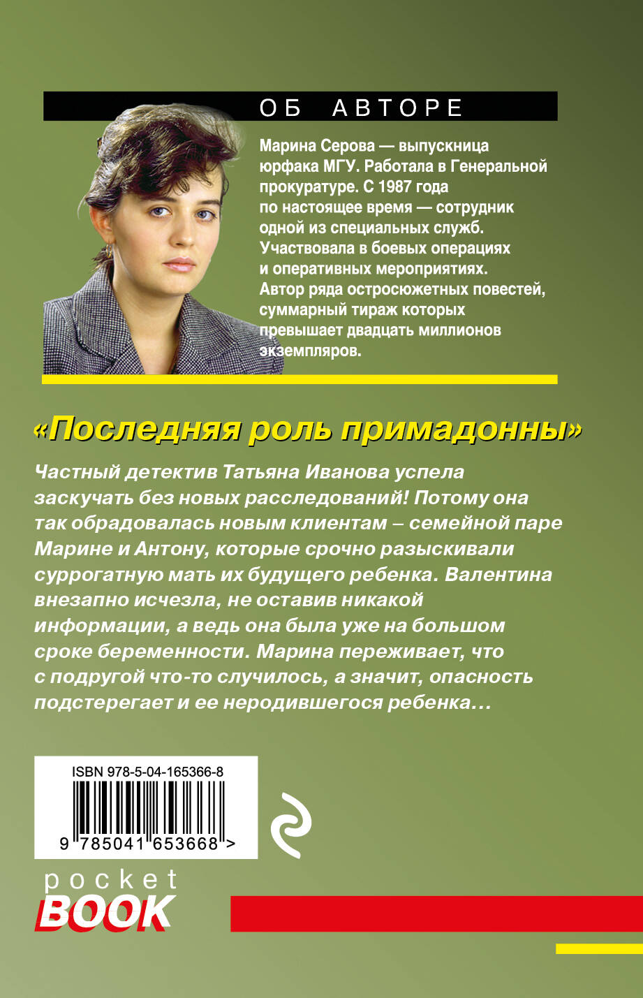 Частный детектив Татьяна Иванова успела заскучать без новых расследований! Потому она так обрадовалась новым клиентам - семейной паре Марине и Антону, которые срочно разыскивали суррогатную мать их будущего ребенка. Валентина внезапно исчезла, не оставив никакой информации, а ведь она была уже на большом сроке беременности. Марина переживает, что с подругой что-то случилось, а значит, опасность подстерегает и еще не родившегося малыша… Куда же подевалась суррогатная мать, как связаны между собой ее исчезновение и смерть ее гражданского мужа и что предпримет частный детектив Татьяна Иванова - об этом и не только читайте в новом детективе Марины Серовой!| Издательство | Эксмо |
