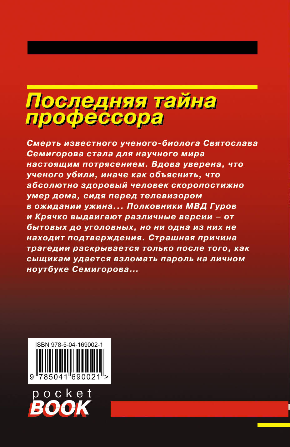 Еще одна книга легендарного тандема Леонов - Макеев. Смерть известного ученого-биолога Святослава Семигорова стала для научного мира настоящим потрясением. Вдова уверена, что ученого убили, иначе как объяснить, что абсолютно здоровый человек скоропостижно умер дома, сидя перед телевизором, в ожидании ужина... Полковники МВД Гуров и Крячко выдвигают различные версии - от бытовых до уголовных, но ни одна из них не находит подтверждения. Страшная причина трагедии раскрывается только после того, как сыщикам удается взломать пароль на личном ноутбуке Семигорова… Николай Леонов, в прошлом следователь МУРа, не понаслышке знал, как раскрываются самые запутанные уголовные дела. Поэтому каждая его книга - это правдивая захватывающая история с непредсказуемой интригой и неожиданным финалом. Главный герой этих книг, полковник Лев Гуров - сыщик высокого класса, к тому же с массой положительных человеческих качеств. Его уважают друзья, боятся враги и любят женщины. Он - настоящий отечественный супермен. Романы о Льве Гурове вот уже сорок лет неизменно привлекают поклонников отечественного детектива. Ставшая классической серия «Черная кошка» насчитывает более 200 книг, вышедших тиражом в десятки миллионов экземпляров.| Издательство | Эксмо |
