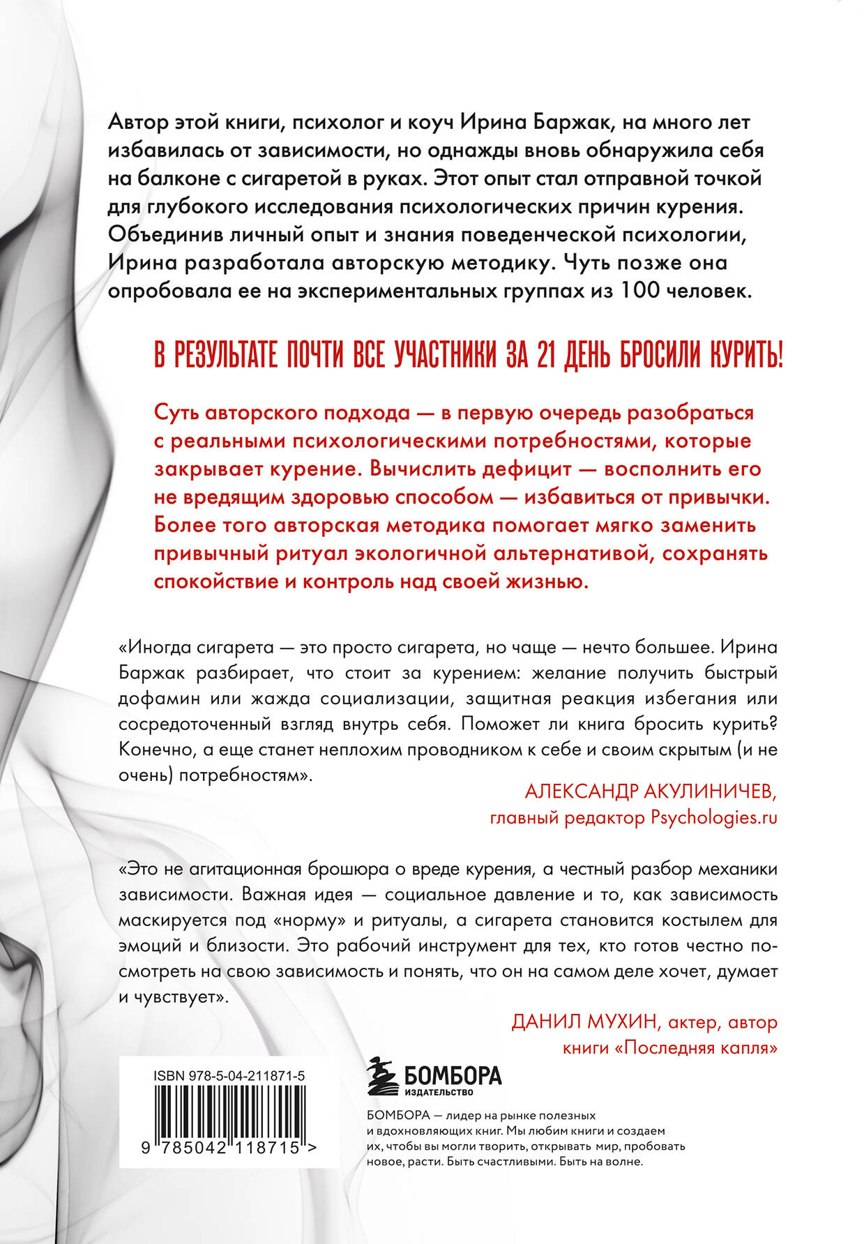 Автор этой книги, психолог и коуч Ирина Баржак, на много лет избавилась от зависимости, но однажды вновь обнаружила себя на балконе с сигаретой в руках. Этот опыт стал отправной точкой для глубокого исследования психологических причин курения. Объединив личный опыт и знания поведенческой психологии, Ирина разработала авторскую методику. Чуть позже она опробовала ее на экспериментальных группах из 100 человек. В результате почти все участники за 21 день бросили курить! Суть авторского подхода - в первую очередь разобраться с реальными психологическими потребностями, которые закрывает курение. Вычислить дефицит - восполнить его не вредящим здоровью способом - избавиться от привычки. Более того, авторская методика помогает мягко заменить привычный ритуал экологичной альтернативой, сохранять спокойствие и контроль над своей жизнью. «Иногда сигарета - это просто сигарета, но чаще - нечто большее. Ирина Баржак разбирает, что стоит за курением: желание получить быстрый дофамин или жажда социализации, защитная реакция избегания или сосредоточенный взгляд внутрь себя. Поможет ли книга бросить курить? Конечно, а еще станет неплохим проводником к себе и своим скрытым (и не очень) потребностям». - Александр Акулиничев, главный редактор Psychologies.ru «Это не агитационная брошюра о вреде курения, а честный разбор механики зависимости. Важная идея - социальное давление и то, как зависимость маскируется под "норму" и ритуалы, а сигарета становится костылем для эмоций и близости. Это рабочий инструмент для тех, кто готов честно посмотреть на свою зависимость и понять, что он на самом деле хочет, думает и чувствует». - Данил Мухин, актер, автор книги «Последняя капля»| Издательство | ООО "Издательство "Эксмо" |