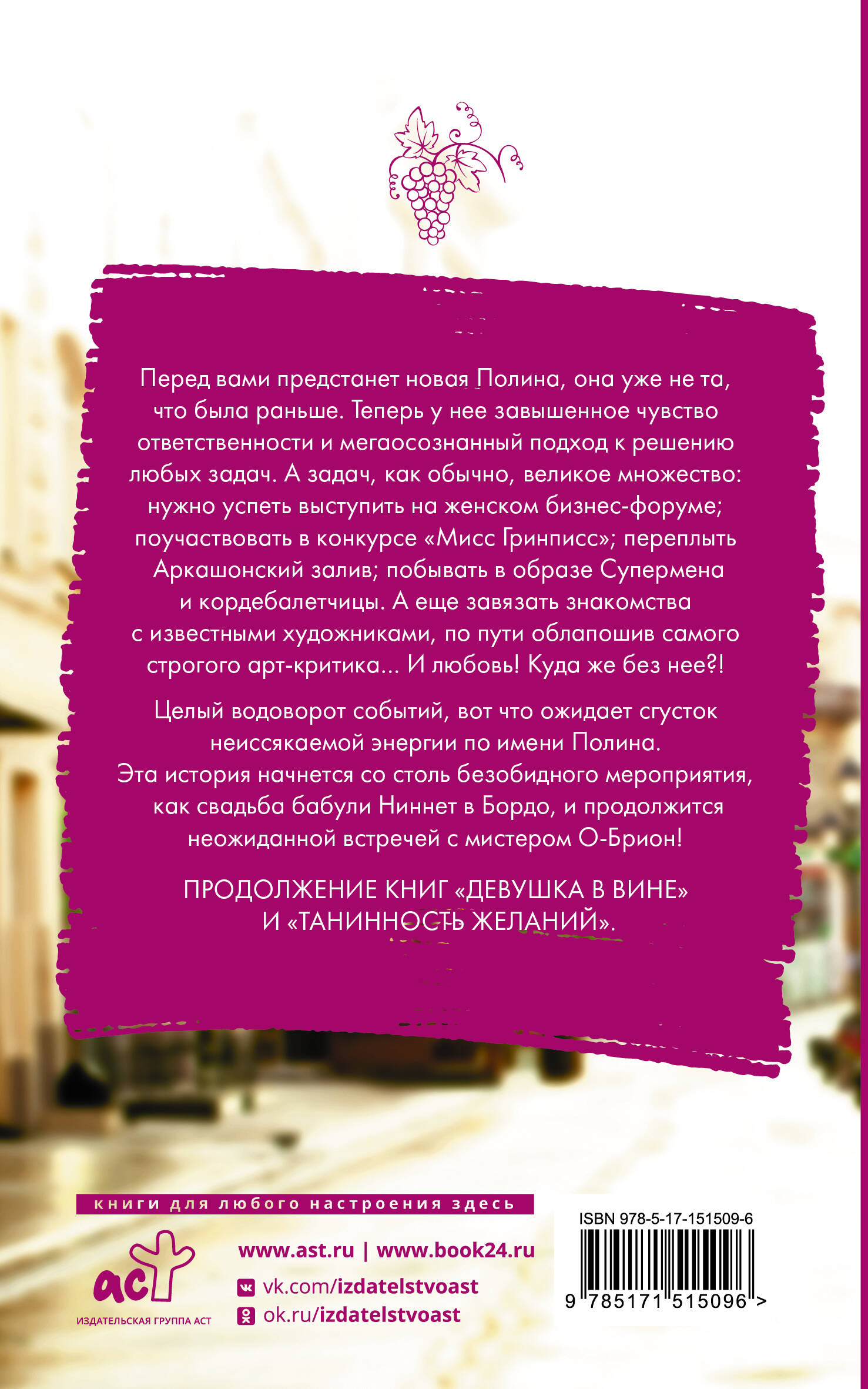 Энергичная Полина окунется в водоворот приключений, чтобы в конечном итоге прийти к своей цели - свадьбе с мистером "О-Брион". Продолжение книг «Девушка в вине» и «Танинность желаний».| Издательство | Издательство "АСТ" |