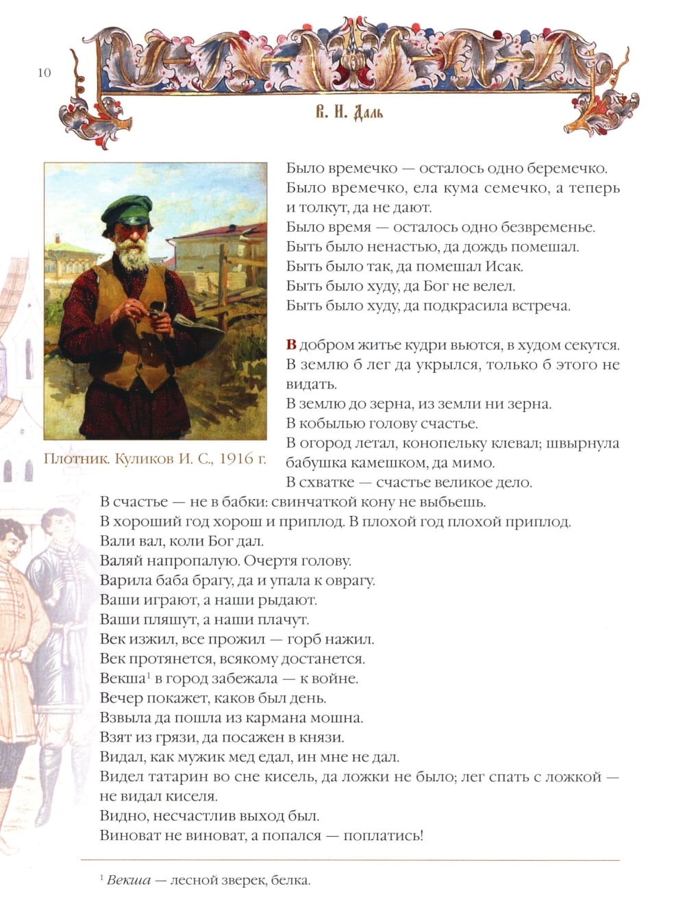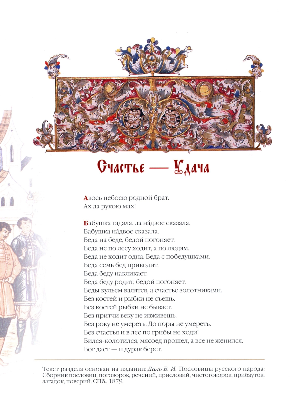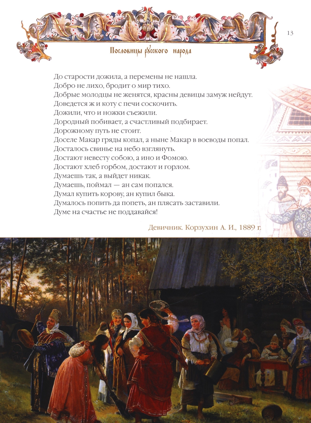 Русские народные пословицы уникальны, они позволяют максимально точно и кратко, метко и выразительно, образно и поэтично описать разнообразные жизненные явления. Многие поколения наших предков передавали их из уст в уста сотни лет и собрали бесценную копилку народной мудрости. В книге представлены избранные пословицы и притчи, собранные самыми известными исследователями русского фольклора. «Пословицы русского народа» В. И. Даля, «Сказания русского народа» И. П. Сахарова, «Русские народные пословицы» И. М. Снегирева, «Жизнь русского народа в его пословицах и поговорках» И. И. Иллюстрова - эти классические труды знатоков русского языка не потеряли актуальности и в наши дни. Издание иллюстрировано произведениями классической отечественной живописи.,