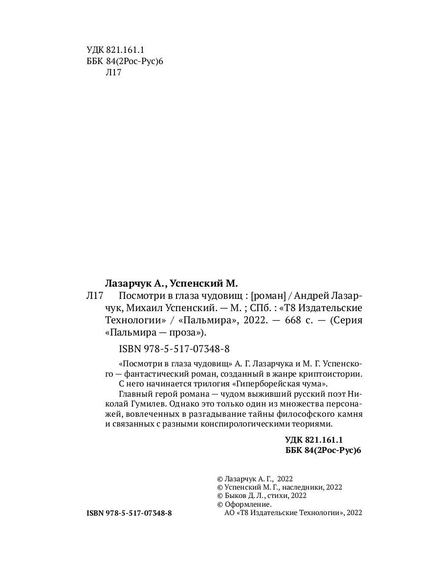 "Посмотри в глаза чудовищ" А.Г. Лазарчука и М.Г. Успенского - фантастический роман, созданный в жанре криптоистории. С него начинается трилогия "Гиперборейская чума". Главный герой романа - чудом выживший русский поэт Николай Гумилев. Однако это только один из множества персонажей, вовлеченных в разгадывание тайны философского камня и связанных с разными конспирологическими теориями.