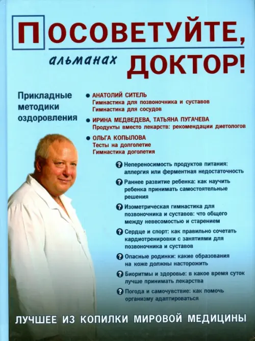 Альманах "Посоветуйте, доктор!" подготовлен по материалам одноименной передачи Радио России. В этот выпуск вошли следующие прикладные методики оздоровления от известных российских врачей: лечебные позы-движения для снятия болей в позвоночнике и суставах, а также гимнастика для оздоровления сосудов главного врача Центра мануальной медицины профессора А.Б. Сителя; рекомендации диетологов члена-корреспондента РАН Ирины Медведевой и к.м.н. Татьяны Пугачевой о правильном питании, о "живых" и "мертвых" продуктах, о продуктах, полезных для сердца и сосудов и обладающих противораковыми свойствами; материал ведущей программы "Посоветуйте, доктор!" Ольги Копыловой, включающий тесты на долголетие и гимнастику долголетия на тренировку равновесия. В альманахе также опубликованы беседы с ведущими российскими врачами о современных методах профилактики и лечения различных заболеваний.