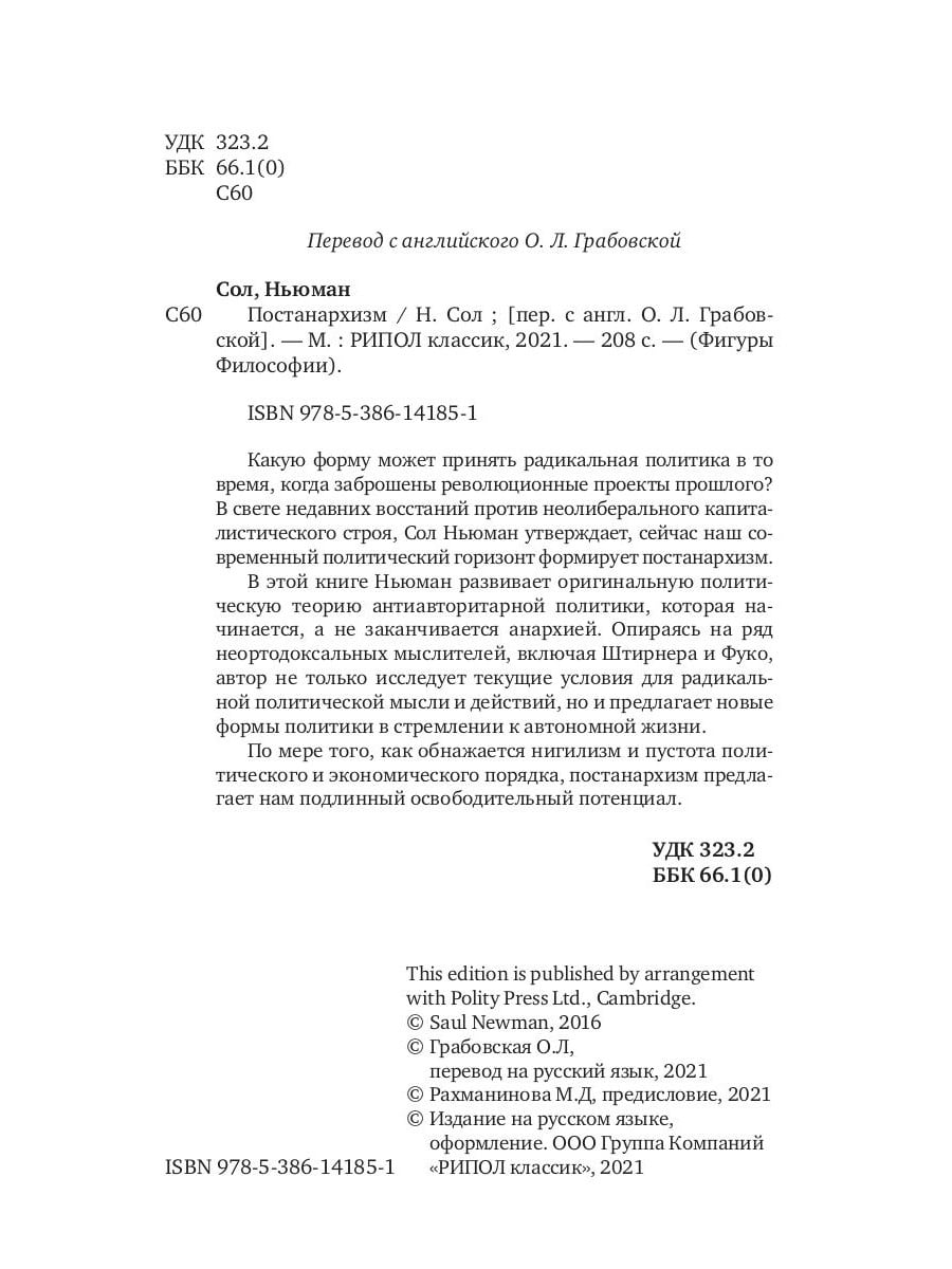 Какую форму может принять радикальная политика в то время, когда заброшены революционные проекты прошлого? В свете недавних восстаний против неолиберального капиталистического строя, Сол Ньюман утверждает, сейчас наш современный политический горизонт формирует постанархизм. В этой книге Ньюман развивает оригинальную политическую теорию антиавторитарной политики, которая начинается, а не заканчивается анархией. Опираясь на ряд неортодоксальных мыслителей, включая Штирнера и Фуко, автор не только исследует текущие условия для радикальной политической мысли и действий, но и предлагает новые формы политики в стремлении к автономной жизни. По мере того, как обнажается нигилизм и пустота политического и экономического порядка, постанархизм предлагает нам подлинный освободительный потенциал.| Издательство | Рипол Классик |