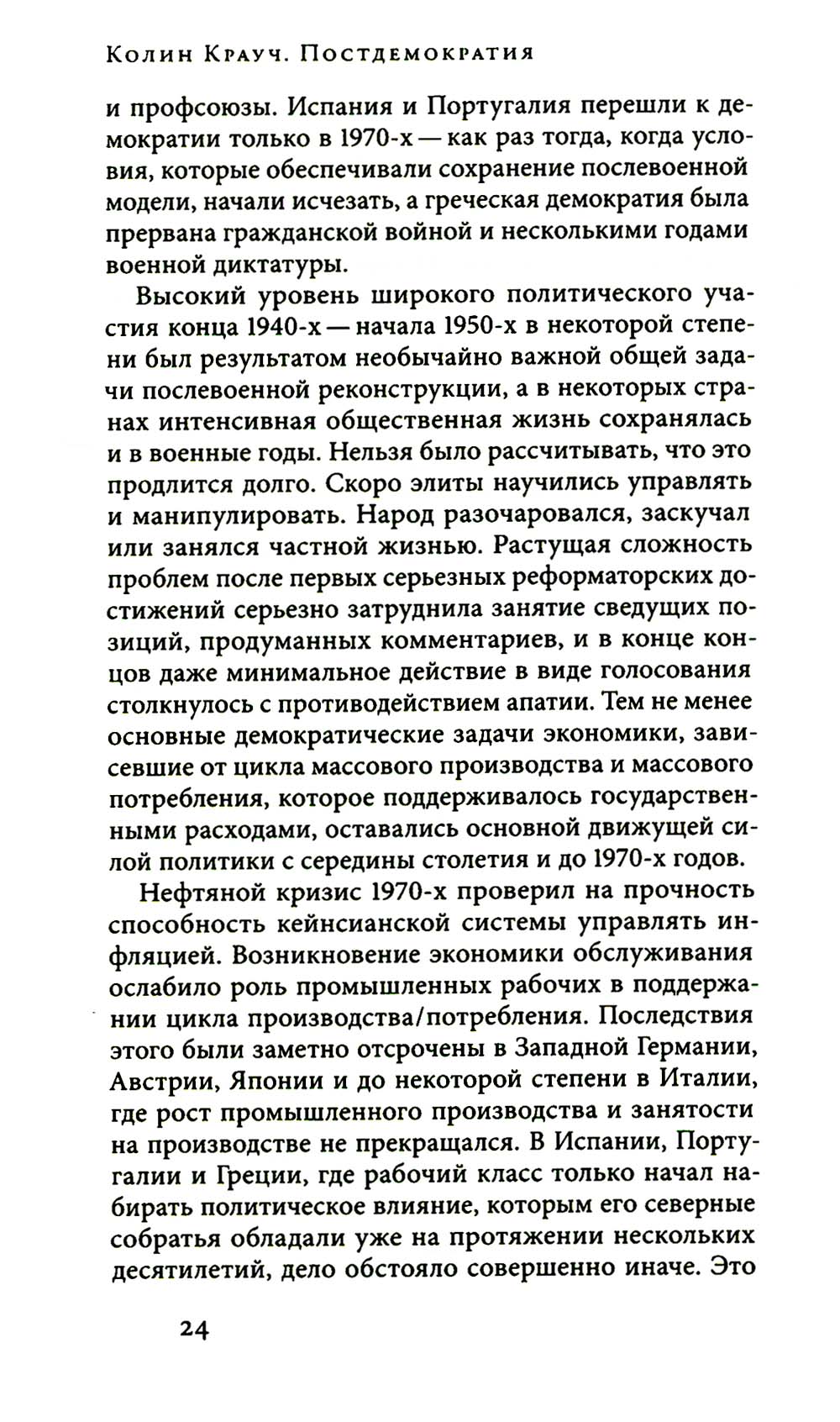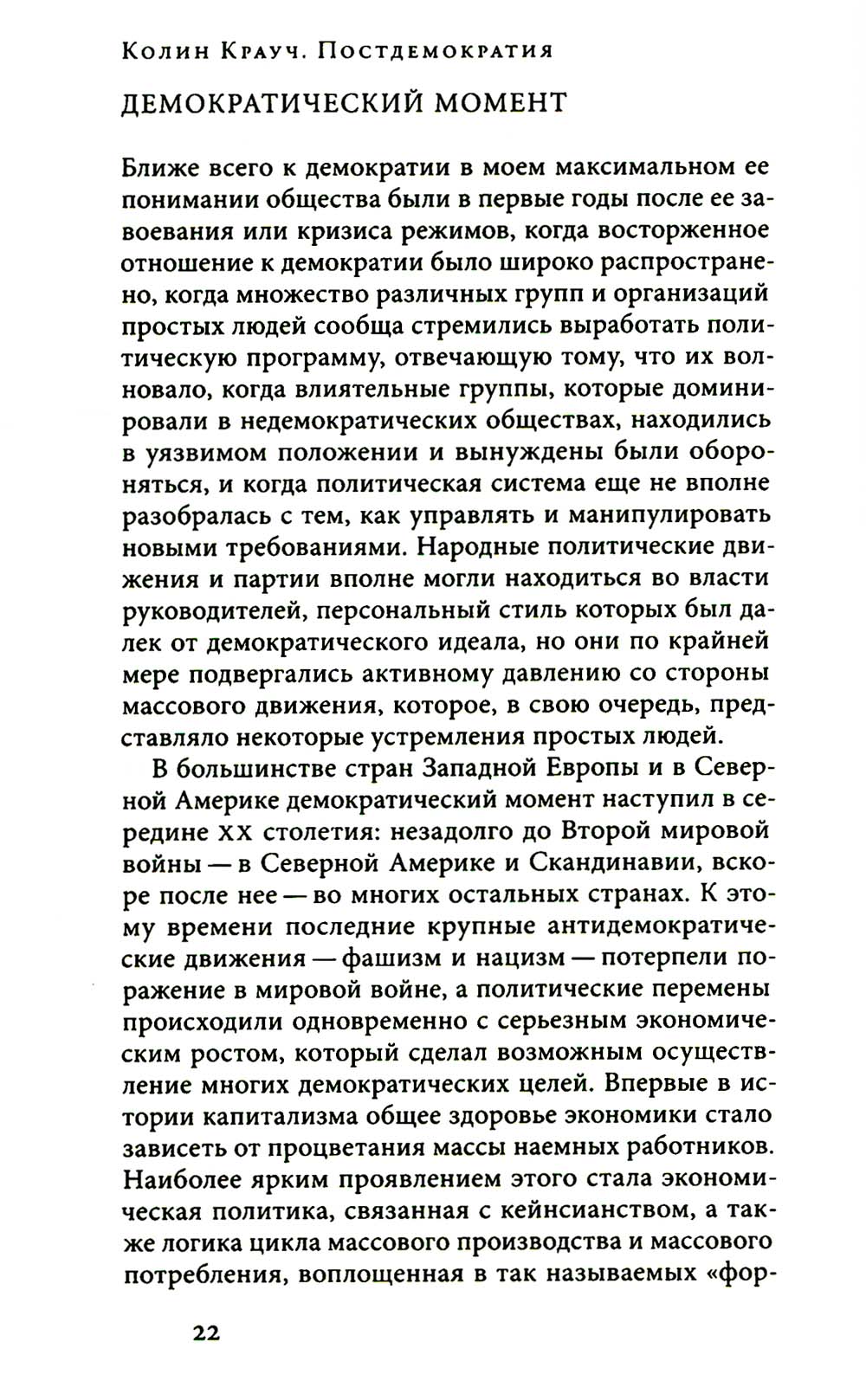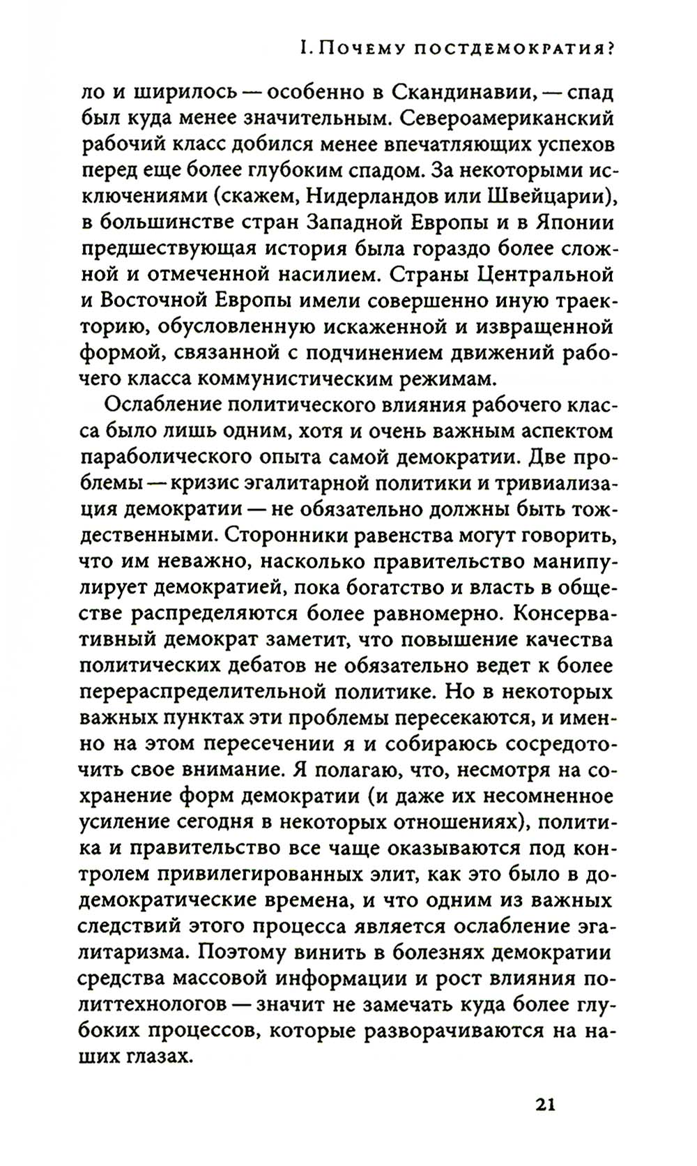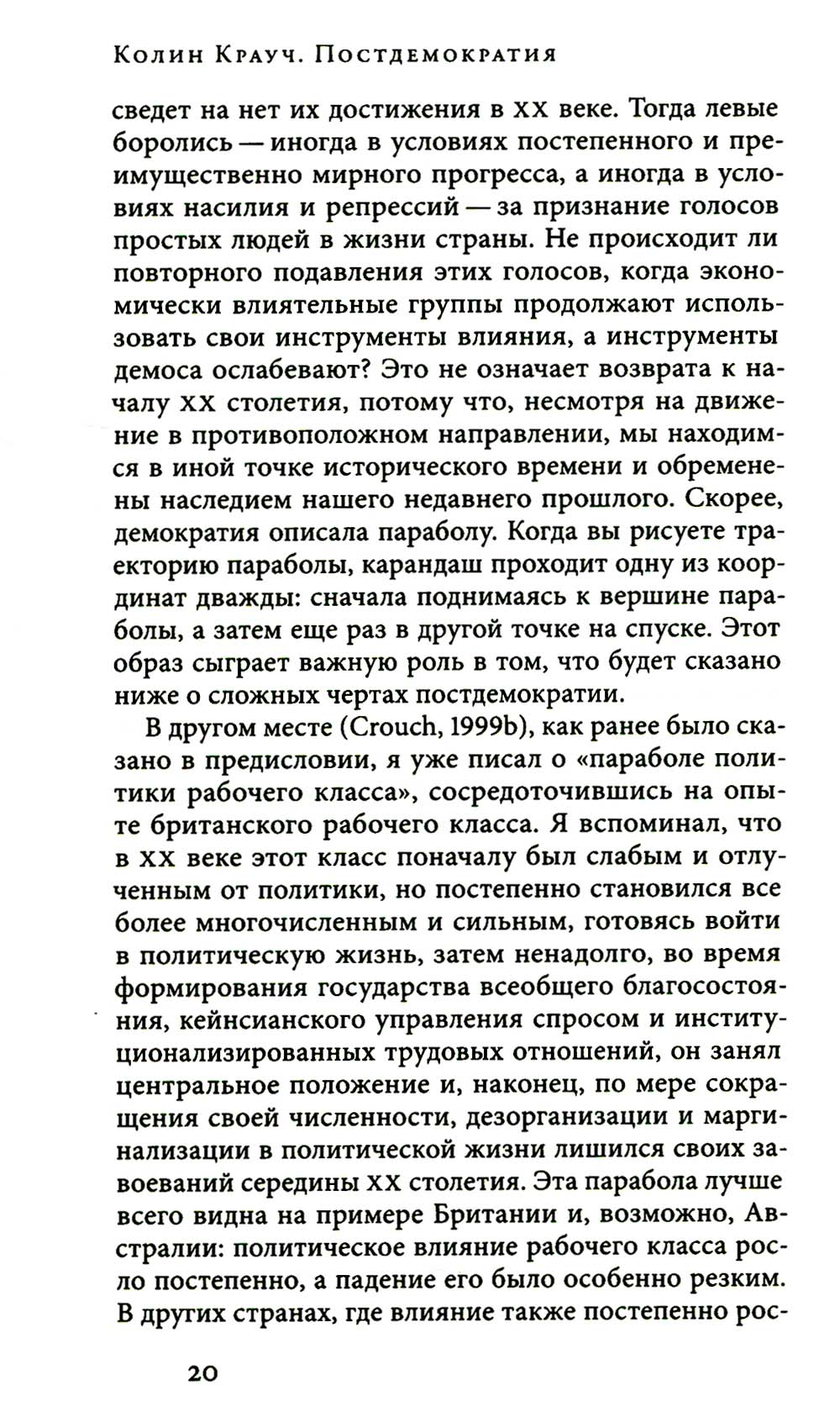 В своей нашумевшей в западной интеллектуальной и научной среде книге профессор социологии Уорикского университета (Великобритания) Колин Крауч утверждает, что упадок общественных классов, которые сделали возможной массовую политику, и распространение глобального капитализма привели к возникновению замкнутого политического класса, больше заинтересованного в создании связей с влиятельными бизнес-группами, чем в проведении политических программ, отвечающих интересам простых граждан. Он показывает, что в ряде отношений политика начала XXI века возвращает нас к политике XIX столетия, которая определялась игрой, разыгрываемой между элитами. Тем не менее, по утверждению Крауча, опыт XX века по-прежнему остается значимым и сохраняет возможности для возрождения политики.
