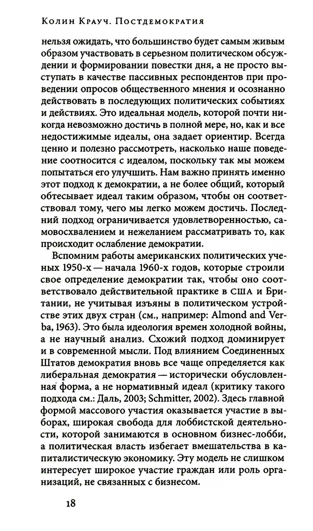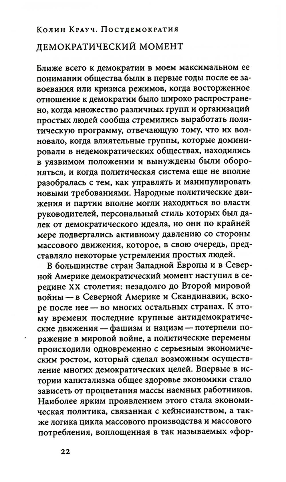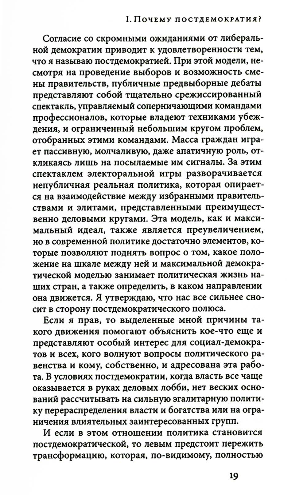В своей нашумевшей в западной интеллектуальной и научной среде книге профессор социологии Уорикского университета (Великобритания) Колин Крауч утверждает, что упадок общественных классов, которые сделали возможной массовую политику, и распространение глобального капитализма привели к возникновению замкнутого политического класса, больше заинтересованного в создании связей с влиятельными бизнес-группами, чем в проведении политических программ, отвечающих интересам простых граждан. Он показывает, что в ряде отношений политика начала XXI века возвращает нас к политике XIX столетия, которая определялась игрой, разыгрываемой между элитами. Тем не менее, по утверждению Крауча, опыт XX века по-прежнему остается значимым и сохраняет возможности для возрождения политики.