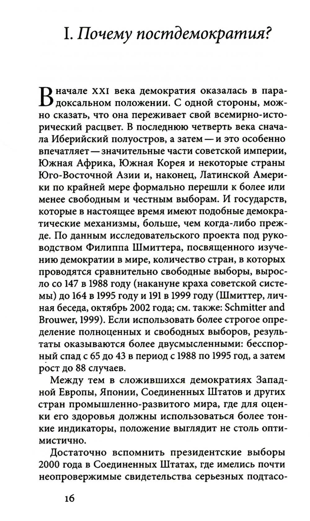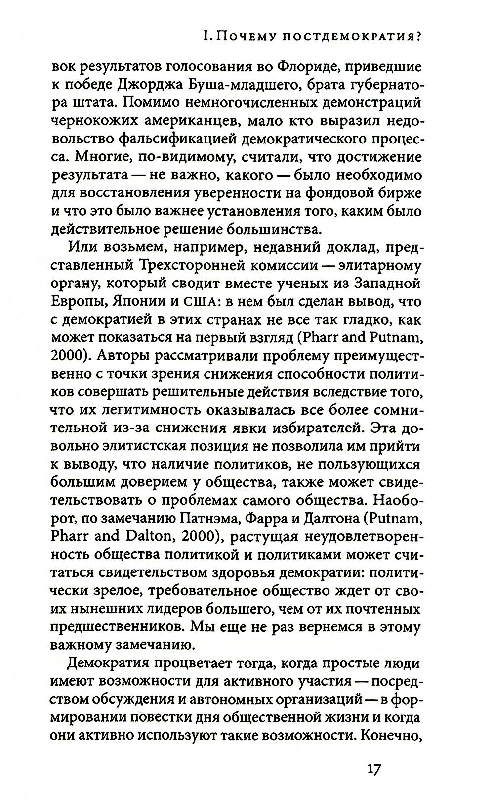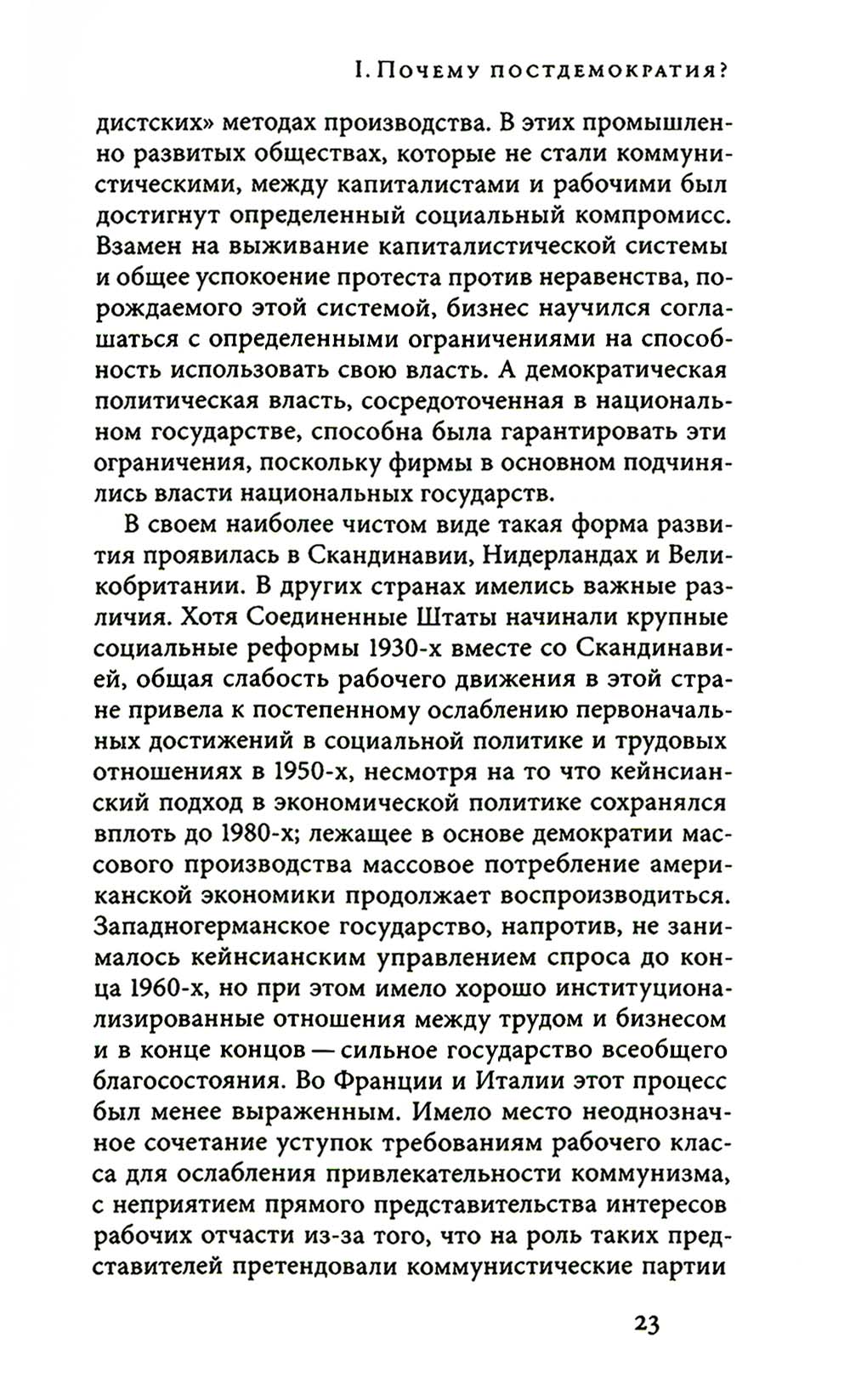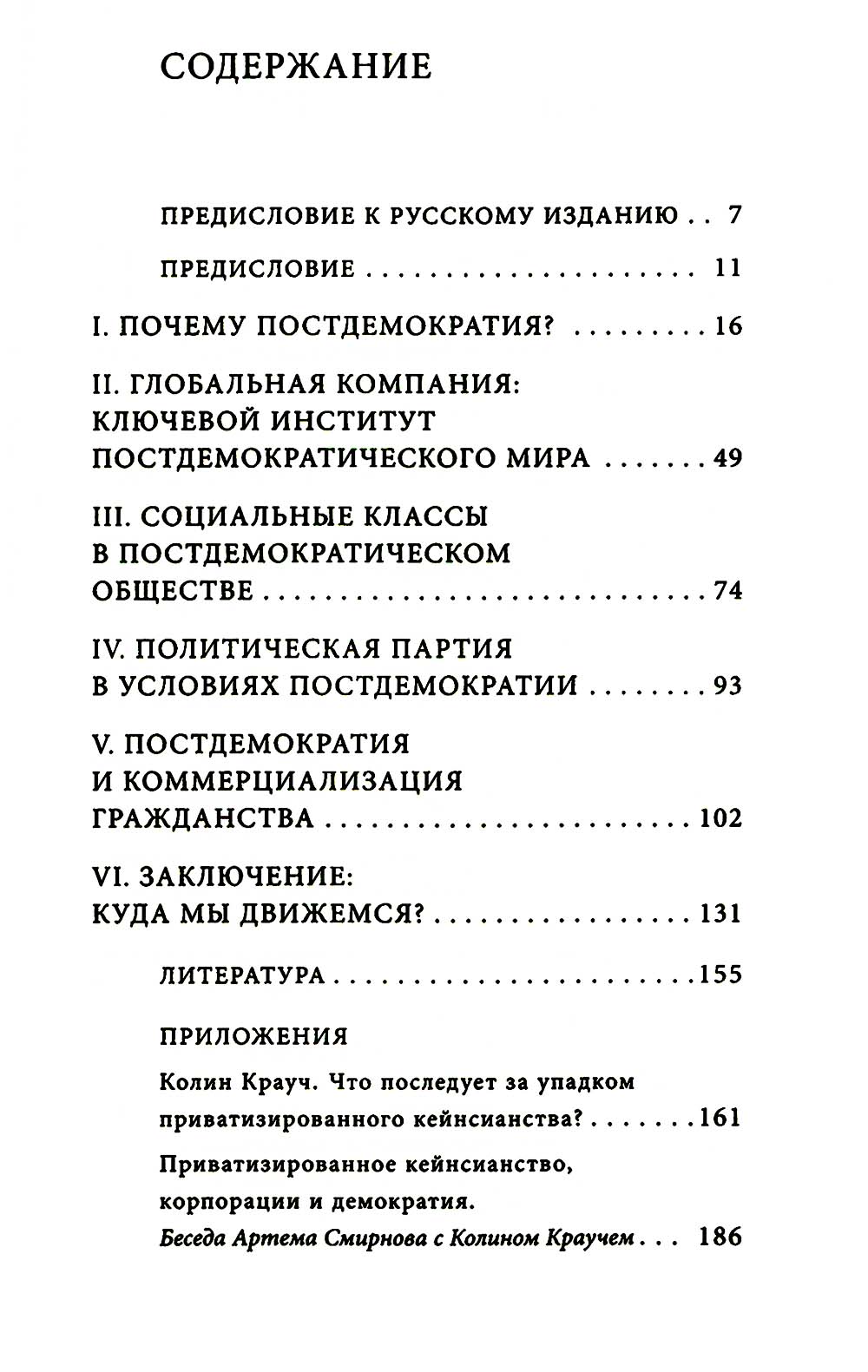 В своей нашумевшей в западной интеллектуальной и научной среде книге профессор социологии Уорикского университета (Великобритания) Колин Крауч утверждает, что упадок общественных классов, которые сделали возможной массовую политику, и распространение глобального капитализма привели к возникновению замкнутого политического класса, больше заинтересованного в создании связей с влиятельными бизнес-группами, чем в проведении политических программ, отвечающих интересам простых граждан. Он показывает, что в ряде отношений политика начала XXI века возвращает нас к политике XIX столетия, которая определялась игрой, разыгрываемой между элитами. Тем не менее, по утверждению Крауча, опыт XX века по-прежнему остается значимым и сохраняет возможности для возрождения политики.