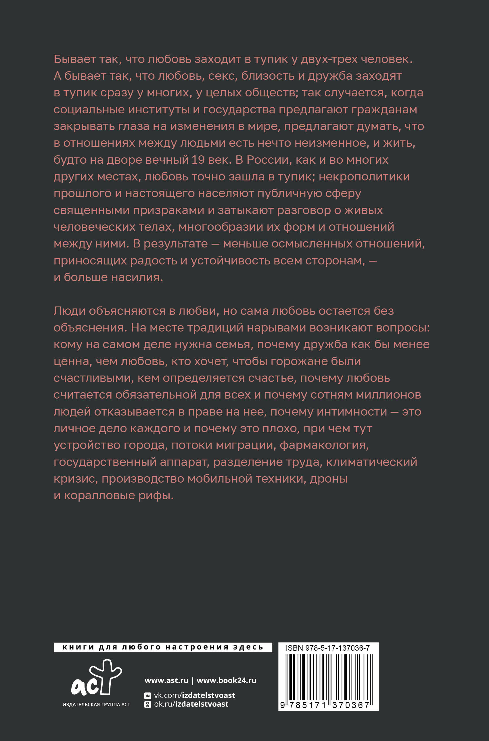 «Постлюбовь. Будущее человеческих интимностей» Виктора Вилисова - это размышления о том, почему отношения, дружба и любовь заходят в тупик у целых обществ. Как получилось, что в мире, которым правит патриархат и капитализм сама любовь остается без объяснения. Возникают вопросы: кому на самом деле нужна семья, кто хочет, чтобы горожане были счастливыми, кем определяется счастье, почему любовь считается обязательной для всех и почему сотням миллионов людей отказывается в праве на нее.| Издательство | АСТ |