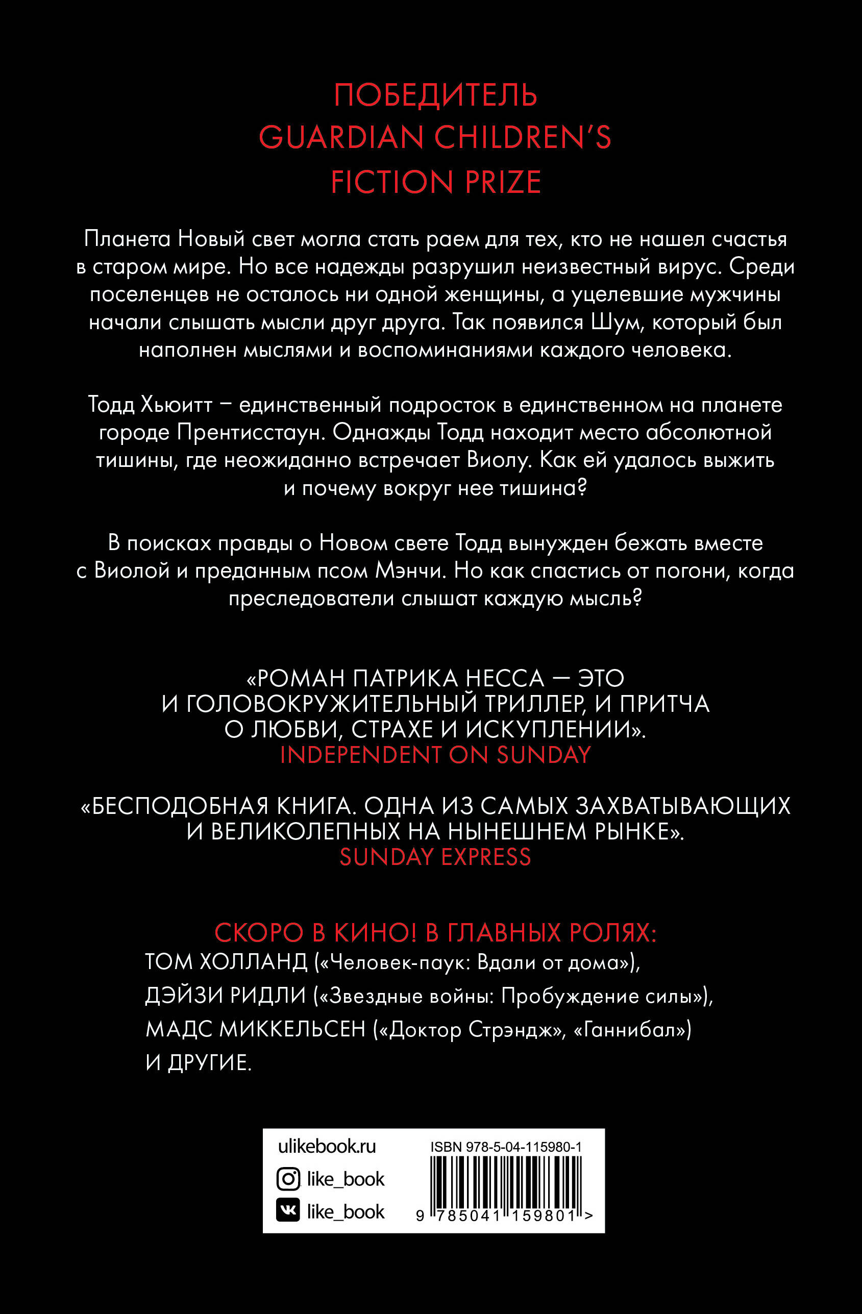 Мировой бестселлер. Книга переведена на 32 языка мира. Более 116 изданий и переизданий. Новый перевод. Экранизация от студии Lionsgate. В главных ролях Дейзи Ридли («Звездные войны»), Том Холланд («Человек-паук»), Мадс Миккельсен («Ганнибал», «Death Stranding»), Ник Джонас («Jonas Brothers»). Лауреат премий Guardian Award, Booktrust Teen Prize, James Tiptree, Jr. Award. Номинант на Carnegie Medal 2009. Планета Новый свет могла стать раем для тех, кто не нашел счастья в старом мире. Но все надежды разрушил неизвестный вирус. Среди поселенцев не осталось ни одной женщины, а уцелевшие мужчины начали слышать мысли друг друга. Так появился Шум, который был наполнен мыслями и воспоминаниями каждого человека. Тодд Хьюитт - единственный подросток в единственном на планете городе Прентисстаун. Однажды Тодд находит место абсолютной тишины, где неожиданно встречает Виолу. Как ей удалось выжить и почему вокруг нее тишина? В поисках правды о Новом свете Тодд вынужден бежать вместе с Виолой и преданным псом Манчи. Но как спастись от погони, когда преследователи слышат каждую мысль? Об авторе Патрик Несс - знаменитый американский писатель и журналист, автор десяти романов, среди которых бестселлеры «Поступь хаоса», «Больше, чем это» и «Голос монстра», а также спин-оффа «Class» к популярному телесериалу «Доктор кто». Дважды лауреат медали Карнеги за выдающийся вклад в литературу для молодежи.| Издательство | ООО "Издательство "Эксмо" |
