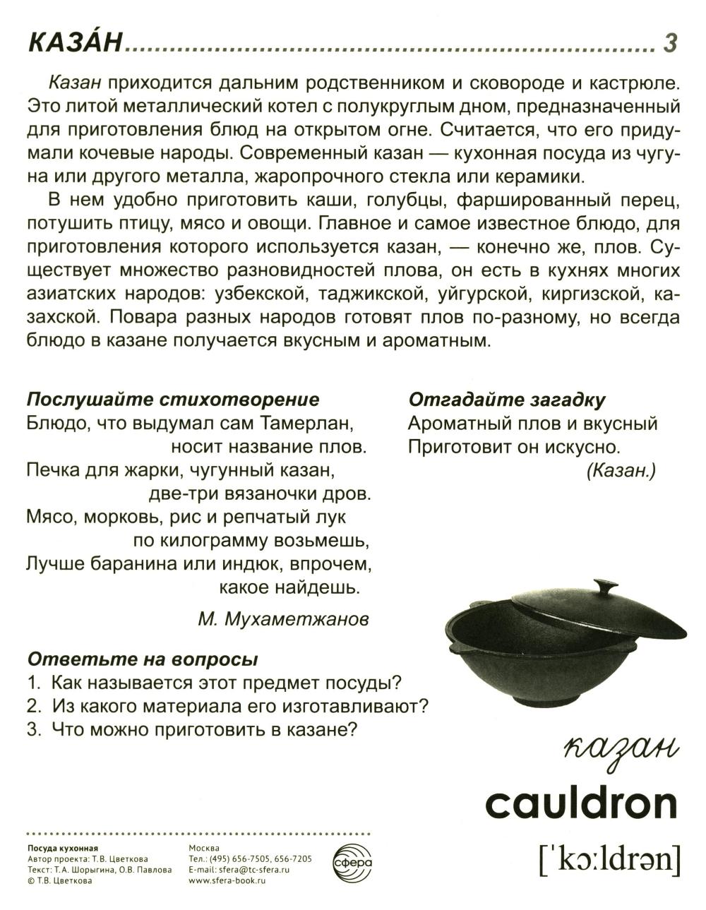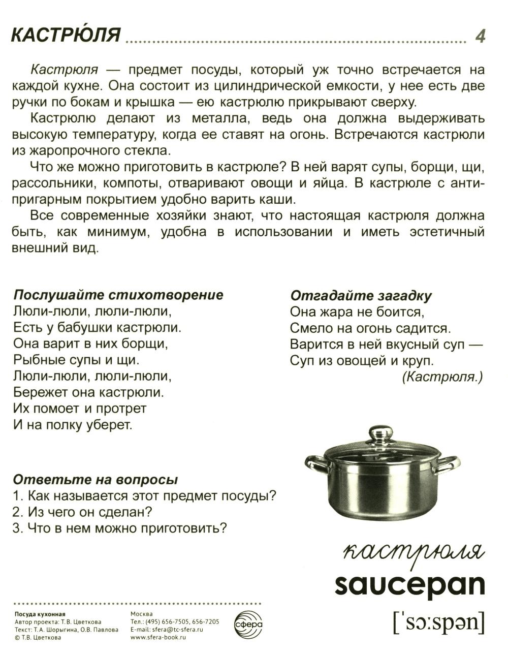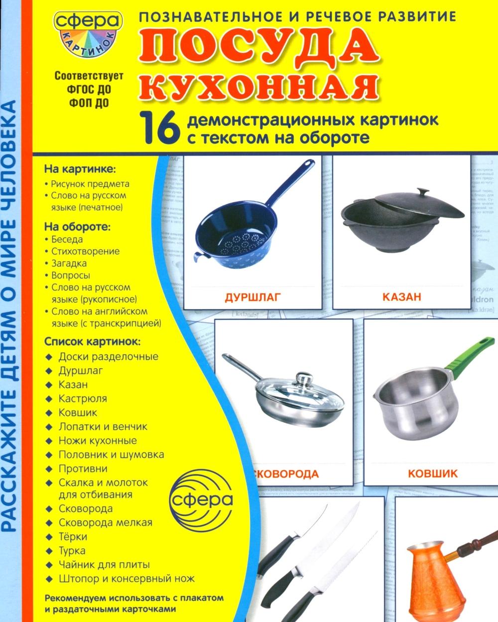 16 демонстрационных картинок размером 173х220 мм для познавательного и речевого развития. На обороте каждой предметной картинки - описание, стихотворение, загадка, вопросы для ребёнка, название на русском и английском языках. Список картинок: Посуда для приготовления пищи и напитков: казан, кастрюля, ковшик, противни, сковорода, сковорода мелкая, турка, чайник для плиты. Кухонные принадлежности: доски разделочные, дуршлаг, лопатки и венчик, ножи кухонные, половник и шумовка, скалка и молоток для отбивания, тёрки, штопор и консервный нож.| Издательство | Творческий центр Сфера |