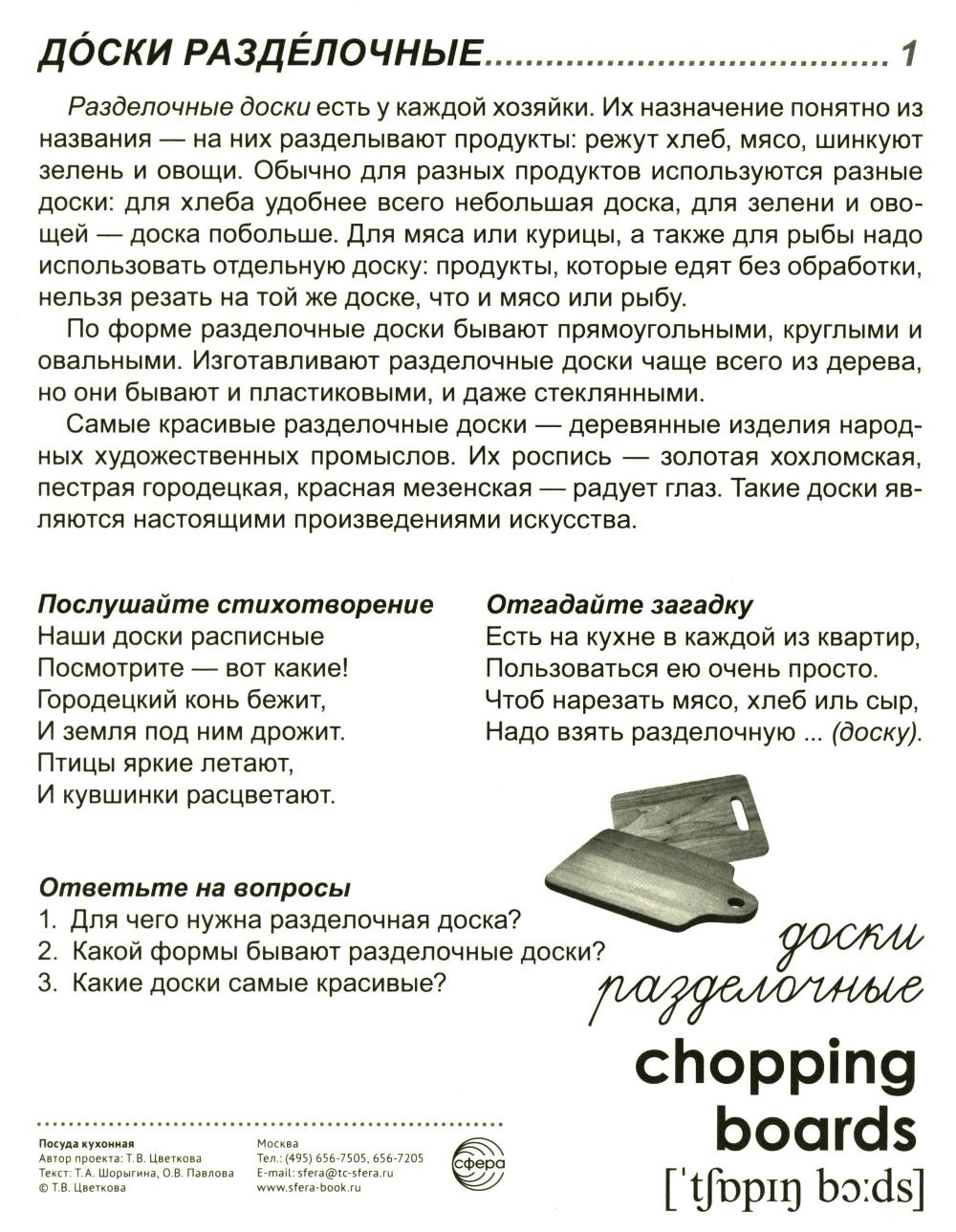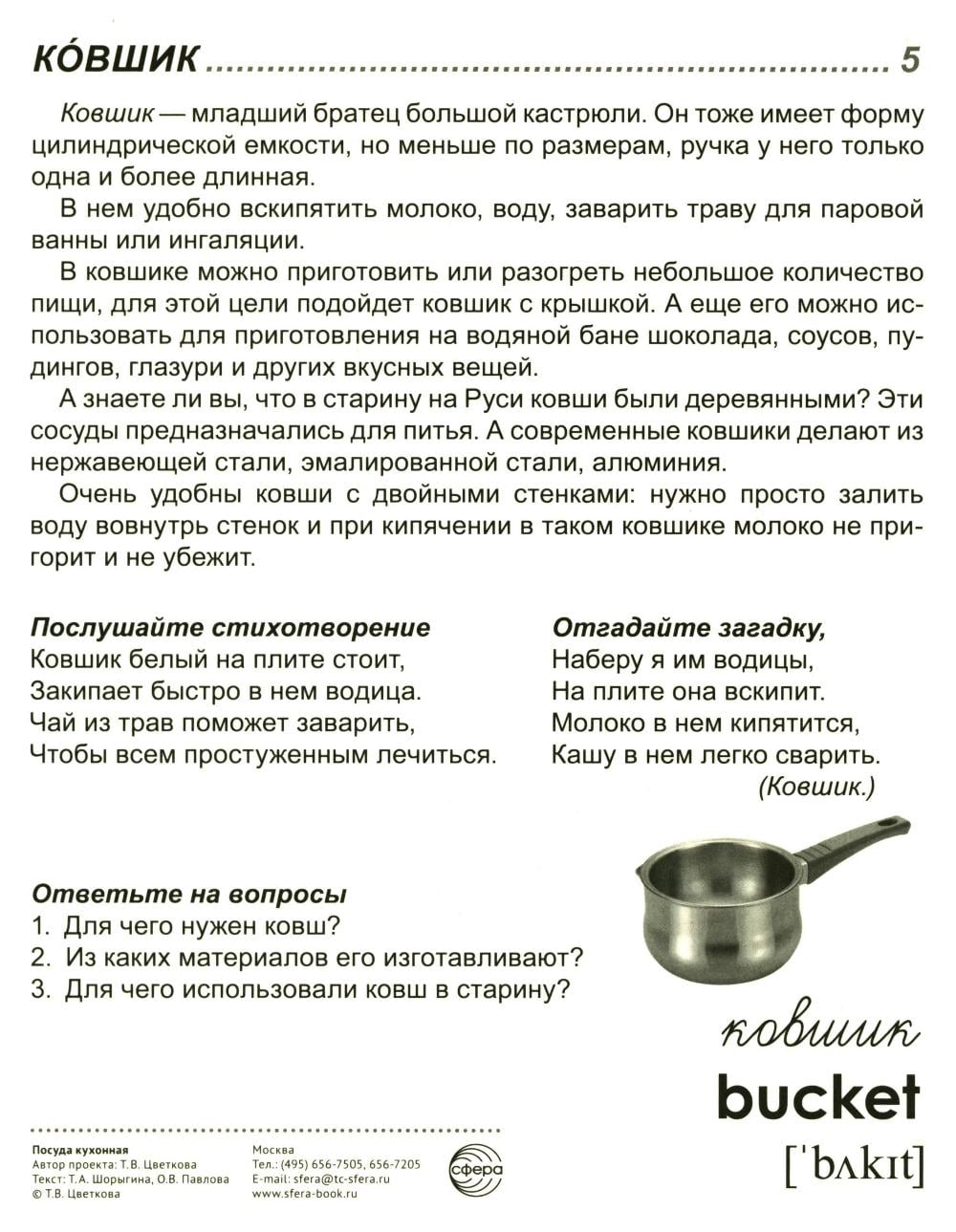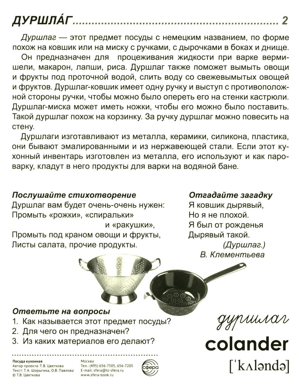 16 демонстрационных картинок размером 173х220 мм для познавательного и речевого развития. На обороте каждой предметной картинки - описание, стихотворение, загадка, вопросы для ребёнка, название на русском и английском языках. Список картинок: Посуда для приготовления пищи и напитков: казан, кастрюля, ковшик, противни, сковорода, сковорода мелкая, турка, чайник для плиты. Кухонные принадлежности: доски разделочные, дуршлаг, лопатки и венчик, ножи кухонные, половник и шумовка, скалка и молоток для отбивания, тёрки, штопор и консервный нож.| Издательство | Творческий центр Сфера |