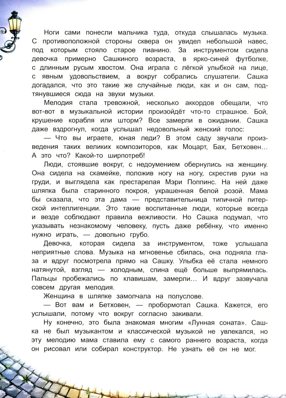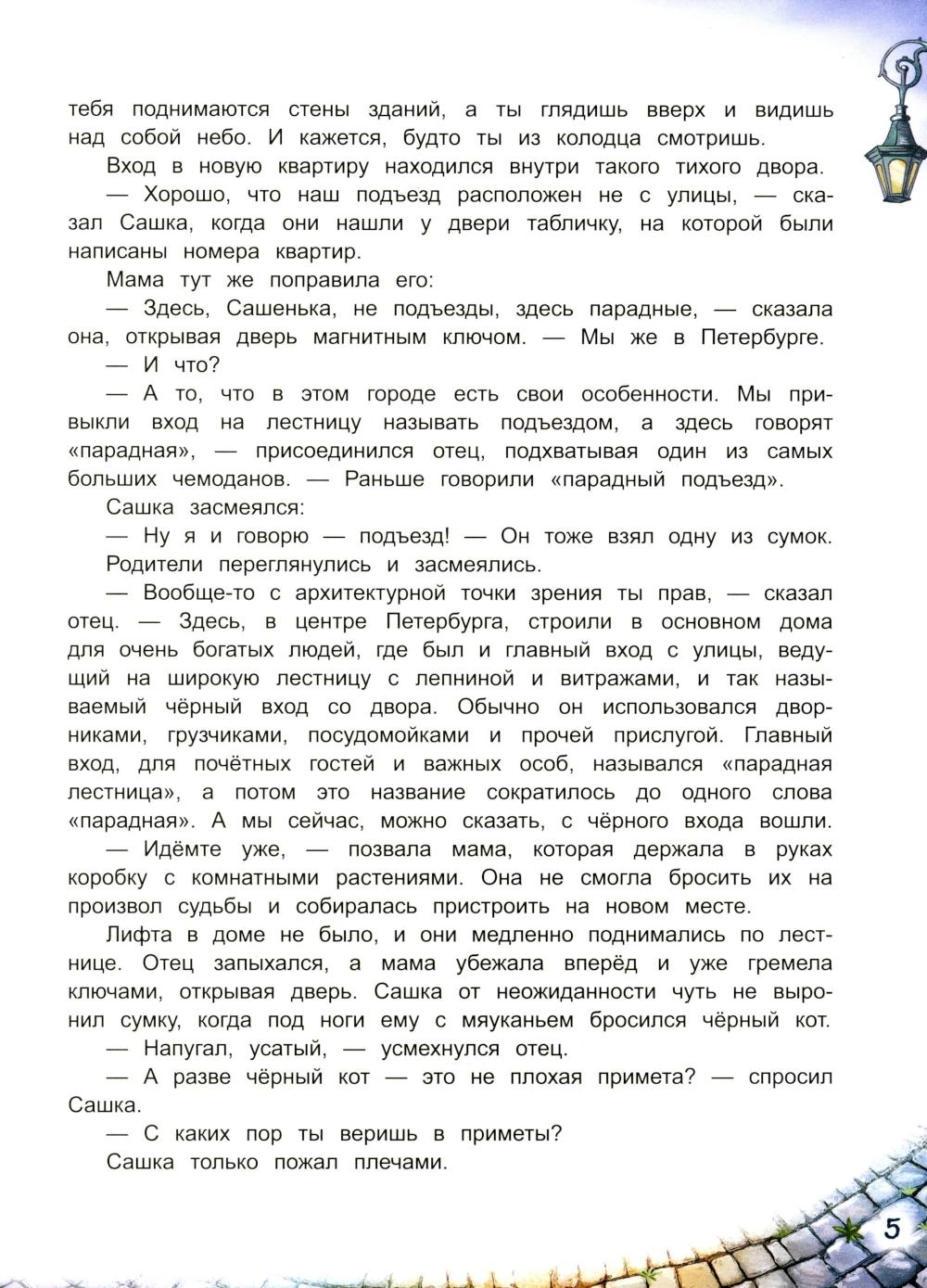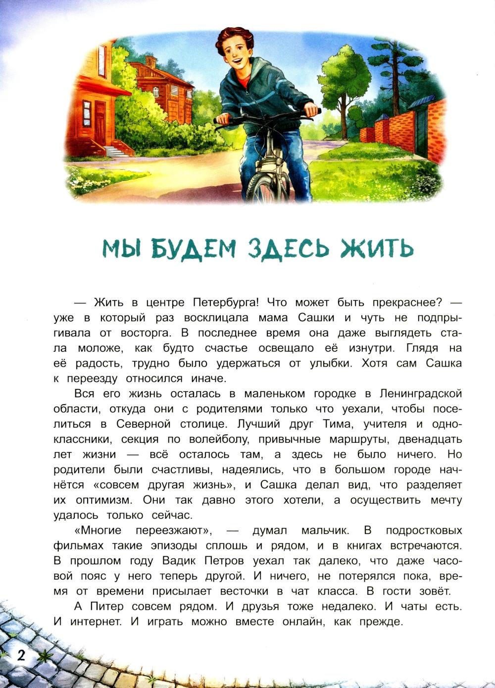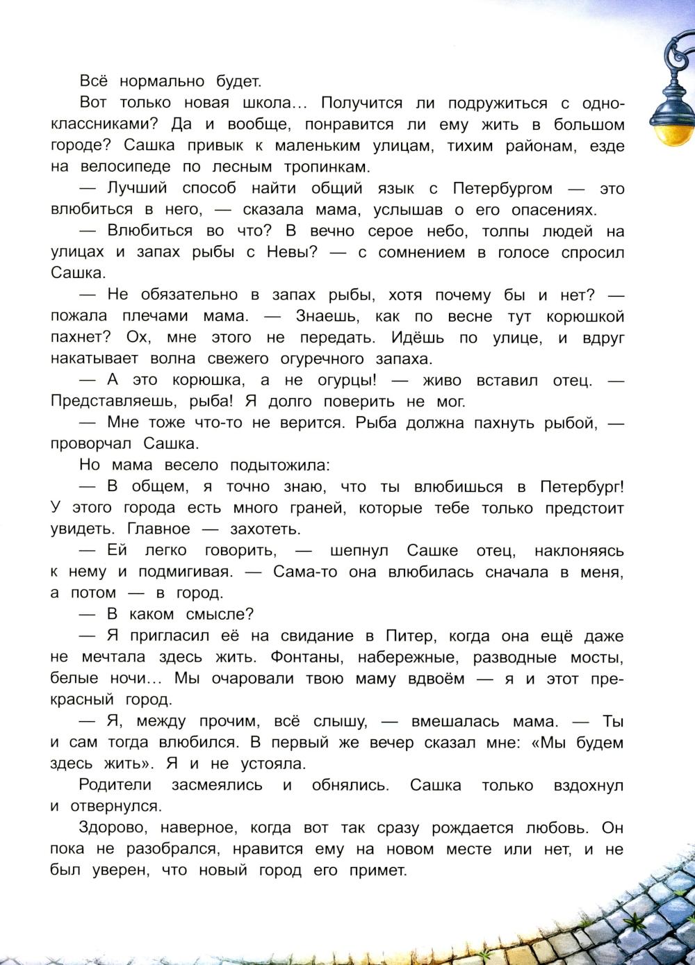 Сашка вместе с родителями переезжает в Санкт-Петербург, оставив друзей и привычную жизнь. Непросто начинать всё заново в незнакомом городе. Сашка отправляется исследовать окрестности нового дома, и тут начинаются приключения! Он откроет для себя дворы-колодцы, послушает музыку в необыкновенном саду, случайно обнаружит интересный и трогательный памятник, встретит настоящего писателя и узнает историю потерянной рукописи. А ещё сам найдёт кем-то забытую книгу - только вот, чтобы вернуть её хозяйке, придётся очень постараться...| Издательство | Антология |