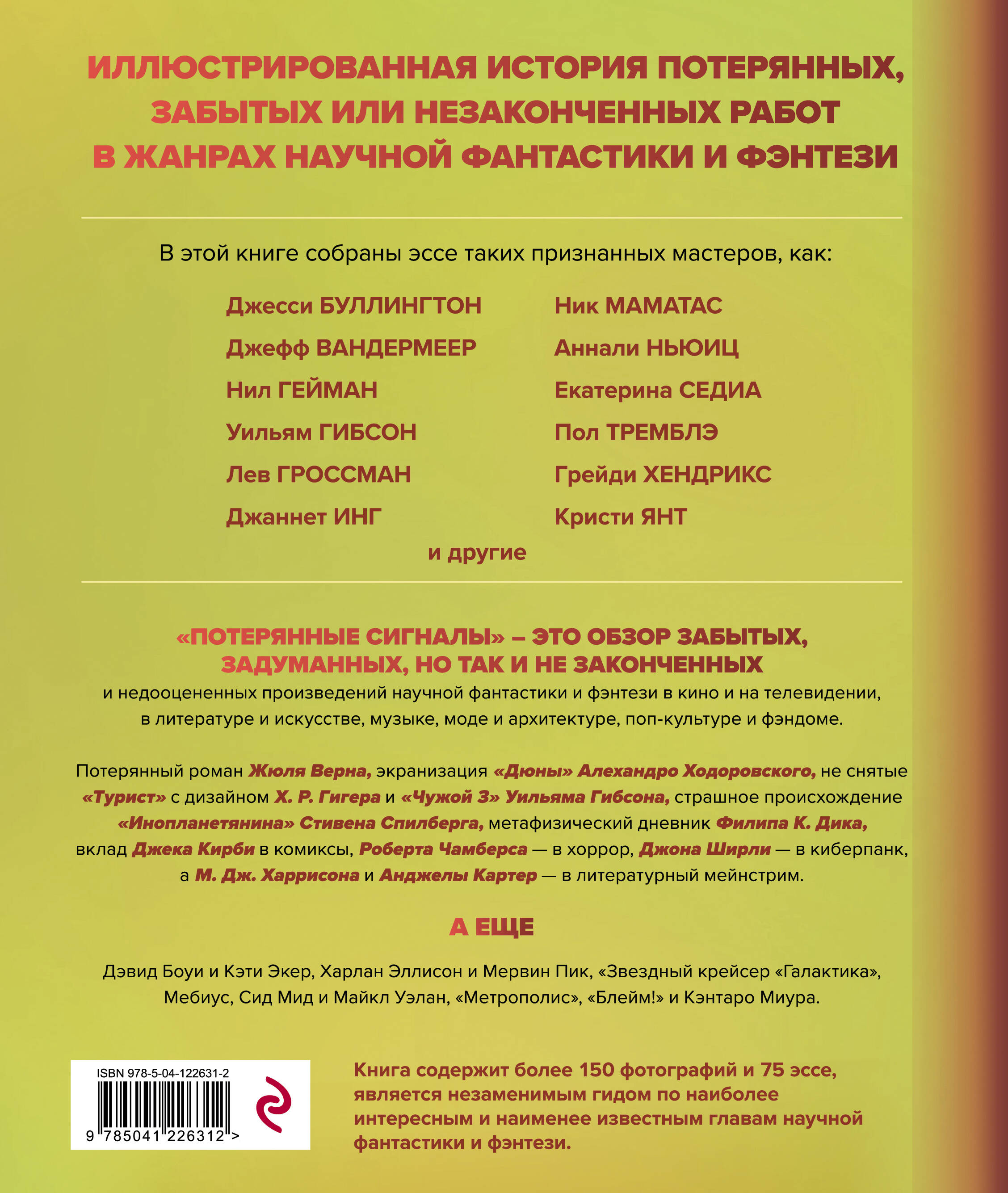 Финалист премии «Локус». ПОТЕРЯННЫЕ СИГНАЛЫ - ЭТО ОБЗОР ЗАБЫТЫХ, ВООБРАЖЕННЫХ, НО НИКОГДА НЕ ЗАКОНЧЕННЫХ и недооцененных произведений научной фантастики и фэнтези. Разделен на разделы о кино и телевидении, литературе, искусстве, музыке, моде, архитектуре, поп-культуре и фэндоме. В книге рассматривается потерянный роман Жюля Верна, экранизация «Дюны» Алехандро Ходоровского, не снятые «Турист» Х. Р. Гигера и «Чужой-3» Уильяма Гибсона, страшное происхождение «Инопланетянина» Спилберга, метафизический дневник Филипа К. Дика, вклад в комиксы Джека Кирби, Роберта Чамберса в хоррор, Джона Ширли в киберпанк, а Анджелы Картера и М. Дж. Харрисона в литературный мейнстрим. Дэвид Боуи и Кэти Экер, Харлан Эллисон и Мервин Пик, «Звездный крейсер «Галактика», Мебиус, Сид Мид и Майкл Уэлан, «Метрополис», «Блейм!» и Кэнтаро Миура. Книга содержит более 150 фотографий и 75 эссе, написанных Нилом Гейманом, Джеффом Вандермеером, Уильямом Гибсоном, Грейди Хендриксом и другими авторами. Артбук является незаменимым руководством по наиболее интересным и наименее известным главам научной фантастики и фэнтези. «Эта коллекция эссе расширит ваши горизонты и откроет вам чудеса, бурлящие под покровом массовых попсовых удовольствий, которыми мы все слишком часто ограничиваемся». - Washington Post «Моя единственная жалоба на книгу заключается в том, что она прочитана… Купите ее не только потому, что она прекрасна, но и чтобы авторы подготовили следующую». - The Houston Chronicle «Эта сокровищница секретов, представленная в щедро иллюстрированном томе, подобна вратам во внутреннее святилище научной фантастики». - Kirkus Reviews «...увлекательная иллюстрированная история научной фантастики и фэнтези». - TOR.com «Боскович заслуживает похвалы за редакторский выбор и за то, что она выполнила тяжелую работу по написанию 44 тщательно проработанных эссе». - Locus