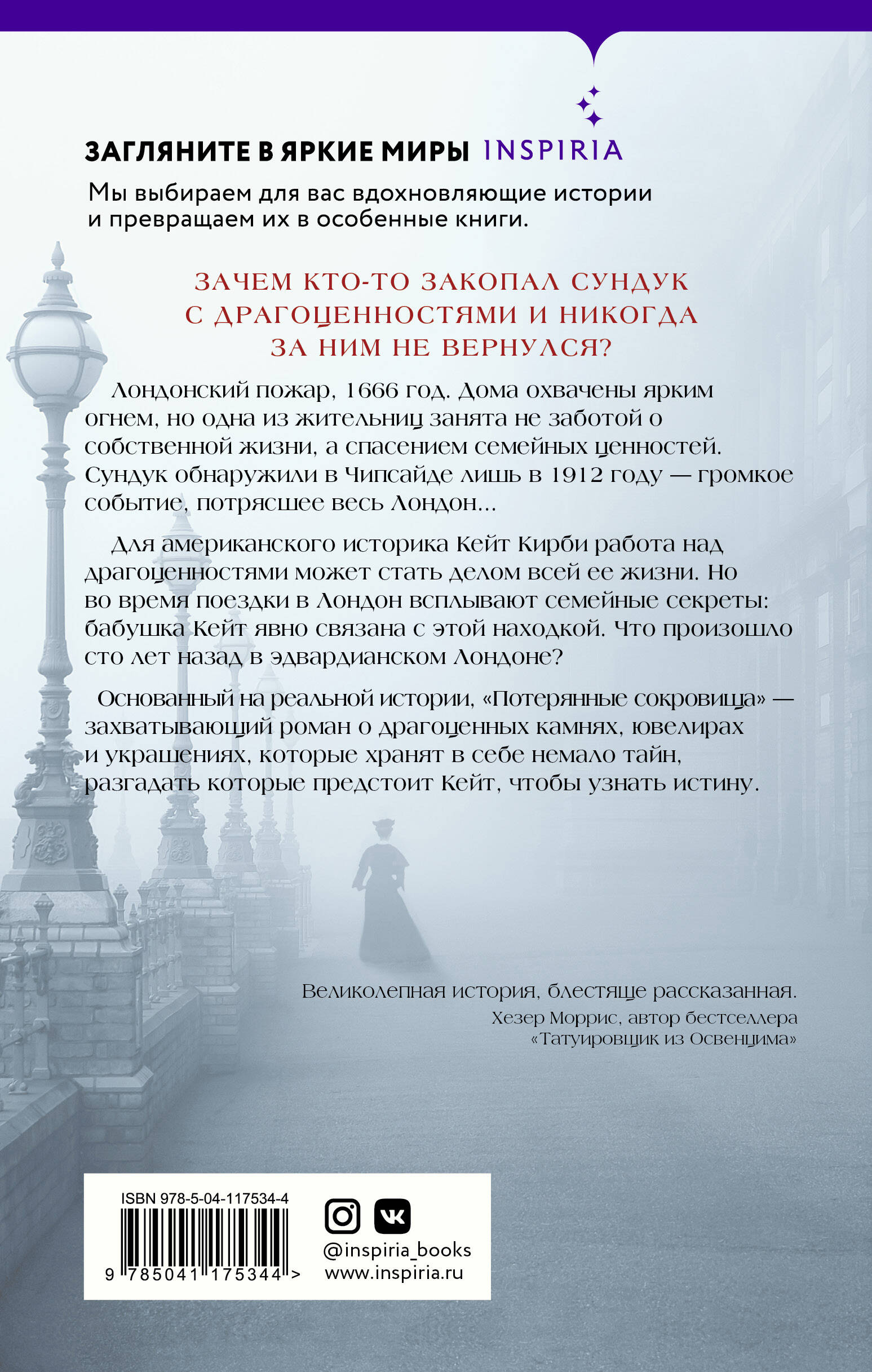 Лондонский пожар, 1666 год. Дома охвачены ярким огнем, но одна из жительниц занята не заботой о собственной жизни, а спасением семейных ценностей. Сундук обнаружили в Чипсайде лишь в 1912 году - громкое событие, потрясшее весь Лондон... Для американского историка Кейт Кирби работа над драгоценностями может стать делом всей ее жизни. Но во время поездки в Лондон всплывают семейные секреты: бабушка Кейт явно связана с этой находкой. Что произошло сто лет назад в эдвардианском Лондоне? Основано на реальной истории. «Потерянные сокровища» - захватывающий роман о драгоценных камнях, ювелирах и украшениях, которые хранят в себе немало тайн, разгадать которые предстоит Кейт, чтобы узнать истину.| Издательство | ООО "Издательство "Эксмо" |