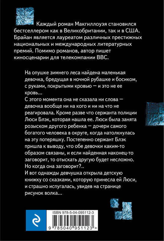 «Сейчас Макгиллоуэй - основная сила криминального жанра». - Джон Коннолли Каждый роман Макгиллоуэя становился бестселлером как в Великобритании, так и в США. Брайан является лауреатом различных престижных национальных и международных литературных премий. Помимо романов, автор пишет киносценарии для телекомпании BBC. На опушке зимнего леса найдена маленькая девочка, бредущая в ночной рубашке и босиком, с руками, покрытыми кровью - и это не ее кровь… С этого момента она не сказала ни слова - девочка вообще ни на кого и ни на что не реагировала. Кроме, разве что, сержанта полиции Люси Блэк, которая нашла ее. Люси была занята розыском другого ребенка - дочери самого богатого человека в округе, - когда натолкнулась на эту потеряшку. Постепенно сержант Блэк пришла к выводу, что обе девочки каким-то образом связаны, и если найденная наконец-то заговорит, то отыскать другую будет несложно. Но когда она заговорит?.. И вот однажды девчушка открыла детскую книжку со сказками, которую принесла ей Люси, и страшно испугалась, увидев на странице рисунок волка…| Издательство | ООО "Издательство "Эксмо" |