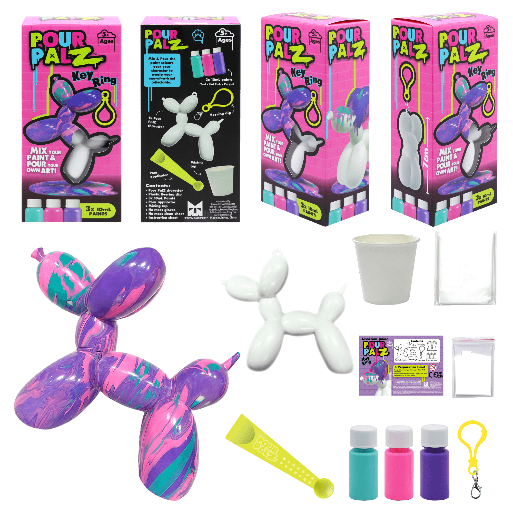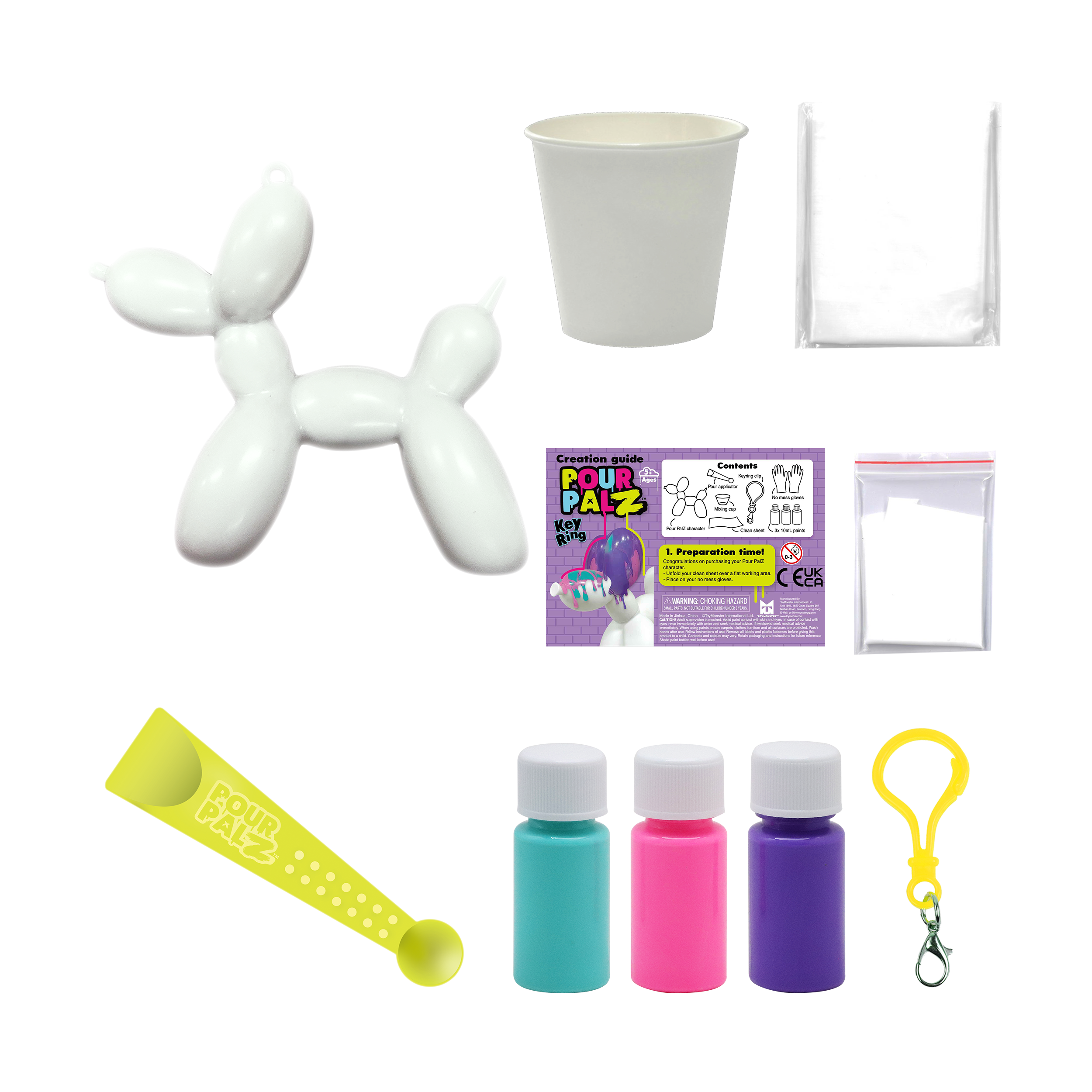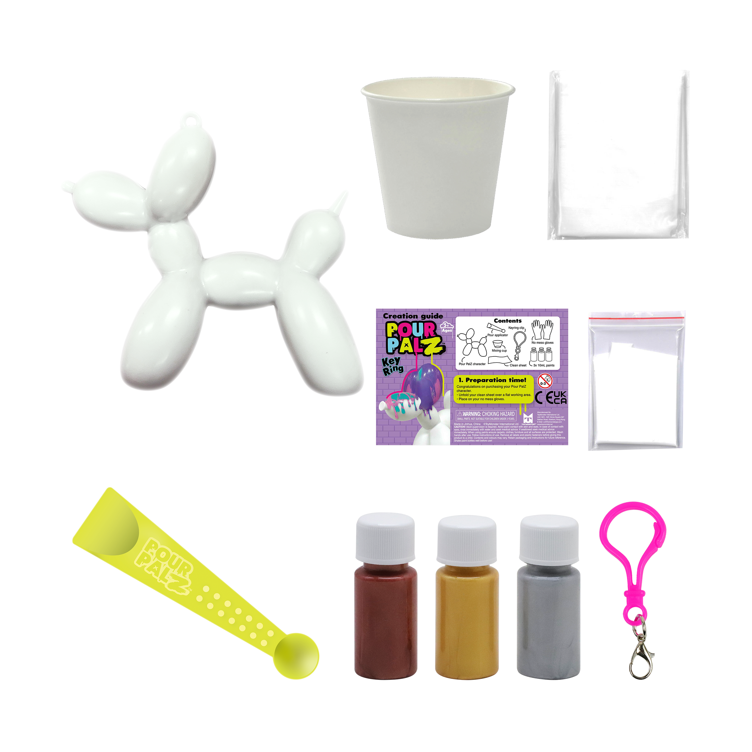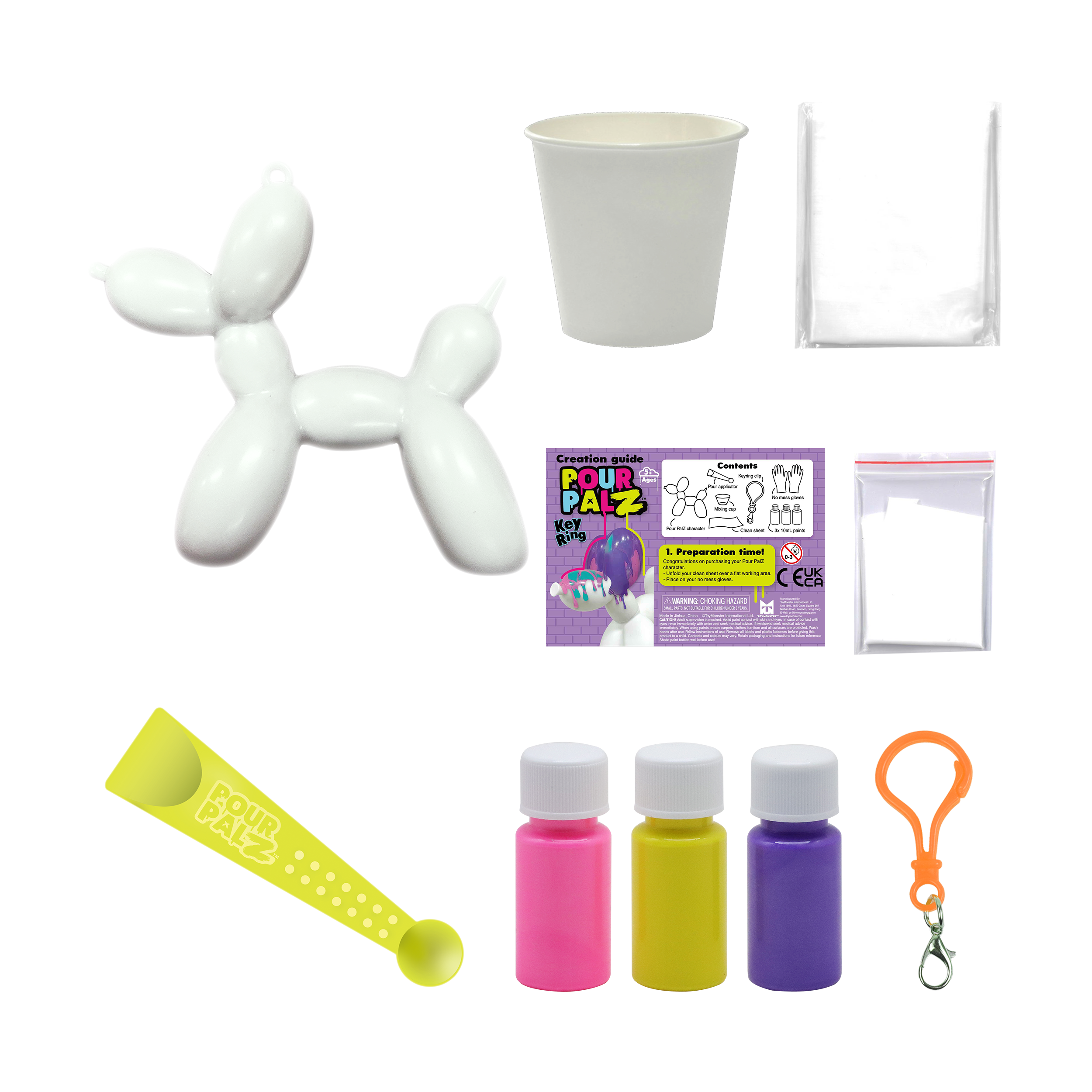 Представляем новый набор Pour Palz Paint «Щенок из воздушного шарика»! Приготовьтесь раскрыть свою креативность с этим веселым и простым набором для творчества своими руками! Смешивайте и наносите яркие краски на милую фигурку щенка из воздушного шарика, чтобы создать уникальный шедевр. Каждый раскрашенный щенок становится особенным, персонализированным сувениром, таким же уникальным, как и ваша фантазия. Соберите все 4 ярких цвета и дайте волю своему творчеству! Идеально подходит для художественного веселья, уникальных подарков или особого сувенира. В комплект входит пластиковый брелок, чтобы вы могли брать своего персонализированного щенка из воздушного шарика с собой куда угодно.