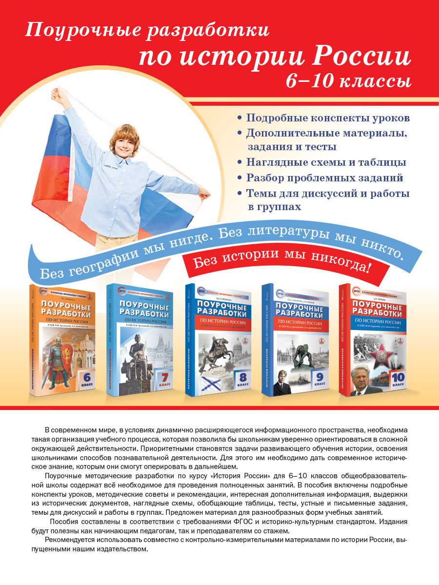 Пособие содержит подробные поурочные разработки к учебнику М.М. Горинова, А.А. Данилова и др. под ред. академика РАН А.В. Торкунова (М.: Просвещение). Создано в соответствии с требованиями ФГОС и Историко-культурным стандартом. Издание содержит материал, необходимый педагогу для проведения полноценных занятий: методические рекомендации, разнообразные документы, вопросы и задания для устных и письменных ответов обучающихся, темы для дискуссий и работы в группах, тесты, наглядные схемы, обобщающие и сравнительные таблицы.