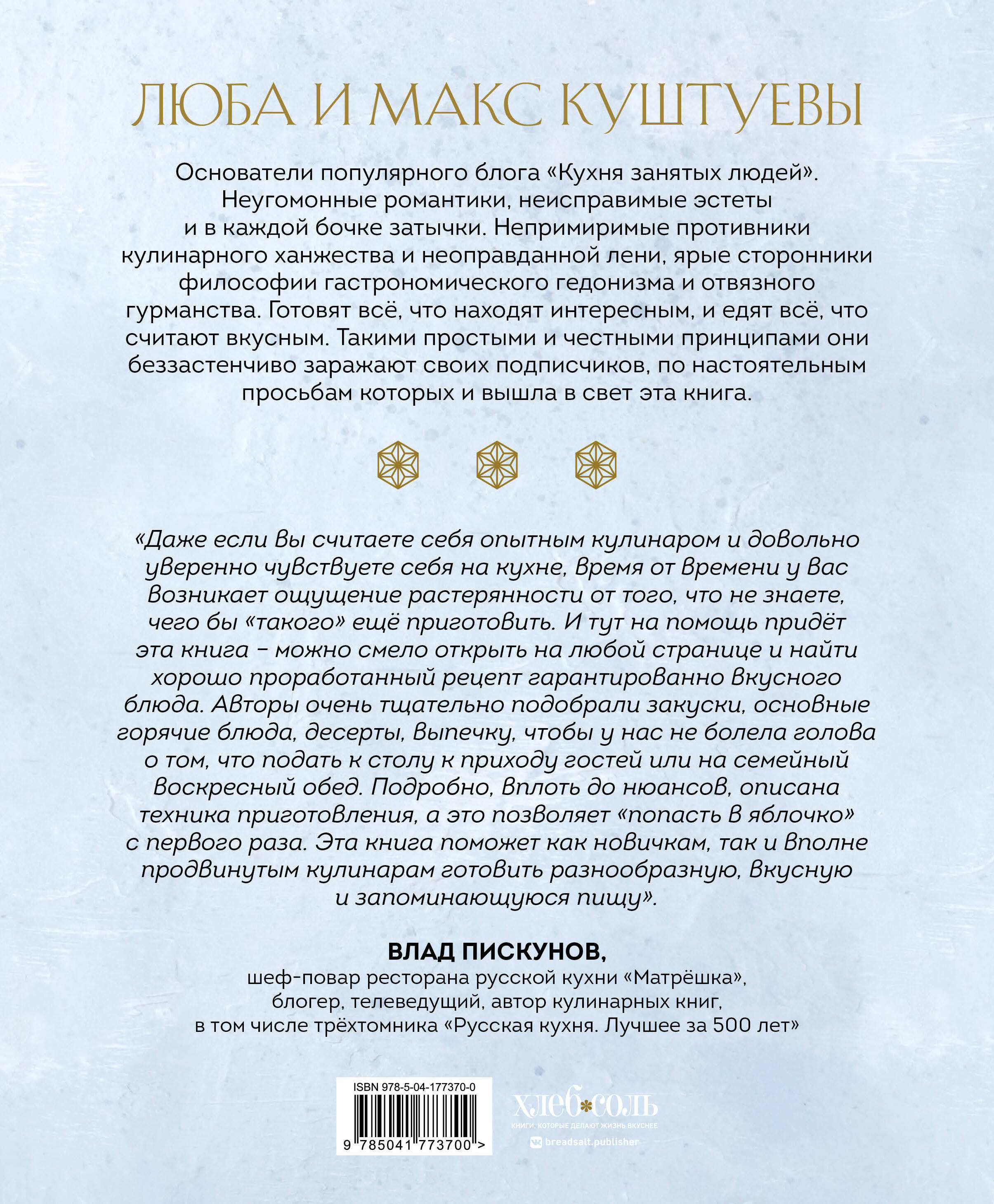 «Даже если вы считаете себя опытным кулинаром и довольно уверенно чувствуете себя на кухне, время от времени у вас возникает ощущение растерянности от того, что не знаете, чего бы «такого» ещё приготовить. И тут на помощь придёт эта книга - можно смело открыть на любой странице и найти хорошо проработанный рецепт гарантированно вкусного блюда. Авторы очень тщательно подобрали закуски, основные горячие блюда, десерты, выпечку, чтобы у нас не болела голова о том, что подать к столу к приходу гостей или на семейный воскресный обед. Подробно, вплоть до нюансов, описана техника приготовления, а это позволяет «попасть в яблочко» с первого раза. Эта книга поможет как новичкам, так и вполне продвинутым кулинарам готовить разнообразную, вкусную и запоминающуюся пищу». - Влад Пискунов, шеф-повар ресторана русской кухни «Матрёшка», блогер, телеведущий, автор кулинарных книг, в том числе трёхтомника «Русская кухня. Лучшее за 500 лет» Любовь и Максим Куштуевы - кулинарные писатели и далеко уже не начинающие блогеры, имеющие за своей широкой спиной более чем десятилетнюю историю вкусных приключений, чью страницу в соцсетях «Кухня занятых людей» любят, читают и комментируют более 100 тысяч пользователей. Рецепты в книге предназначены увлеченным гурманам или тем, кто хочет ими стать, кто ценит уникальный стиль, юмор и всё новое, даже если оно хорошо забытое старое. Представляем вам уже полюбившуюся читателям «Поваренную книгу гурмана» в новом подарочном оформлении.| Издательство | ООО "Издательство "Эксмо" |