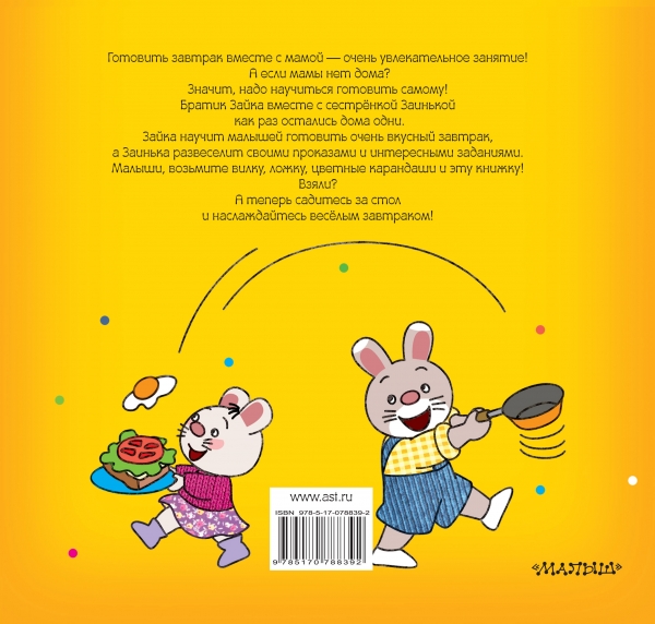 Развивающая книжка-игрушка для малышей о том, как быстро и вкусно приготовить завтрак. Поваренок Зайка расскажет малышам, как приготовить кашу и бутерброд, а его сестричка Заинька развеселит своими проказами и интересными заданиями. Малыши сами могут нарисовать в книжке, из чего можно сделать бутерброд и что они любят есть больше всего на свете, а их мамы по рисункам приготовят самый вкусный завтрак в мире для своих детей.