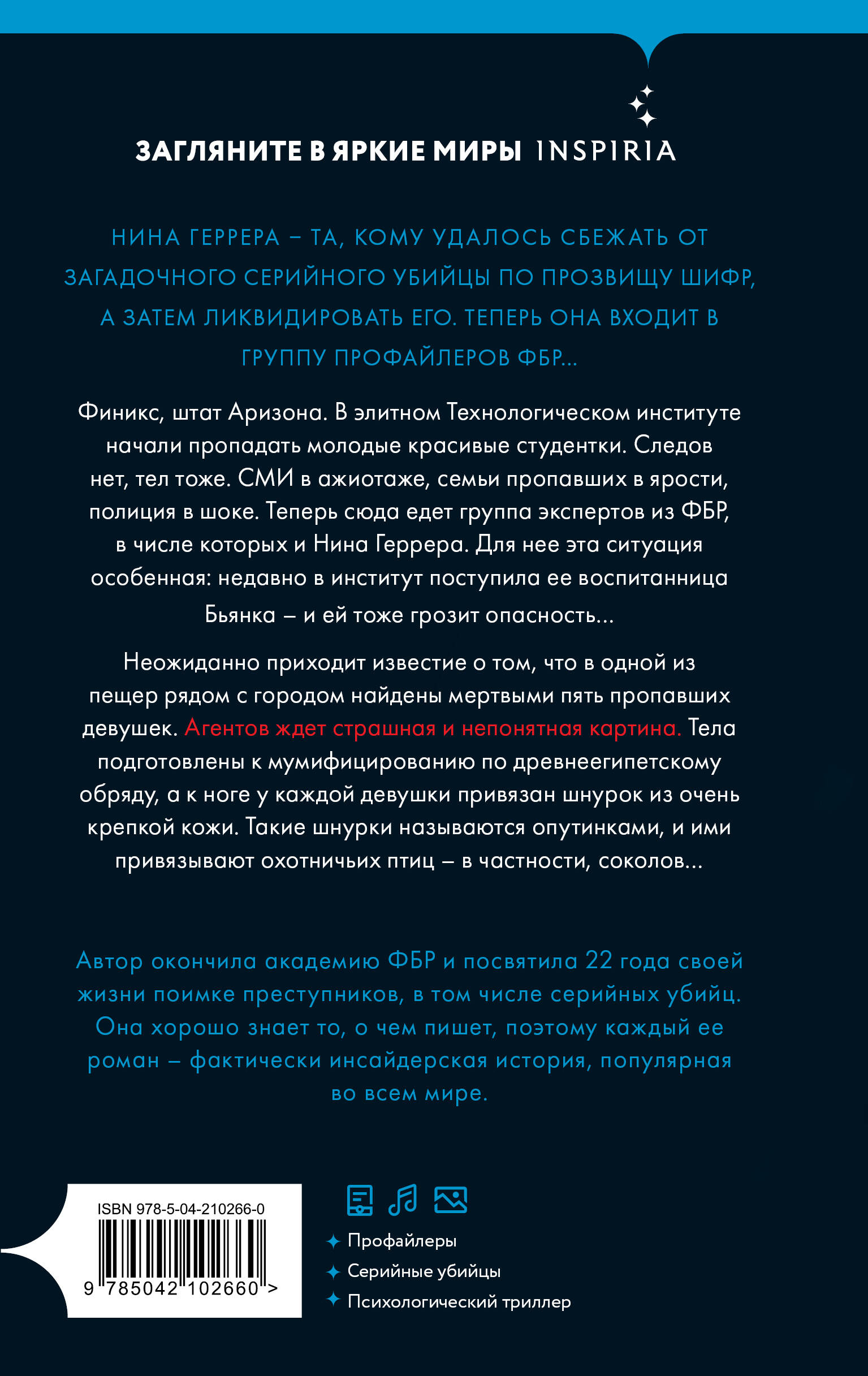 ПРОДОЛЖЕНИЕ БЕСТСЕЛЛЕРОВ «ШИФР» И «ВИСОКОСНЫЙ УБИЙЦА». Ее, как и дикую птицу, можно приручить. Но для этого обеих нужно поймать - и подавить… Нина Геррера - та, кому удалось сбежать от загадочного серийного убийцы по прозвищу Шифр, а затем ликвидировать его. Теперь она входит в группу профайлеров ФБР… Финикс, штат Аризона. В элитном Технологическом институте начали пропадать молодые красивые студентки. Следов нет, тел тоже. СМИ в ажиотаже, семьи пропавших в ярости, полиция в шоке. Теперь сюда едет группа экспертов из ФБР, в числе которых и Нина Геррера. Для нее эта ситуация особенная: недавно в институт поступила ее воспитанница Бьянка - и ей тоже грозит опасность… Неожиданно приходит известие о том, что в одной из пещер рядом с городом найдены мертвыми пять пропавших девушек. Агентов ждет страшная и непонятная картина. Тела подготовлены к мумифицированию по древнеегипетскому обряду, а к ноге у каждой девушки привязан шнурок из очень крепкой кожи. Такие шнурки называются опутинками, и ими привязывают охотничьих птиц - в частности, соколов… Автор окончила академию ФБР и посвятила 22 года своей жизни поимке преступников, в том числе серийных убийц. Она хорошо знает то, о чем пишет, поэтому каждый ее роман - фактически инсайдерская история, популярная во всем мире. ________________________________________________________________ «Изабелла Мальдонадо создает захватывающую и сложную историю, используя лаконичную и жесткую прозу, постепенно нагнетающую напряжение и интригу, в результате чего книга становится захватывающей и от нее невозможно оторваться». - Mystery & Suspense Magazine «Ужасающие преступления, динамичное расследование, яркие моменты озарений, невероятное напряжение». - Kirkus Reviews «Мальдонадо создала незабываемую героиню с уникальной способностью проникнуть в голову хищника. Вот каким должен быть триллер». - Хилари Дэвидсон «Великолепная и сложная героиня, чьи качества подчеркивает бескомпромиссный сюжет». - Стив Берри
