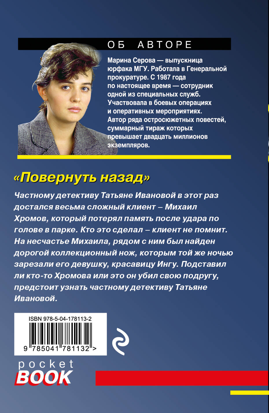 Марина Серова - феномен современного отечественного детективного жанра. Выпускница юрфака МГУ, работала в Генеральной прокуратуре. С 1987 года по настоящее время - сотрудник одной из специальных служб. Участвовала в боевых операциях и оперативных мероприятиях. Автор ряда остросюжетных повестей, суммарный тираж которых превышает двадцать миллионов экземпляров. Частному детективу Татьяне Ивановой в этот раз достался весьма сложный клиент - Михаил Хромов, который потерял память после удара по голове в парке. Кто это сделал - клиент не помнит. На несчастье Михаила, рядом с ним был найден дорогой коллекционный нож, которым той же ночью зарезали его девушку, красавицу Ингу. Подставил ли кто-то Хромова или это он убил свою подругу, предстоит узнать частному детективу Татьяне Ивановой.| Издательство | ООО "Издательство "Эксмо" |