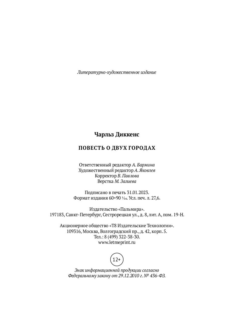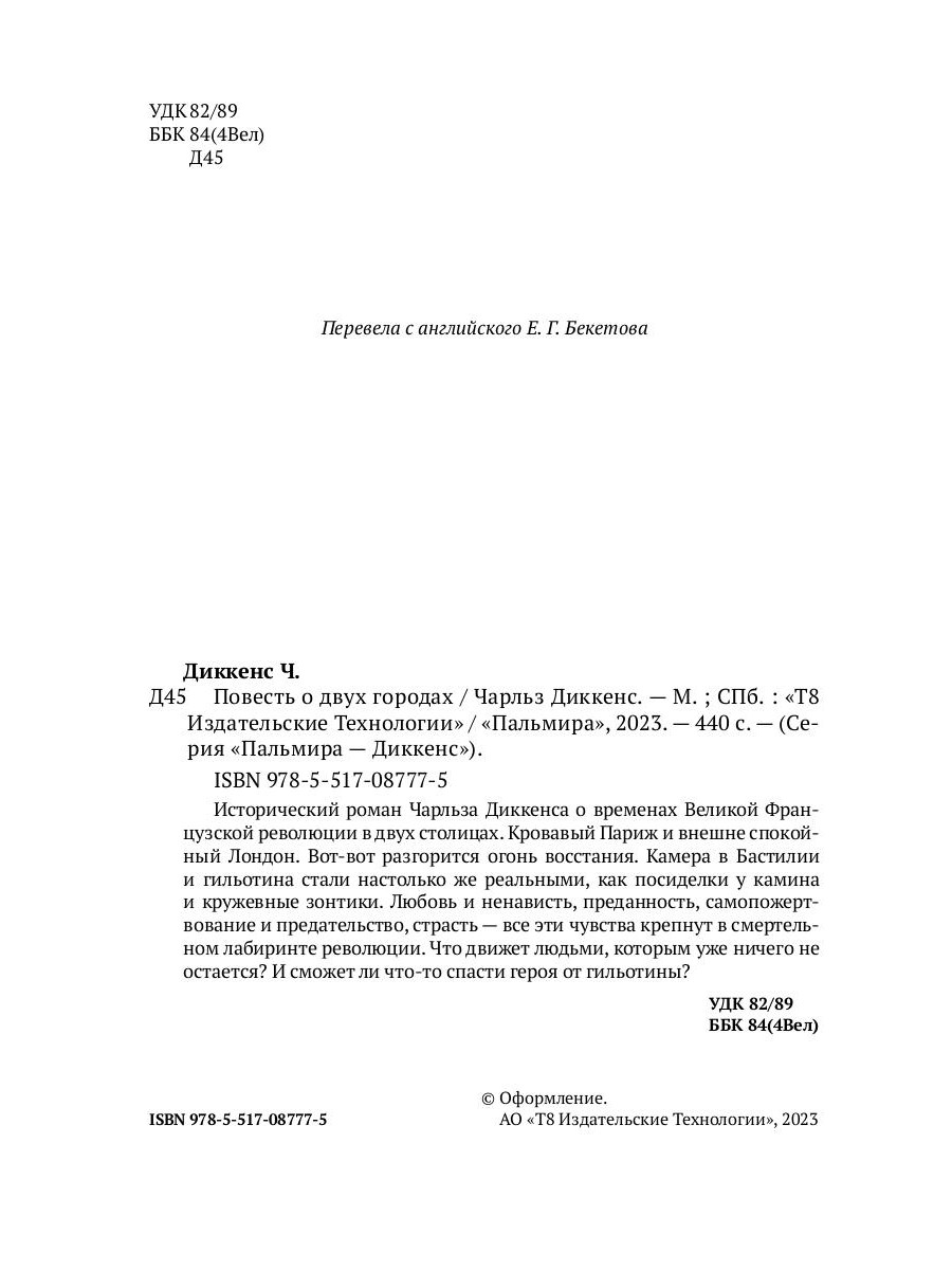 Исторический роман Чарльза Диккенса о временах Великой Французской революции в двух столицах. Кровавый Париж и внешне спокойный Лондон. Вот-вот разгорится огонь восстания. Камера в Бастилии и гильотина стали настолько же реальными, как посиделки у камина и кружевные зонтики. Любовь и ненависть, преданность, самопожертвование и предательство, страсть - все эти чувства крепнут в смертельном лабиринте революции. Что движет людьми, которым уже ничего не остается? И сможет ли что-то спасти героя от гильотины? "Повесть о двух городах" - один из самых популярных англоязычных романов в истории мировой литературы.