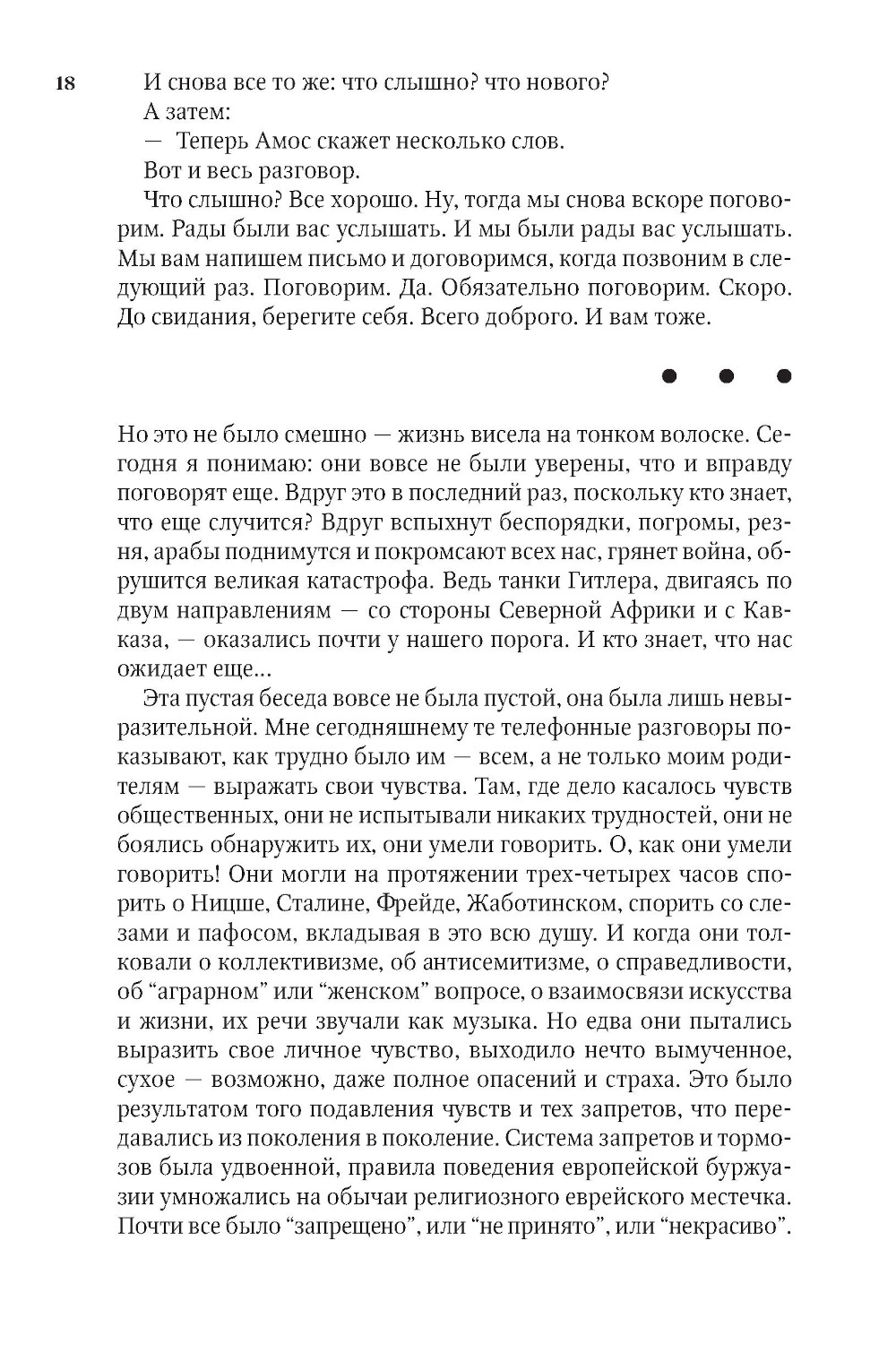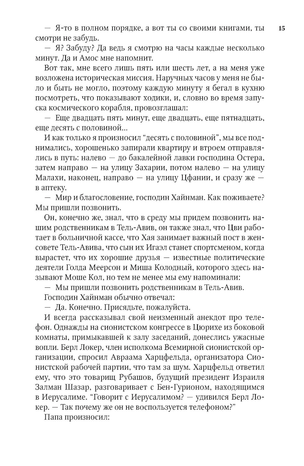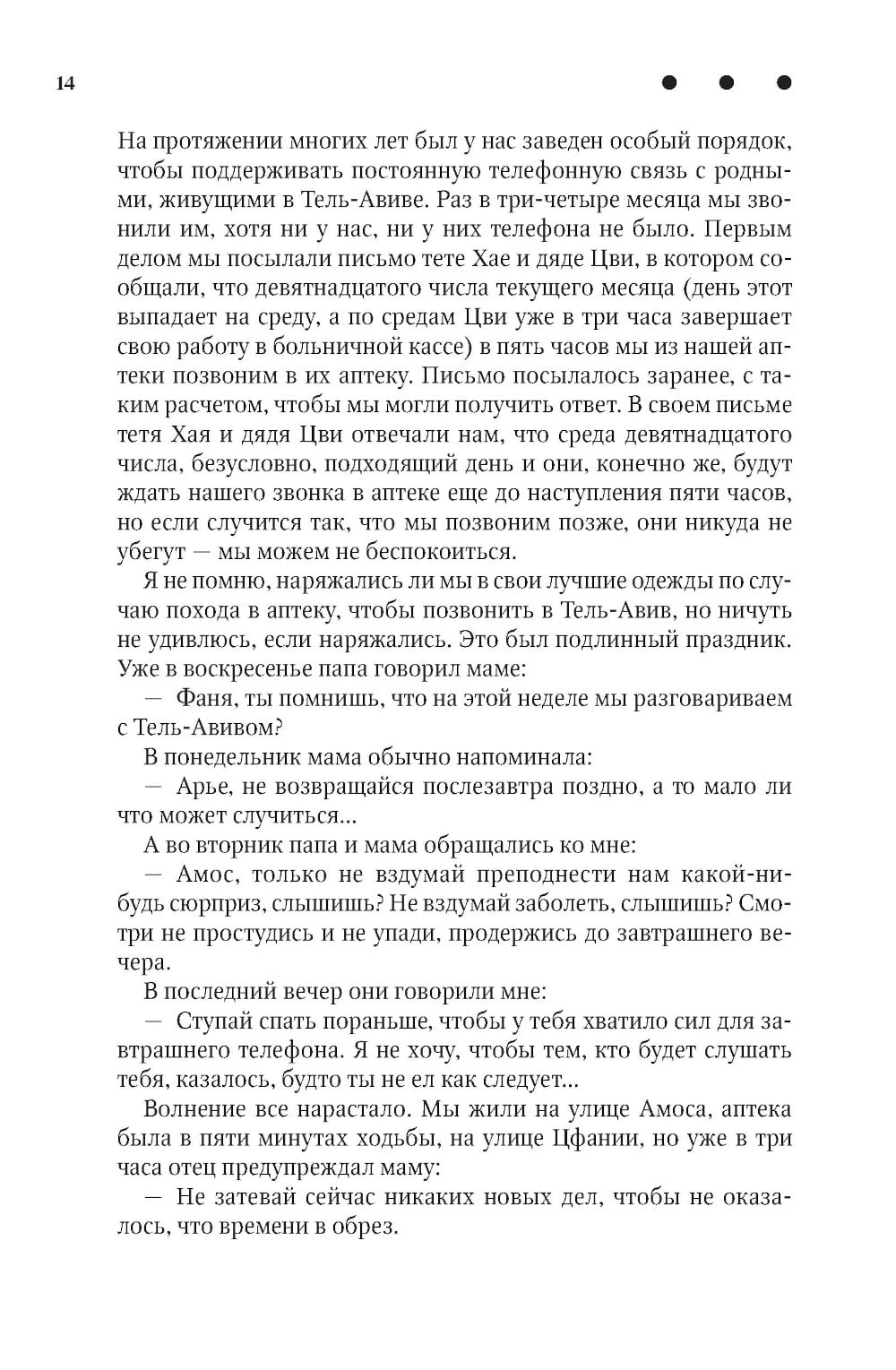 Роман-мемуар, самая личная книга классика израильской литературы. Семейная сага и автопортрет писателя, который был свидетелем рождения нации и бурной эпохи послевоенного времени. Это история взросления мальчика, который вырос в истерзанном войной Иерусалиме, в маленькой квартирке, забитой книгами на двенадцати языках, и которого окружали двенадцать родственников. Это история подростка, жизнь которого навсегда изменилась после смерти матери. Это история молодого человека, который сумел вырваться из удушливого мира семьи, влиться в неведомый новый мир, изменить свое имя. Это история известного писателя, который становится активным участником политической жизни своей страны. Очень теплая книга, где есть и юмористические сюжеты, и очень серьезные рассуждения о добре и зле, о месте человека в новом, формирующемся мире, о семье, родителях, о войне, о противостоянии с народом-соседом. Амос Оз, став уже знаменитым писателем, смотрит на свое детство, где было больше бед и лишений, чем радости, и видит там лишь тепло и любовь.| Издательство | Фантом Пресс |
