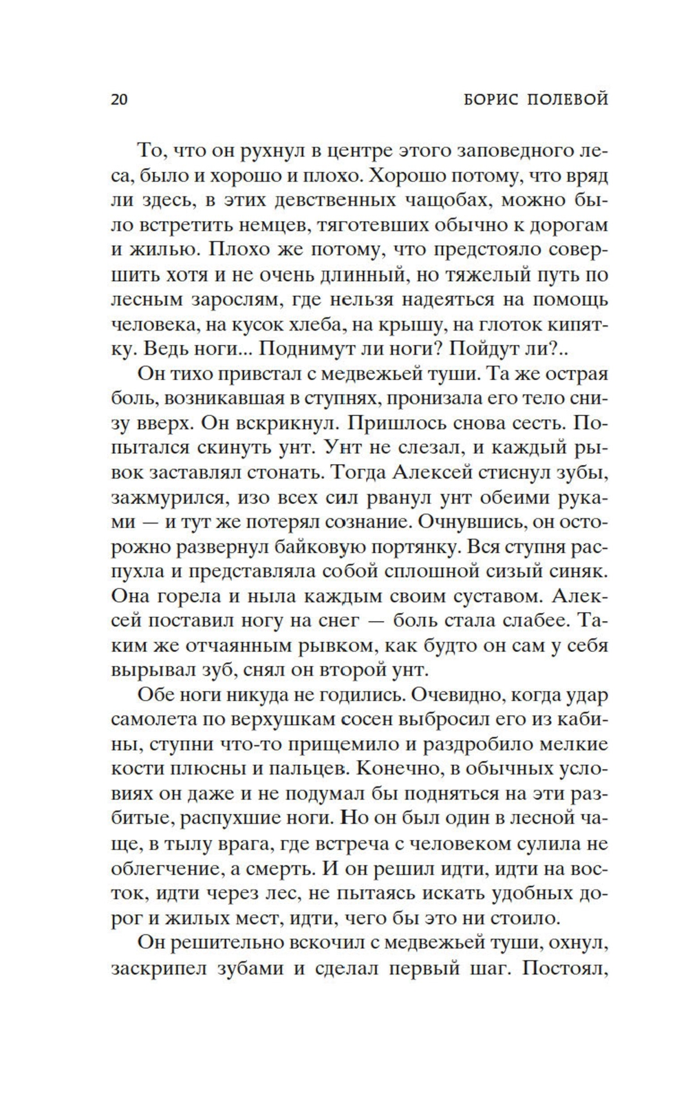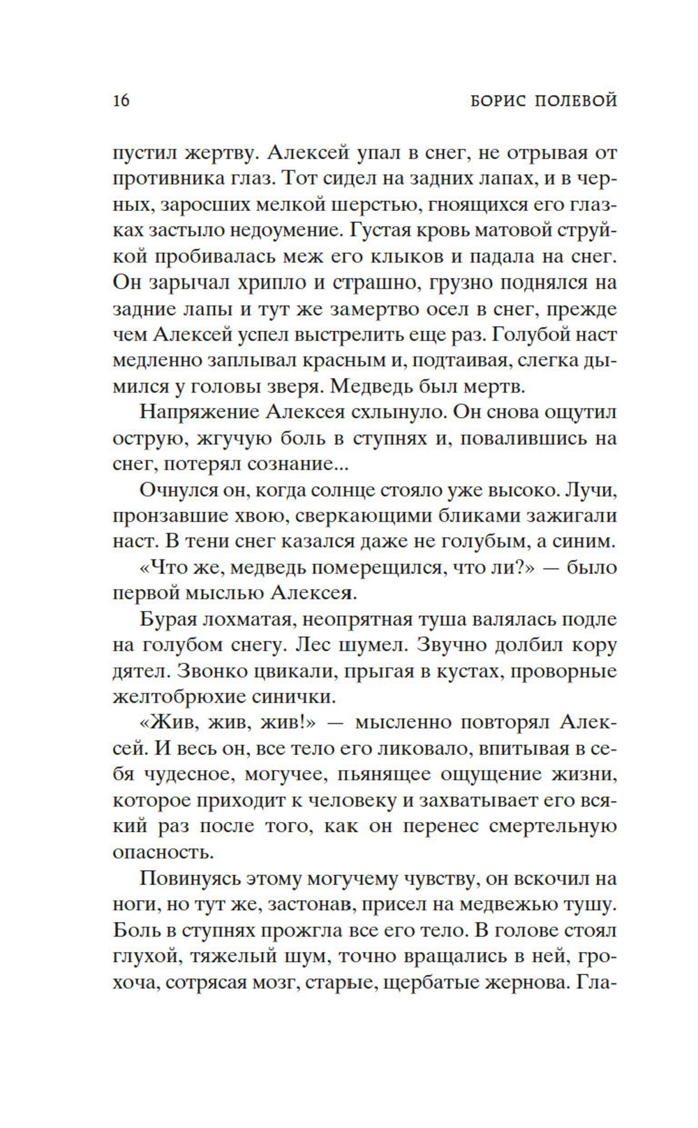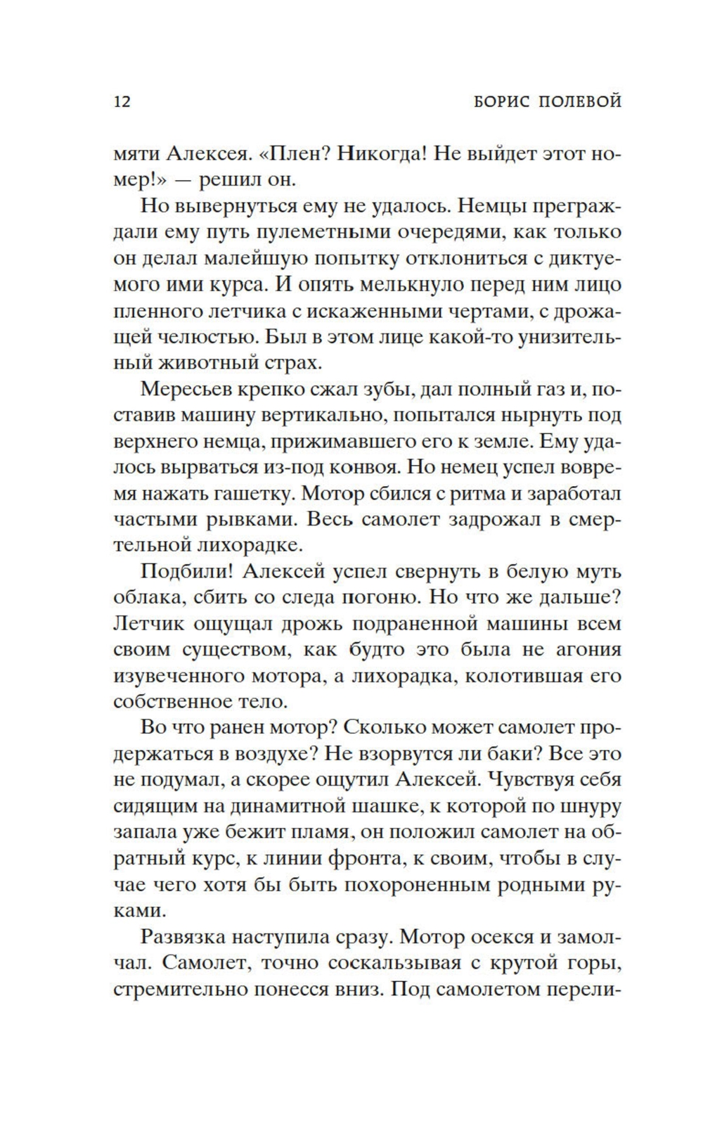 Борис Николаевич Полевой (1908-1981) - известный советский прозаик, сценарист и журналист, автор легендарной «Повести о настоящем человеке». В основу книги положена удивительная судьба советского летчика-аса Алексея Петровича Маресьева, жизнь которого стала примером мужества, несгибаемой воли и стойкости. Как корреспондент газеты «Правда» Полевой прошел Великую Отечественную войну и собрал огромный фактический материал. Встреча с прославленным летчиком произошла в августе 1943 года, и его рассказ писатель занес в «Дневник полета 3-й эскадрильи». Спустя три года Полевой вернулся к своему «Дневнику» и всего за несколько недель создал книгу о подвиге безногого летчика. «Повесть о настоящем человеке» вышла в 1946 году и принесла автору общенародную любовь, а также была отмечена Государственной премией СССР. По повести была поставлена одноименная опера Сергея Прокофьева, снят художественный фильм, книга выдержала десятки переизданий и была переведена на многие языки.| Издательство | Азбука |