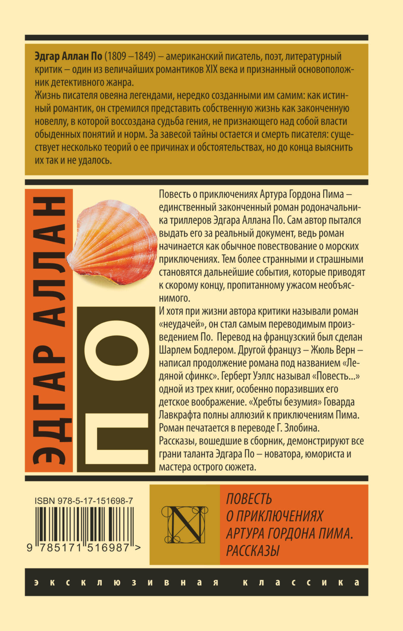 Повесть о приключениях Артура Гордона Пима - единственный законченный роман родоначальника триллеров Эдгара Алана По. Сам автор пытался выдать его за реальный документ, ведь роман начинается как обычное повествование о морских приключениях. Тем более странными и страшными становятся дальнейшие события, которые приводят к скорому концу, пропитанному ужасом необъяснимого. И хотя при жизни автора критики называли роман "неудачей", он стал самым переводимым произведением По. Перевод на французский был сделан Шарлем Бодлером. Другой француз - Жюль Верн - написал продолжение романа под названием "Ледяной сфинкс". Герберт Уэллс называл "Повесть..." одной из трех книг, особенно поразивших его детское воображение. "Хребты безумия" Говарда Лавкрафта полны аллюзий к приключениям Пима. Роман печатается в переводе Г. Злобина. Рассказы, вошедшие в сборник, демонстрируют все грани таланта Эдгара По - новатора, юмориста и мастера острого сюжета.| Издательство | ИЗДАТЕЛЬСТВО "АСТ" |