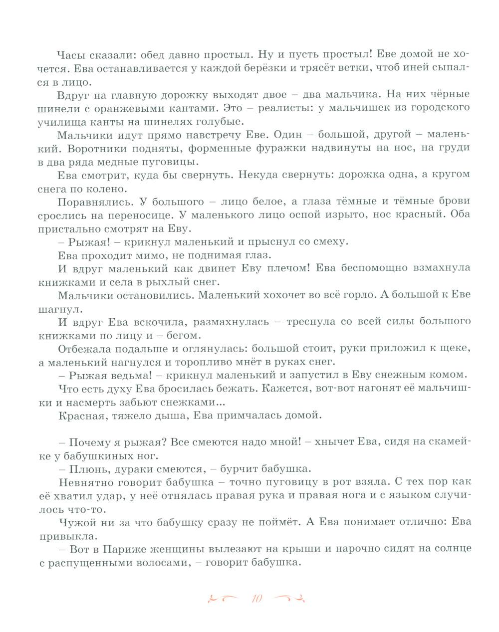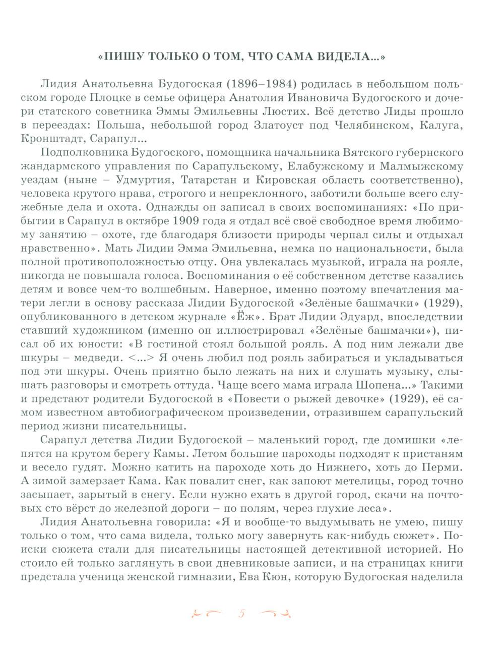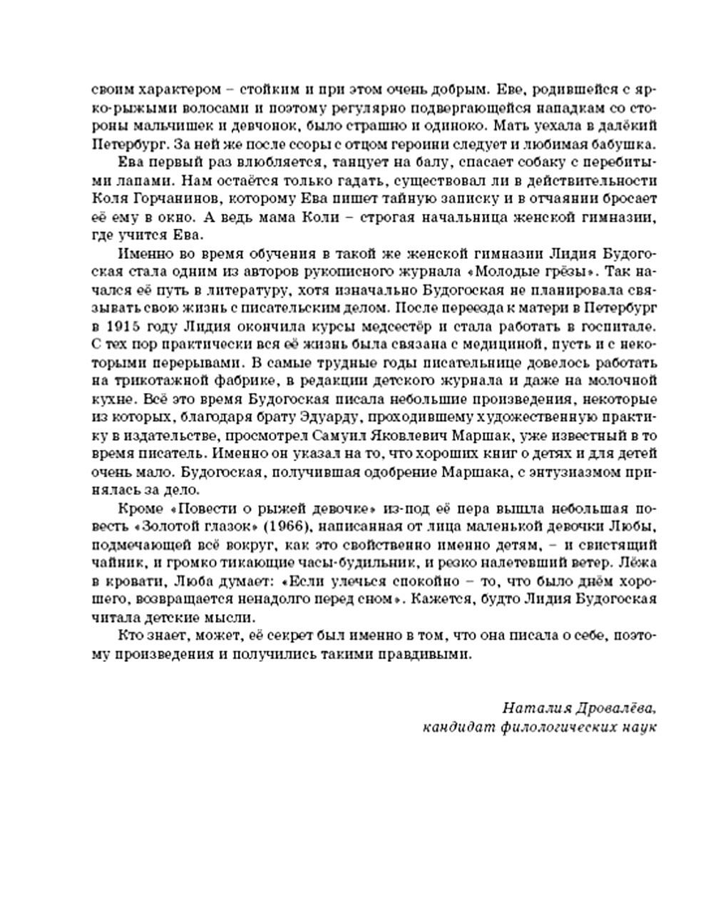 «Повесть о рыжей девочке» - самая известная книга детской писательницы Лидии Будогоской. Будогоская честно и без прикрас рассказывает о своём непростом детстве в провинциальном городке дореволюционной России. Над главной героиней повести, Евой Кюн, смеются из-за её внешности. Строгий отец следит за каждым шагом и ругает за малейшую оплошность. Однако Ева, несмотря на все трудности, наслаждается девичьими радостями: прогулками с подругой, первым балом и первой влюблённостью. Образ решительной и сильной духом героини привлекает своей искренностью, а повесть, написанная почти сто лет назад, до сих пор не теряет актуальности.| Издательство | Махаон |