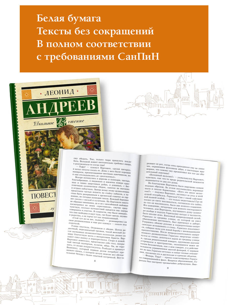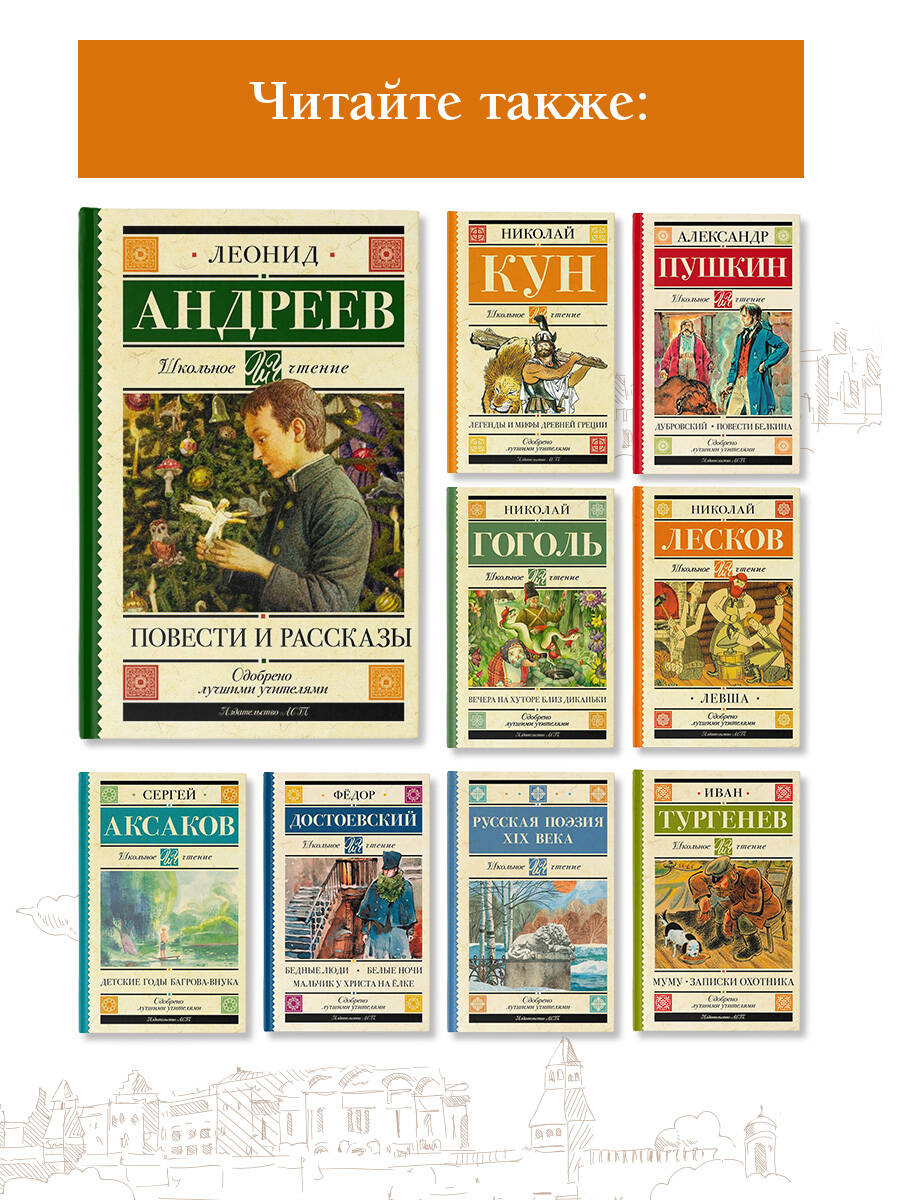 Леонид Николаевич Андреев (1871-1919) - русский писатель, представитель Серебряного века русской литературы. Рассказ «Баргамот и Гараська» (1898) - литературный дебют Андреева. Именно после публикации этого произведения на писателя обратил внимание Максим Горький. А спустя несколько месяцев Горький попросил молодого писателя выслать «хороший рассказ» для популярного литературного журнала. Так в свет вышел рассказ Л. Андреева «Петька на даче» (1899). Тяжелая жизнь маленького Петьки, помощника парикмахера, невероятным образом изменилась, когда он попал на господскую дачу в Царицыно. Грубиян и хулиган Сашка - герой рассказа «Ангелочек» (1899) преображается, увидев на Рождественской ёлке восковую фигурку ангела. Позже, впечатлённый этим рассказом, А. Блок напишет стихотворение «Сусальный ангел». Рассказ «Кусака» (1901) - история одинокой, живущей на улице собаки. В своей жизни она встречала лишь злых и жестоких людей. Страх и злоба надолго вселились в сердце животного. Проза Андреева пронзительная и тревожная. Она поражает, заставляет задумываться, делает каждого человека немного другим. В книгу также вошли две повести писателя «Жизнь Василия Фивейского» (1903) и «Иуда Искариот» (1907).