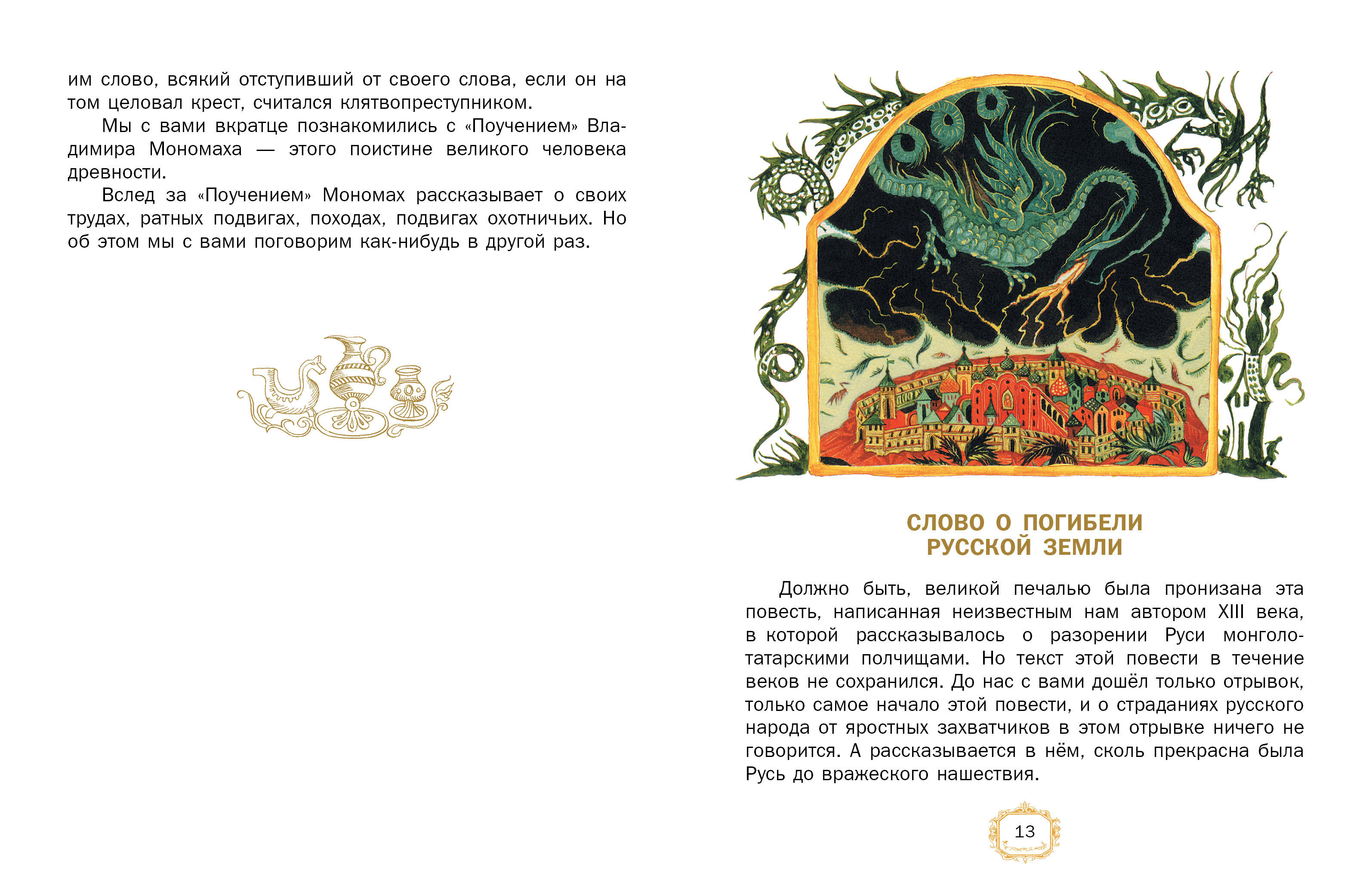 «Повести земли русской» - это сборник самых популярных и любимых на Руси произведений: «Поучение» Владимира Мономаха, «Задонщина», «Моление» Даниила Заточника, «Легенда о граде Китеже», «Сказание о Соломоне и Китоврасе» и другие. Современному читателю понять их было бы сложно, так как все они написаны на древнерусском языке. Поэтому все повести в книге пересказала для детей знаменитая писательница, лауреат Государственной премии РФ Ирина Токмакова. А великолепные иллюстрации нарисовал заслуженный художник РФ Георгий Юдин. Книга станет отличным помощником при подготовке к урокам литературы и истории.| Издательство | Издательство "АСТ" |