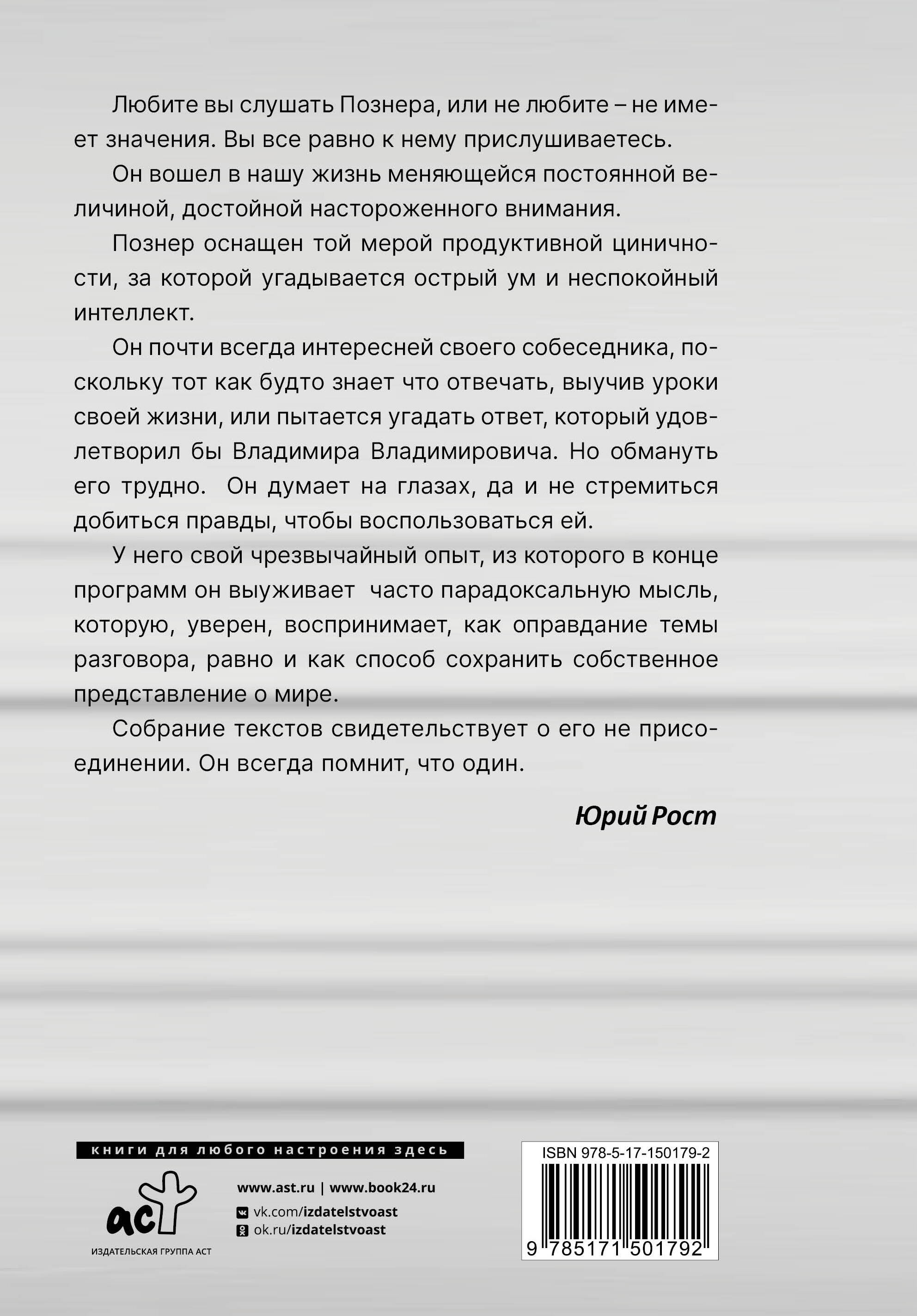 Масштаб фигуры Владимира Познера в мире журналистики определяют 60 лет плодотворной работы на телевидении и радиовещании. Кто не знает Владимира Познера? Вопрос риторический! Еженедельная авторская телепередача «Познер» впервые вышла в эфир на Первом канале в 2008 году и просуществовала долгих 14 лет. Книга «Повод для оптимизма? Прощалки» - это сборник комментариев, которыми завершался каждый выпуск легендарной программы. В книге заинтересованный читатель найдет блестящие рассуждения об актуальных проблемах современности, которые затрагивают нашу повседневную жизнь, определяют вектор ее развития и заставляют задуматься над возможными сценариями будущего.| Издательство | АСТ |
