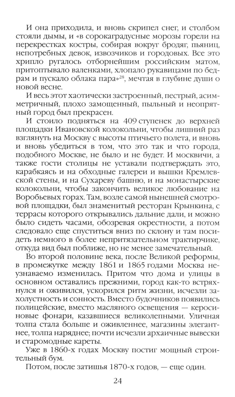 На основе дотошного изучения и обобщения обширных архивных документов, воспоминаний и дневников московских старожилов, трудов историков, записок и сочинений писателей, журналистов и путешественников, как отечественных, так и зарубежных, автору удалось воссоздать многомерную и захватывающую панораму Москвы, сложившуюся после великого пожара 1812 года. Из книги можно узнать о городском хозяйстве и властях - от будочника до генерал-губернатора, о семейных торжествах царствующего дома, религиозных традициях, театральных и ярмарочных действах, студенческих пирушках и волнениях, спорте.| Издательство | Молодая гвардия |