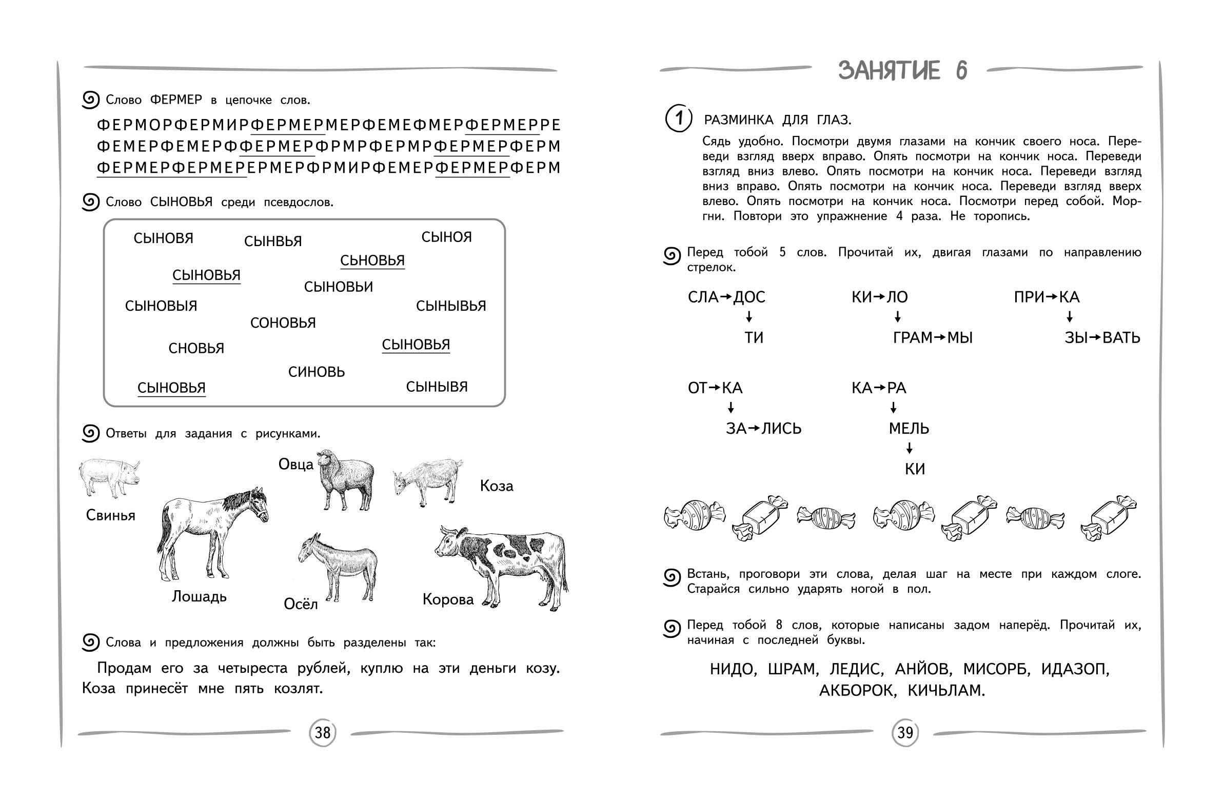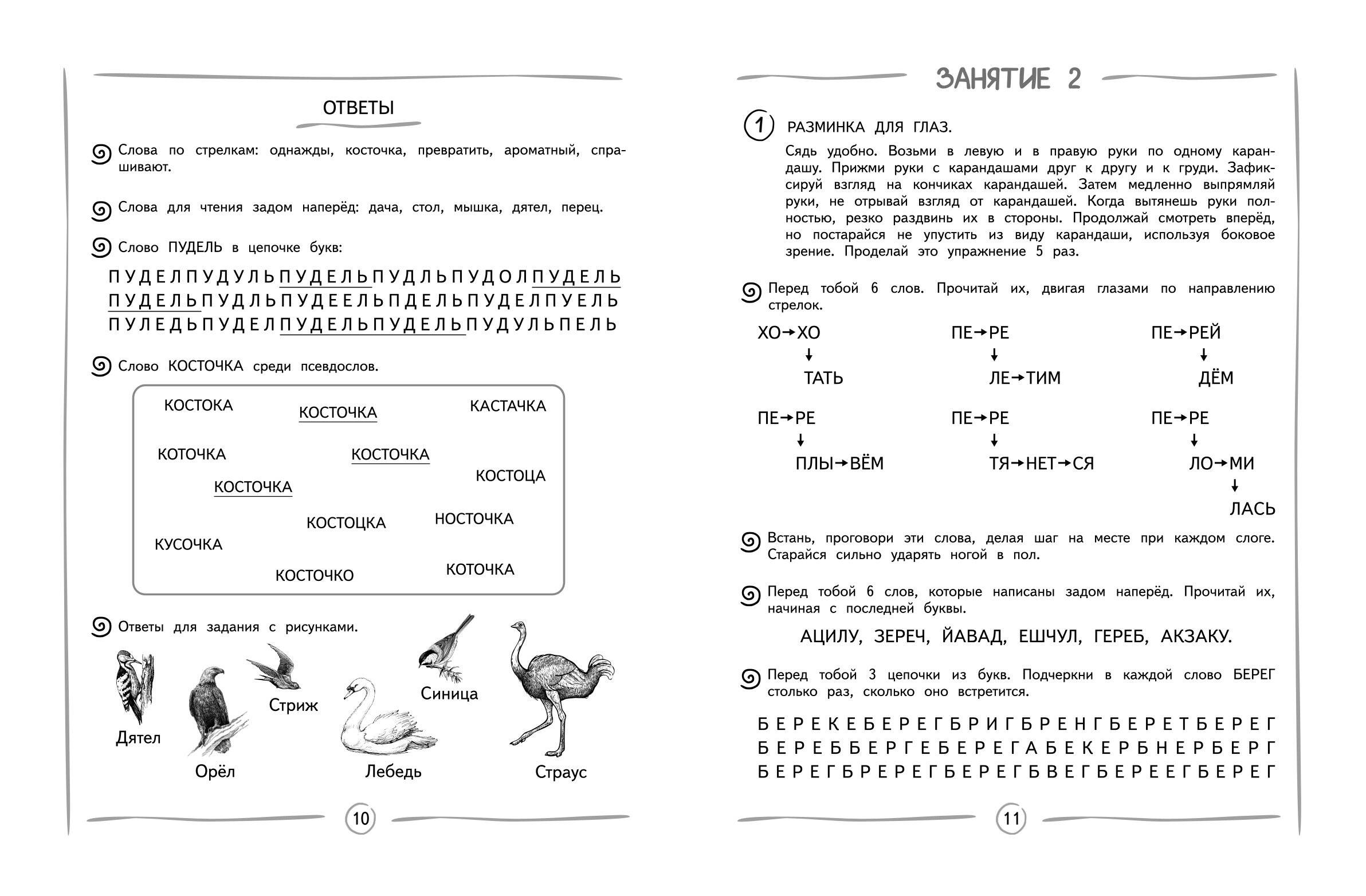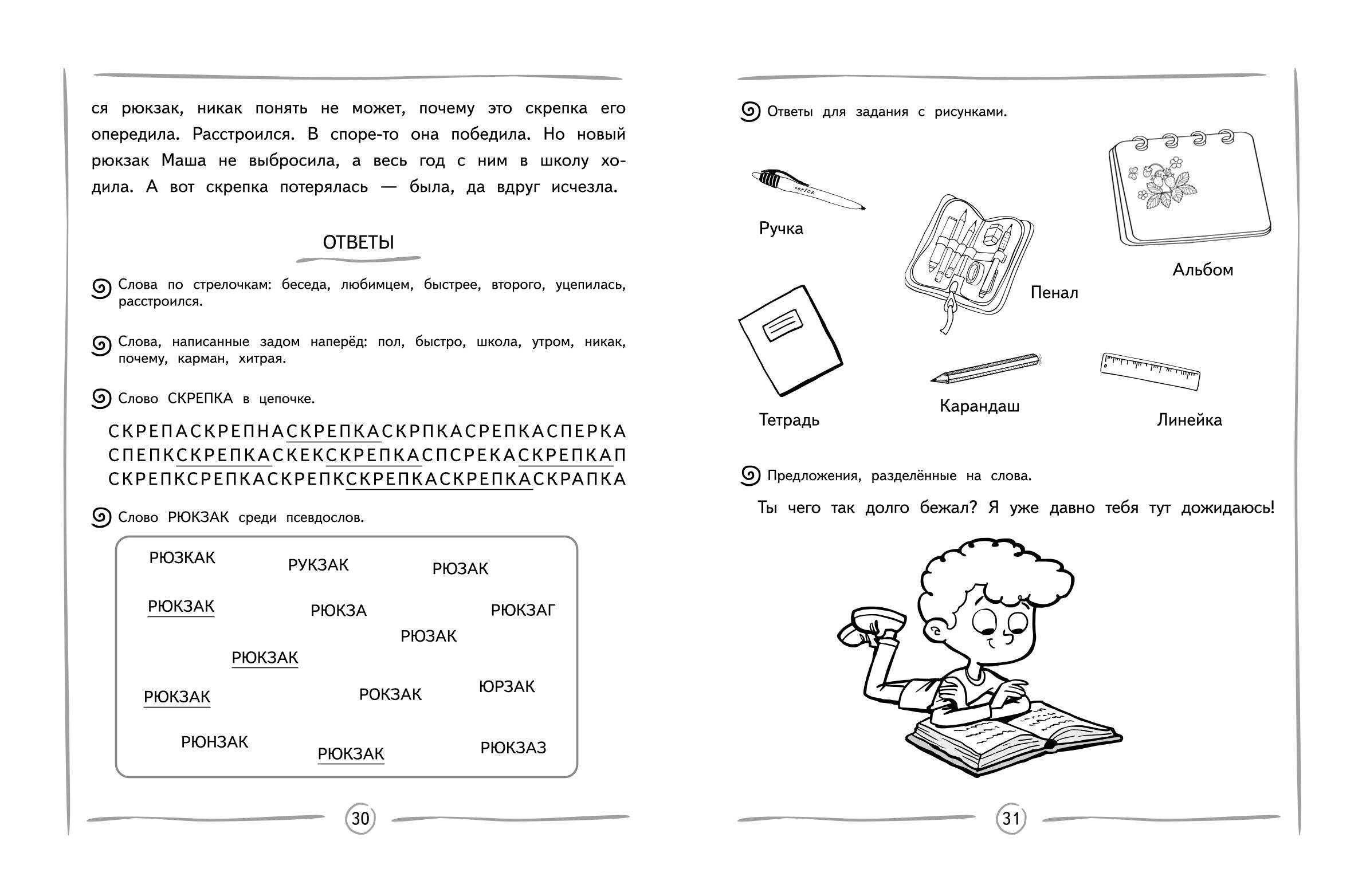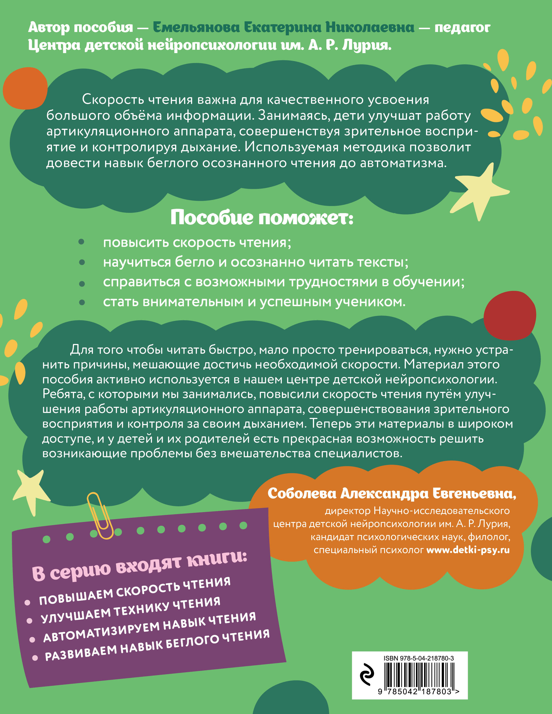 Книга издательства «Эксмо» подготовлена педагогом-практиком с целью увеличения скорости чтения и глубины понимания прочитанного. Нейропсихологический подход, используемый в пособии, способствует более эффективному обучению чтению и активизации работы мозга. Тренажер включает в себя 8 занятий по 13-14 заданий в каждом. В конце занятий имеются ответы для самопроверки. Выполняя увлекательные задания, ребенок будет искать слова в цепочках из букв; находить правильно написанное слово; читать словесные пирамидки, стихотворения, сказки по ролям разными голосами. Использование пособия с нестандартными игровыми заданиями в учебном процессе или в качестве дополнительного материала позволит ребенку повысить успеваемость, своевременно устранить возможные трудности в усвоении школьного материала без привлечения специалистов. Комплекс представленных в пособии упражнений способствует полноценному формированию высших психических функций, развитию межполушарного взаимодействия, что необходимо для успешного обучения в школе и нормального психоэмоционального развития ребёнка.| Издательство | ООО "Издательство "Эксмо" |