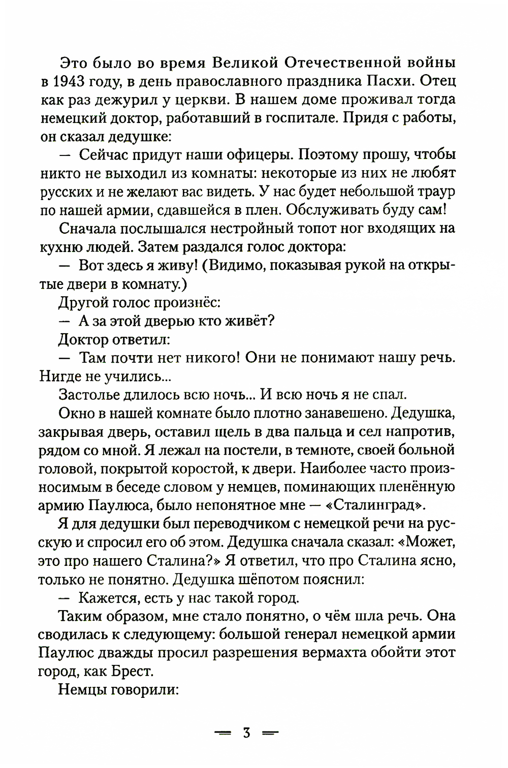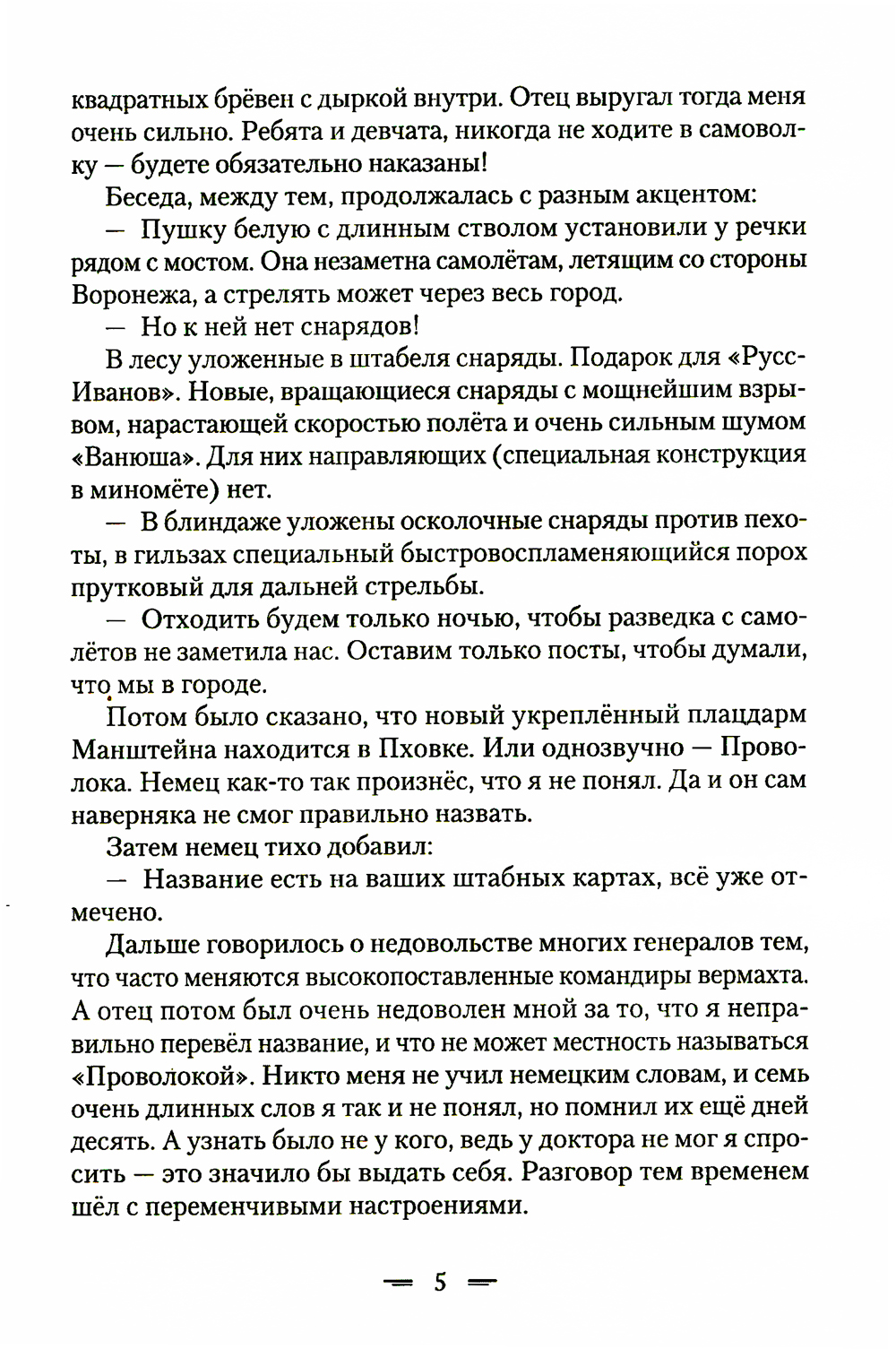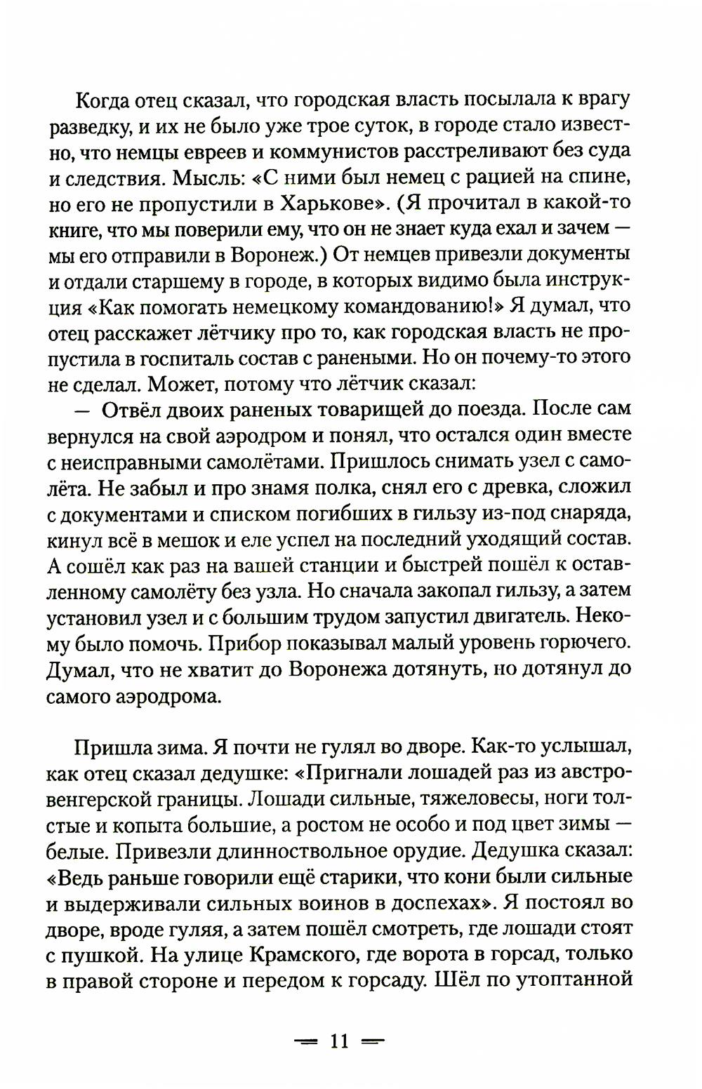 В книге описаны события 1942 года, которые пришлось пережить автору в возрасте шести лет. Действие происходит в оккупированном войсками Вермахта городе Острогожском, что в Воронежской области. Сквозь всё повествование автор проносит мысль из детства во взрослую жизнь о том, что «некоторые люди занимают посты, и им бы надо поддерживать людей, но они только наносят вред человеку!» Автор проживает и излагает эту идею так, чтобы читатель сам все почувствовал. «Один человек делает добро, а другой - наоборот. Такая вот благодарность! - вспоминает автор. - Как в жизни бывало: в один день отец вывез из города гостей, а вечером, вернее ночью, стало известно, что немцы уходят из города». Автор поднимает тему доверия людям: «Ведь почему лётчик дважды не послушался отца? А отец не послушал лётчика, хотя тот предупреждал: «Особо своим не верь!» Оставил коня у коммуниста. В итоге конём для верховой езды пахали огород! Другой случай - когда отца позвали в гости, чтобы застрелить!» Автор трансформировал свои детские впечатления и наблюдения в военные годы во взрослую жизнь и сделал соответствующие выводы. После прочтения этого произведения читатель не останется равнодушным и задумается о многом. Любые совпадения случайны.| Издательство | Юстицинформ |
