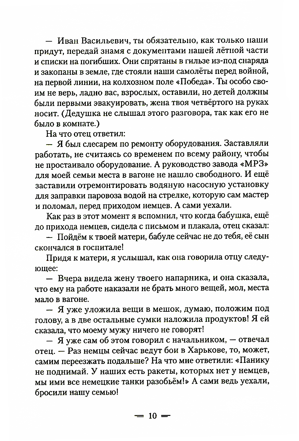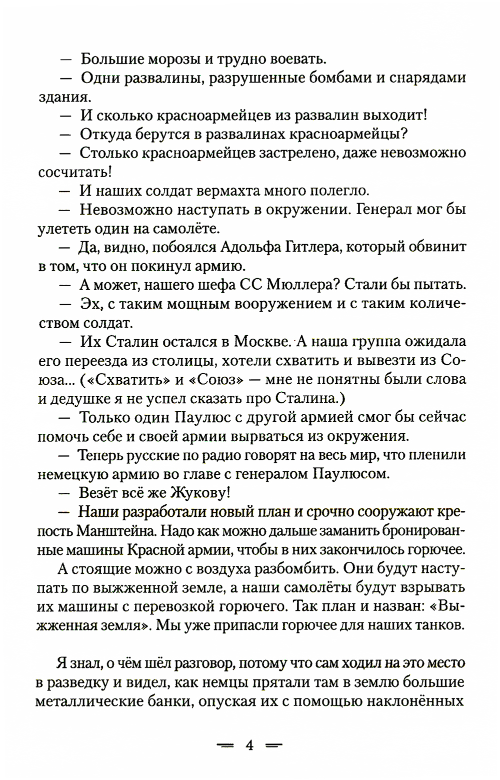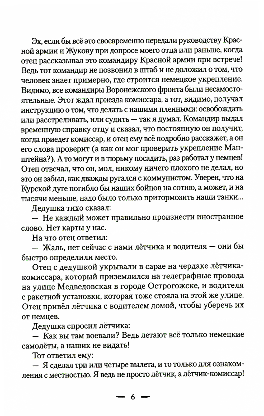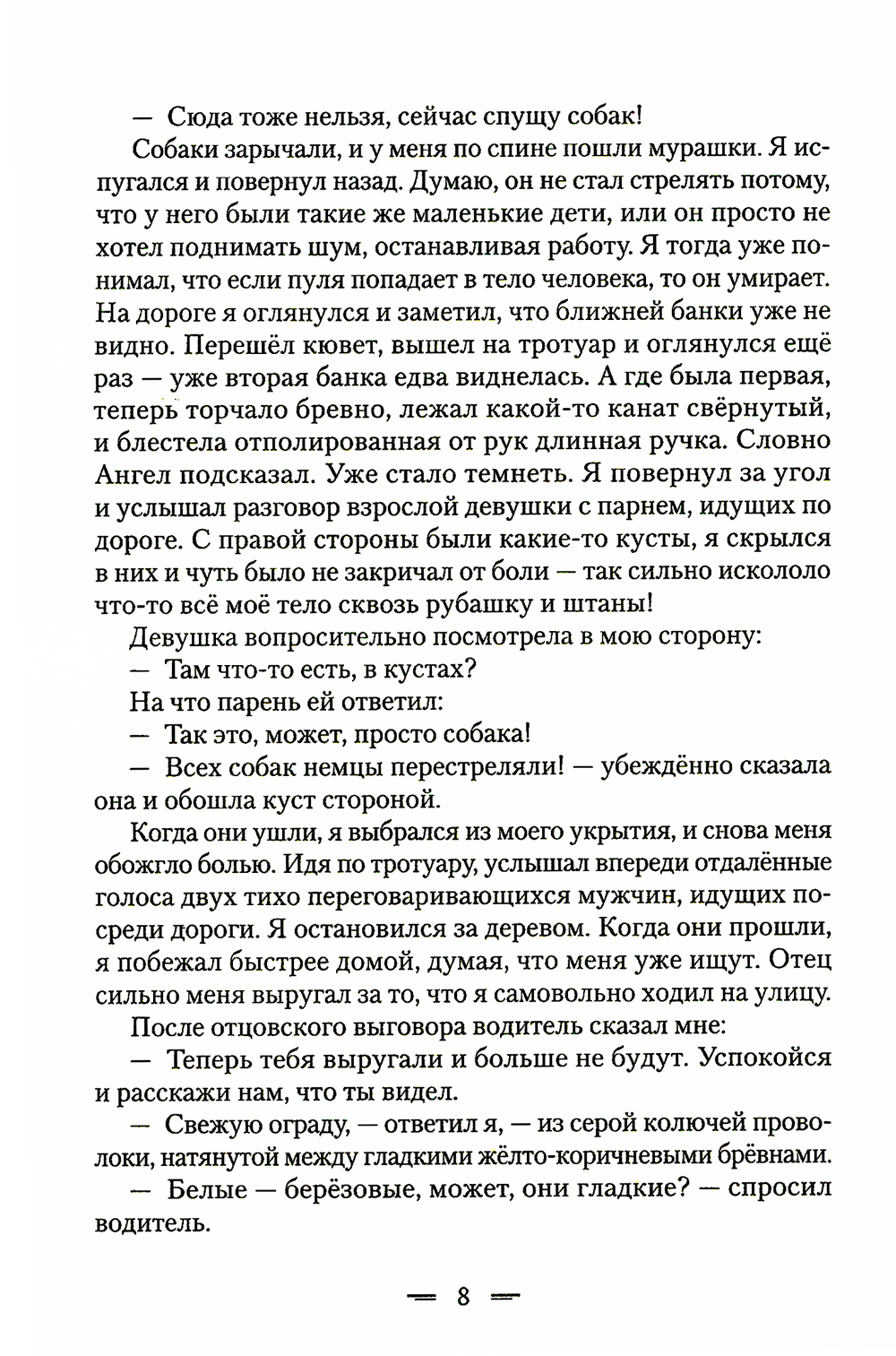 В книге описаны события 1942 года, которые пришлось пережить автору в возрасте шести лет. Действие происходит в оккупированном войсками Вермахта городе Острогожском, что в Воронежской области. Сквозь всё повествование автор проносит мысль из детства во взрослую жизнь о том, что «некоторые люди занимают посты, и им бы надо поддерживать людей, но они только наносят вред человеку!» Автор проживает и излагает эту идею так, чтобы читатель сам все почувствовал. «Один человек делает добро, а другой - наоборот. Такая вот благодарность! - вспоминает автор. - Как в жизни бывало: в один день отец вывез из города гостей, а вечером, вернее ночью, стало известно, что немцы уходят из города». Автор поднимает тему доверия людям: «Ведь почему лётчик дважды не послушался отца? А отец не послушал лётчика, хотя тот предупреждал: «Особо своим не верь!» Оставил коня у коммуниста. В итоге конём для верховой езды пахали огород! Другой случай - когда отца позвали в гости, чтобы застрелить!» Автор трансформировал свои детские впечатления и наблюдения в военные годы во взрослую жизнь и сделал соответствующие выводы. После прочтения этого произведения читатель не останется равнодушным и задумается о многом. Любые совпадения случайны.| Издательство | Юстицинформ |