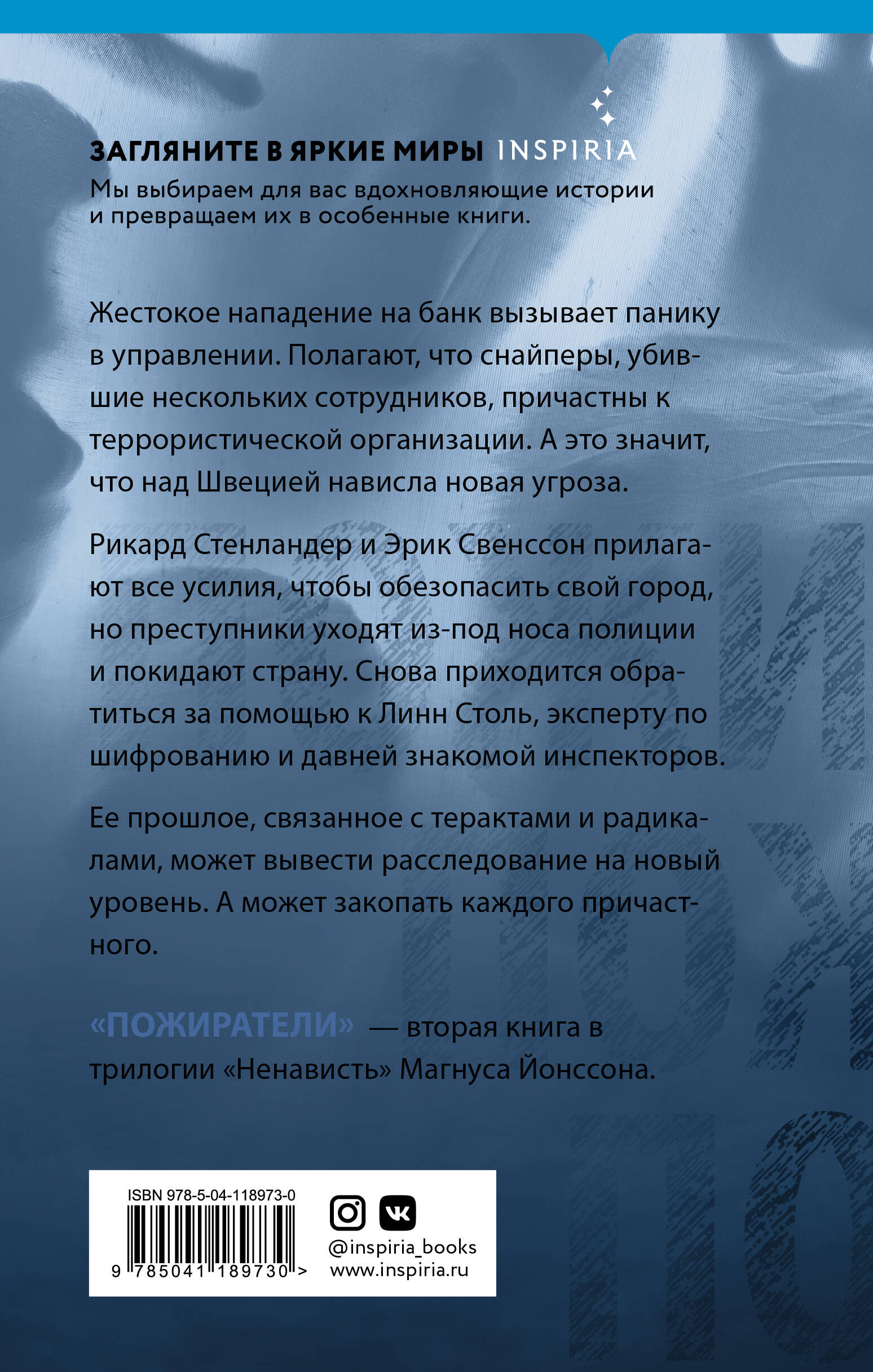 Жестокое нападение на банк вызывает панику в управлении. Они считают, что снайперы, убившие нескольких сотрудников, причастны к террористической организации. А это значит, что над Швецией нависла новая угроза. Рикард Стенландер и Эрик Свенссон прилагают все усилия, чтобы обезопасить свой город, но преступники уходят из-под носа полиции и покидают страну. Снова приходится обратиться за помощью к Линн Столь, эксперту по шифрованию и давней знакомой инспекторов. Ее прошлое, связанное с терактами и радикалами, может вывести расследование на новый уровень. А может закопать каждого причастного. «Пожиратели» - это леденящий душу триллер о кровожадных убийствах. По-скандинавски жесткий роман, где в центре повествования оказывается обычная женщина - студентка-аспирантка Линн Столь. Именно благодаря ее уму, опыту и безмерной уверенности в собственных силах расследование выходит на новый уровень.| Издательство | ООО "Издательство "Эксмо" |