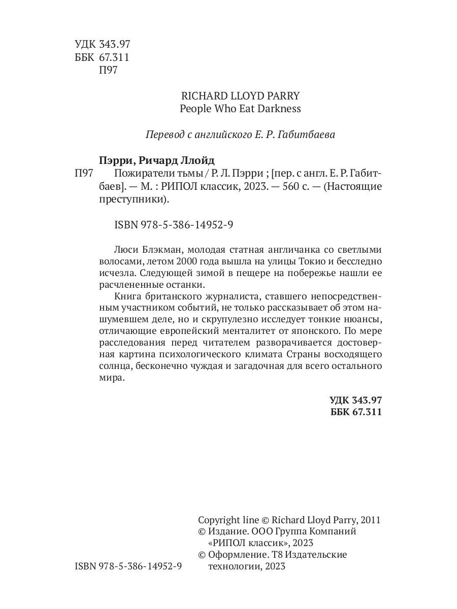Люси Блэкман, молодая статная англичанка со светлыми волосами, летом 2000 года вышла на улицы Токио и бесследно исчезла. Следующей зимой в пещере на побережье нашли ее расчлененные останки. Книга британского журналиста, ставшего непосредственным участником событий, не только рассказывает об этом нашумевшем деле, но и скрупулезно исследует тонкие нюансы, отличающие европейский менталитет от японского. По мере расследования перед читателем разворачивается достоверная картина психологического климата Страны восходящего солнца, бесконечно чуждая и загадочная для всего остального мира.| Издательство | Рипол Классик |