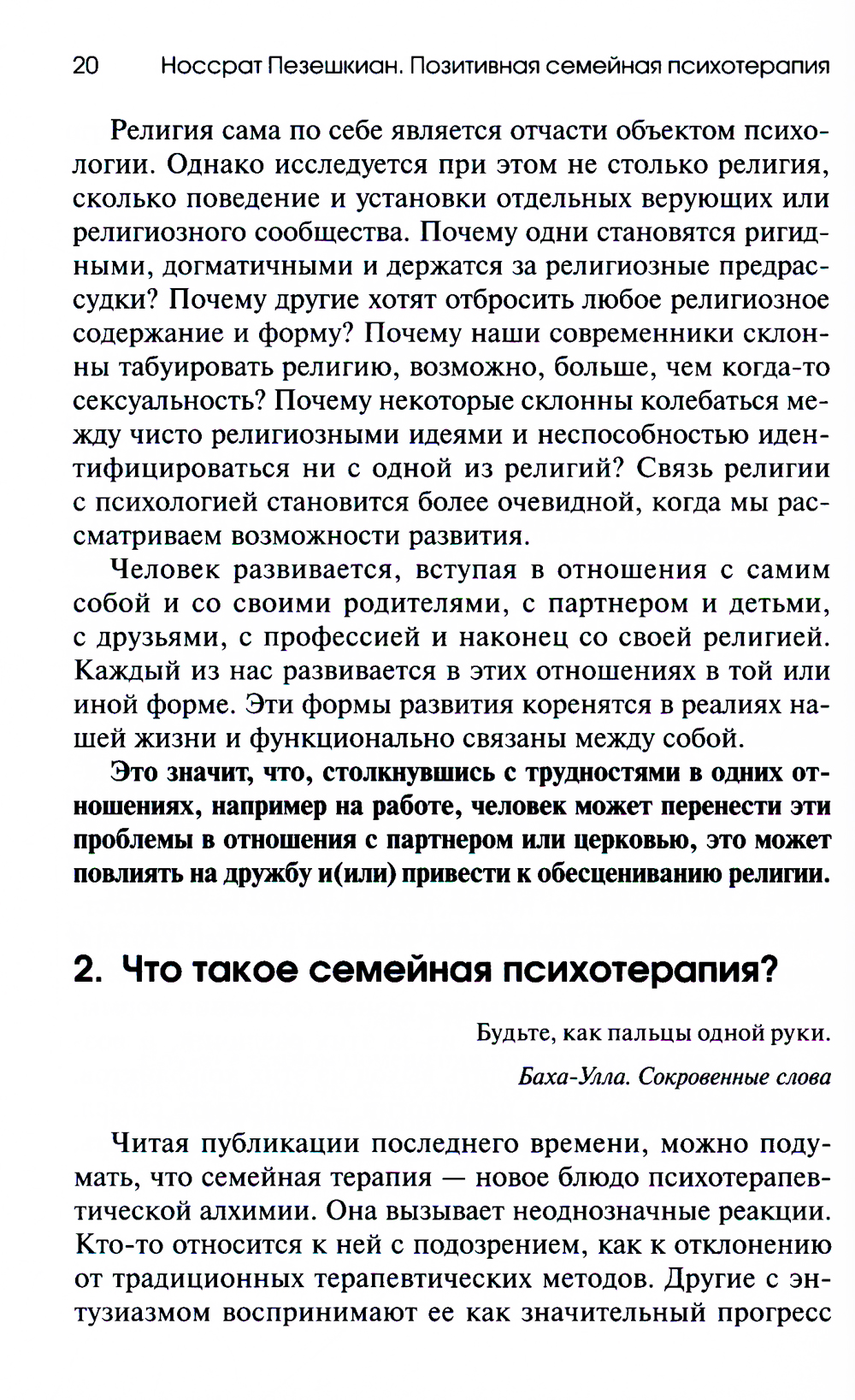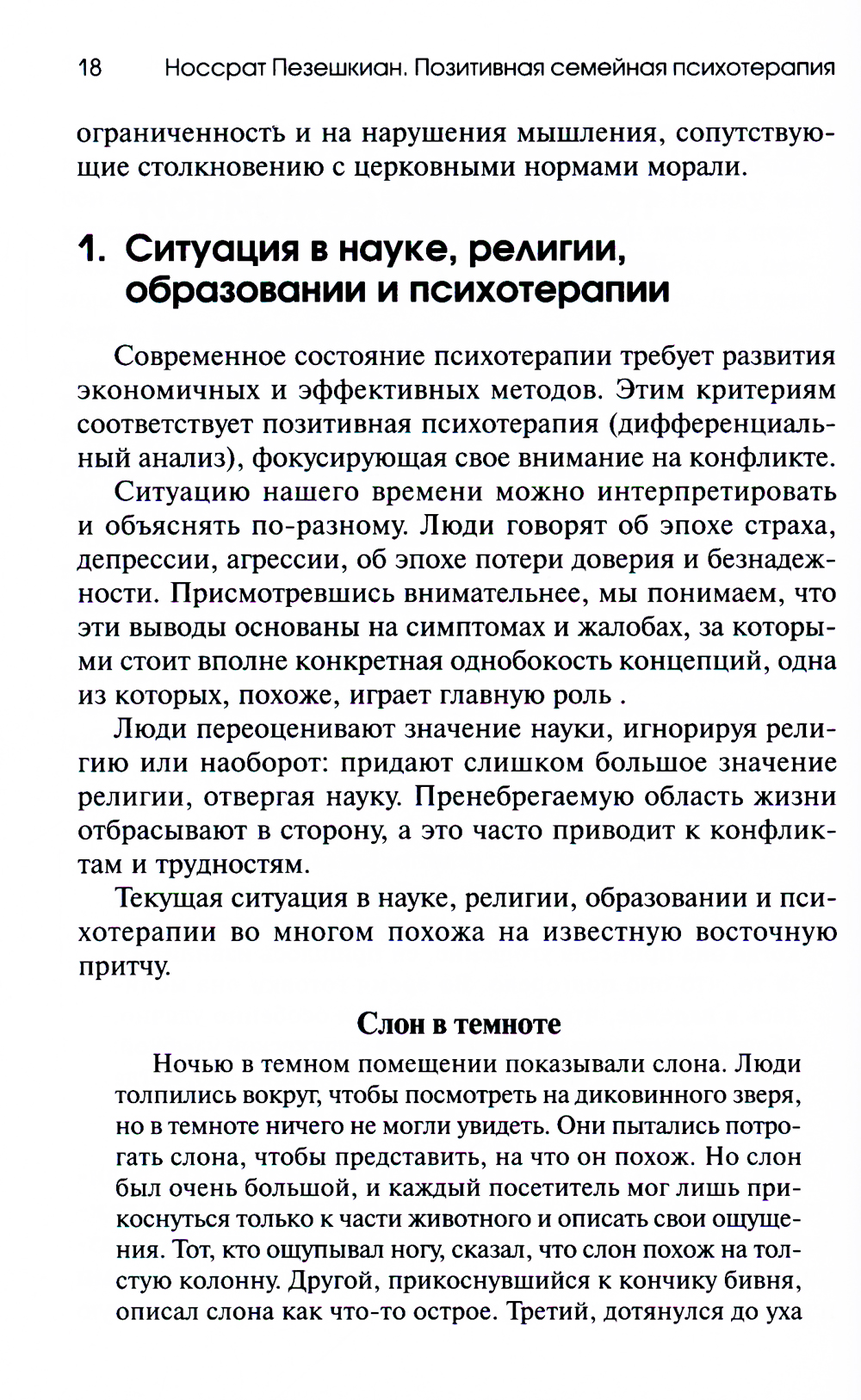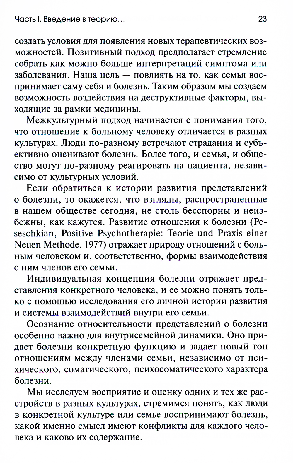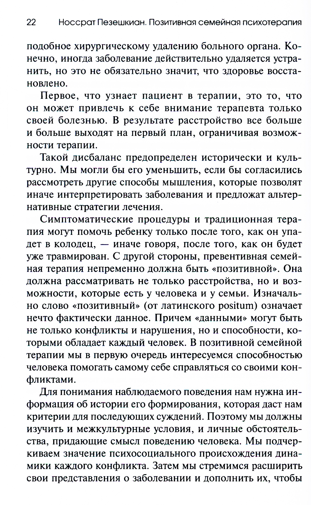 Известный немецкий врач, основатель позитивной (от лат. positum - имеющее место) психотерапии Носсрат Пезешкиан вовлекает пациентов и читателей в процесс терапии, помогая им увидеть функции своих и чужих симптомов и конфликтов. Автор поддерживает эту мотивацию простыми, действенными инструкциями по самопомощи, которым каждый может активно следовать для улучшения своего здоровья и отношений. Чтобы оптимизировать психотерапию отдельных людей, пар и семей, автор объединяет достижения психодинамики и поведенческой терапии. Эффективность позитивной психотерапии отмечена премией Ричарда Мартина - высочайшей наградой в Германии за гарантии качества в медицине. Книга предназначена психологам, психотерапевтам, а также широкому кругу читателей, интересующихся вопросами психологии.