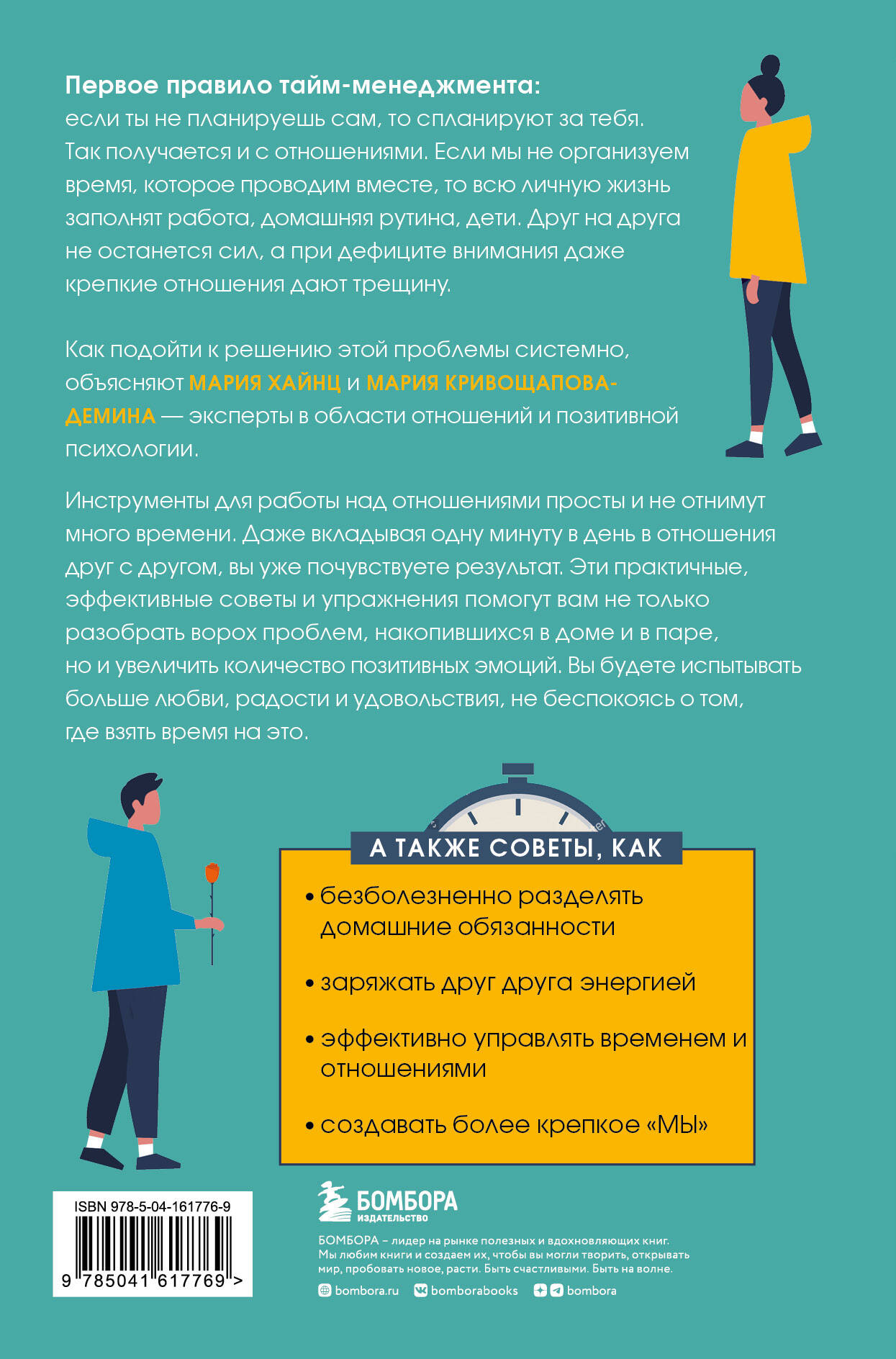 Первое правило тайм-менеджмента: если ты не планируешь сам, то спланируют за тебя. Так получается и с отношениями. Если мы не организуем время, которое проводим вместе, то всю личную жизнь заполнят работа, домашняя рутина, дети. Друг на друга не останется сил, а при дефиците внимания даже крепкие отношения дают трещину. Как подойти к решению этой проблемы системно, объясняют Мария Хайнц и Мария Кривощапова-Дёмина - эксперты в области отношений и позитивной психологии. Инструменты для работы над отношениями просты и не отнимут много времени: даже тратя 1 минуту в день друг на друга, вы уже почувствуете результат. Эти советы помогут вам вместе с партнером разобрать ворох проблем, накопившихся в доме и в паре. А также: - безболезненно разделять домашние обязанности - заряжать друг друга энергией - эффективно управлять временем и отношениями - создать более крепкое "МЫ"