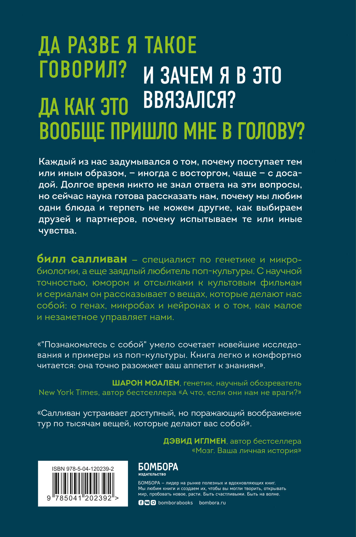 «Да разве я такое говорил?» «И зачем я в это ввязался?» «Да как это вообще пришло мне в голову?» Каждый из нас задумывался о том, почему поступает тем или иным образом - иногда с восторгом, чаще - с досадой. Долгое время никто не знал ответа на эти вопросы, но сейчас наука готова рассказать нам, почему мы любим одни блюда и терпеть не можем другие, как выбираем друзей и партнеров, почему испытываем те или иные чувства. Билл Салливан - специалист по генетике и микробиологии, а еще заядлый любитель поп-культуры. С научной точностью, юмором и отсылками к культовым фильмам и сериалам он рассказывает о вещах, которые делают нас собой: о генах, микробах и нейронах и о том, как малое и незаметное управляет нами. «Салливан устраивает доступный, но поражающий воображение тур по тысячам вещей, которые делают вас собой» - Дэвид ИГЛМЕН, автор бестселлера «Мозг. Ваша личная история» «"Познакомьтесь с собой" умело сочетает новейшие исследования и примеры из поп-культуры. Книга легко и комфортно читается: она точно разожжет ваш аппетит к знаниям» - Шарон МОАЛЕМ, ученый-генетик, научный обозреватель New York Times, автор бестселлера "А что, если они нам не враги? Как болезни спасают людей от вымирания".| Издательство | ООО "Издательство "Эксмо" |