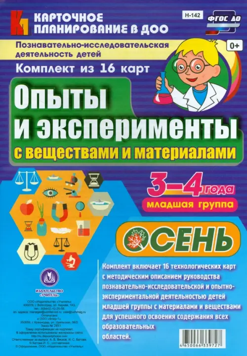Комплект включает 16 технологических карт с методическим описанием руководства познавательно-исследовательской и опытно-экспериментальной деятельностью детей младшей группы с материалами и веществами для успешного освоения содержания всех областей.