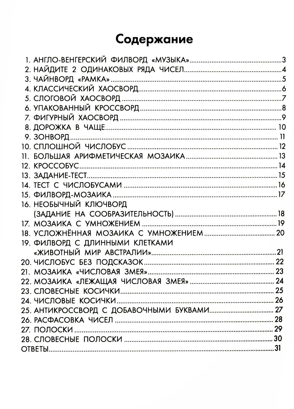 Перед вами чудесный сборник кроссвордов и других задач со словами и буквами, а также с числами и геометрическими фигурами для детей 7-8 лет. Наверняка вы и раньше решали головоломки. Но в этой книжечке вы увидите много новых, прежде незнакомых вам видов словесных и числовых головоломок, при решении которых вы проведёте с пользой свой досуг. Числовые задания помогут быстрее считать на уроках математики. А словесные задачи разовьют память и сообразительность и помогут ещё лучше усвоить школьную программу по чтению и литературе.| Издательство | Феникс |