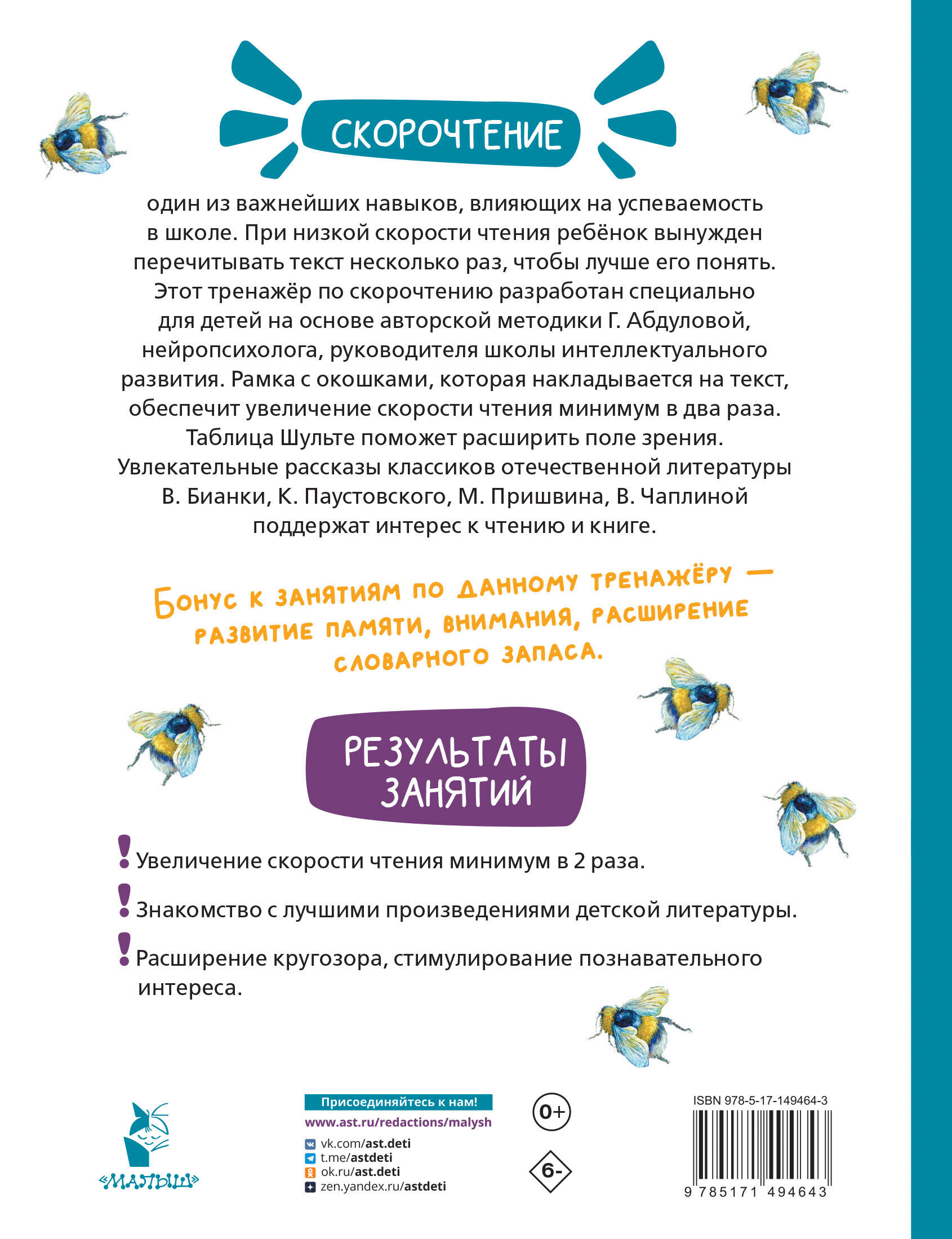 7 причин купить книгу: - Увеличение скорости чтения минимум в два раза. - Знакомство с лучшими произведениями детской литературы. - Развитие памяти, внимания, познавательного интереса, увеличение словарного запаса. - Таблица Шульте для расширения поля зрения. - Специальная рамка с окошками, которая накладывается на текст, и позволяет значительно улучшить технику чтения. - Занятия по авторской методике Г. Абдуловой, нейропсихолога, руководителя школы интеллектуального развития, - Тренировка одного из самых важных навыков для успешного обучения в школе.| Издательство | АСТ |