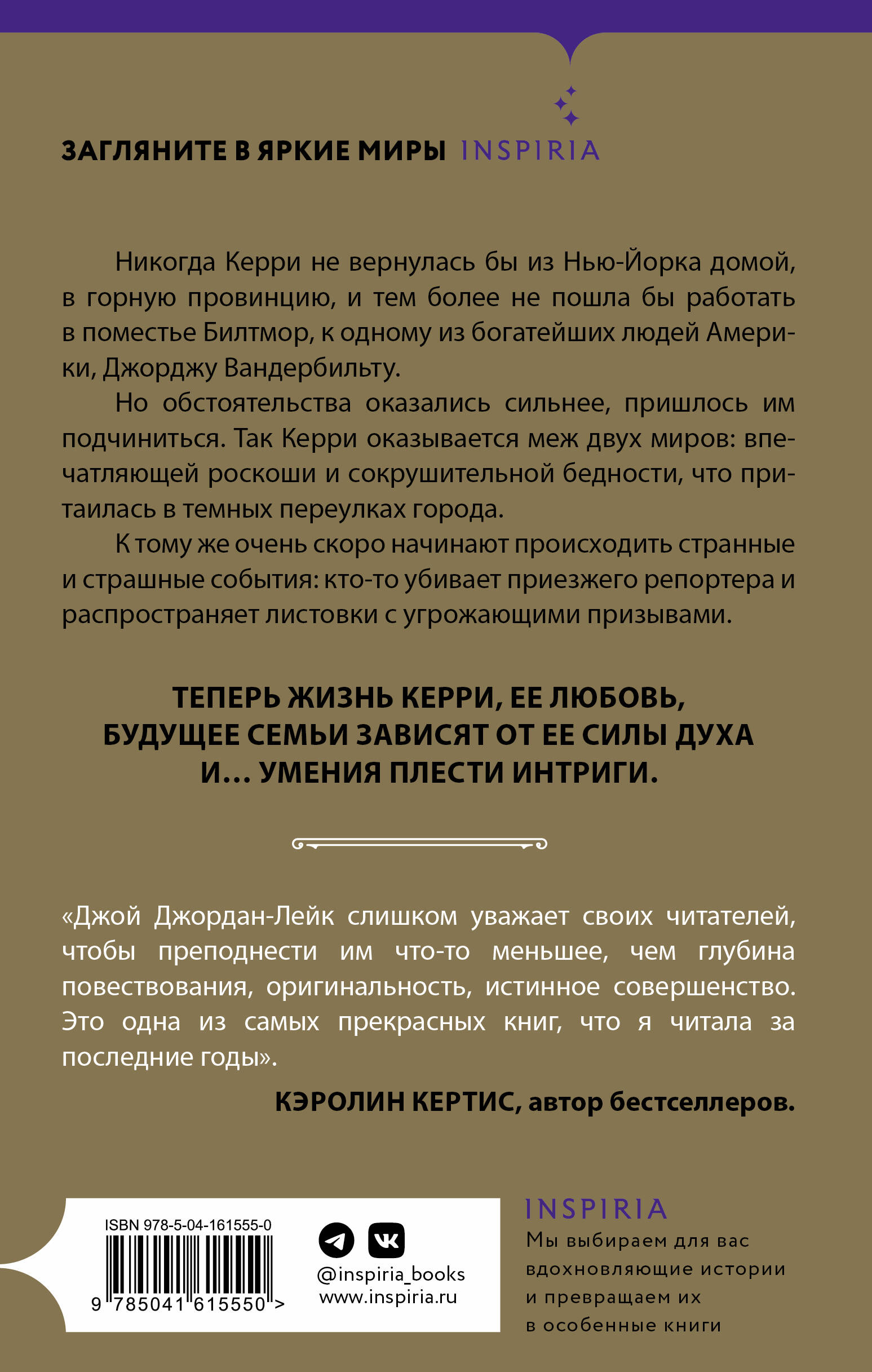 Никогда Керри не вернулась бы из Нью-Йорка домой, в горную провинцию, и тем более не пошла бы работать в поместье Билтмор, к одному из богатейших людей Америки, Джорджу Вандербильту. Но обстоятельства оказались сильнее, пришлось им подчиниться. Так Керри оказывается меж двух миров: впечатляющей роскоши и сокрушительной бедности, что притаилась в темных переулках города. К тому же очень скоро в ненавистном городке начинают происходитьт очень странные, жуткие события: кто-то убивает приезжего репортера и распространяет листовки с угрожающими призывами. Теперь жизнь Керри, ее любовь, будущее ее семьи зависят от ее силы духа и… умения плести интриги. «Джой Джордан-Лэйк слишком уважает своих читателей, чтобы преподнести им что-то меньшее, чем глубина повествования, оригинальность, истинное совершенство. Это одна из самых прекрасных книг, что я читала за последние годы». - Кэролин Кертис, автор бестселлеров| Издательство | Эксмо |