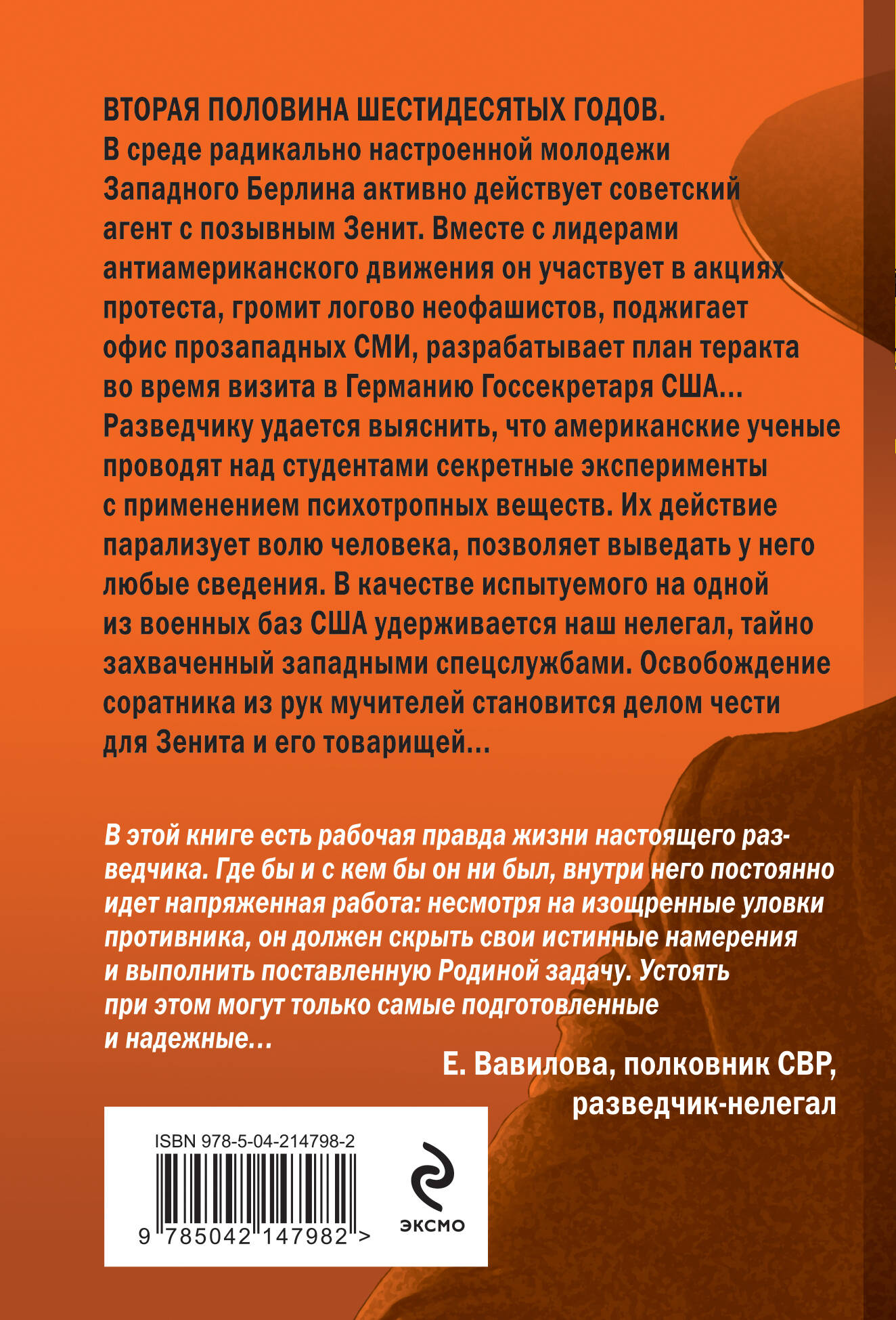 На основе реальных событий. Роман о секретной работе советских разведчиков. Автор обладает абсолютно секретной информацией, раскрыть которую можно пока только частично. Вторая половина шестидесятых годов. В среде радикально настроенной молодежи Западного Берлина активно действует советский агент с позывным «Зенит». Вместе с лидерами антиамериканского движения он участвует в акциях протеста, громит логово неофашистов, поджигает офис прозападных СМИ, разрабатывает план теракта во время визита в Германию Госсекретаря США… Разведчику удается выяснить, что американские ученые проводят над студентами секретные эксперименты с применением психотропных веществ. Их действие парализует волю человека, позволяет выведать у него любые сведения. В качестве испытуемого на одной из военных баз США удерживается наш нелегал, тайно захваченный западными спецслужбами. Освобождение соратника из рук мучителей становится делом чести для Зенита и его товарищей… ------------------------------ «В этой книге есть рабочая правда жизни настоящего разведчика. Где бы и с кем бы он ни был, внутри него постоянно идет напряженная работа: несмотря на изощренные уловки противника, он должен скрыть свои истинные намерения и выполнить поставленную Родиной задачу. Устоять при этом могут только самые подготовленные и надежные…» - Е. Вавилова, полковник СВР, разведчик-нелегал| Издательство | ООО "Издательство "Эксмо" |
