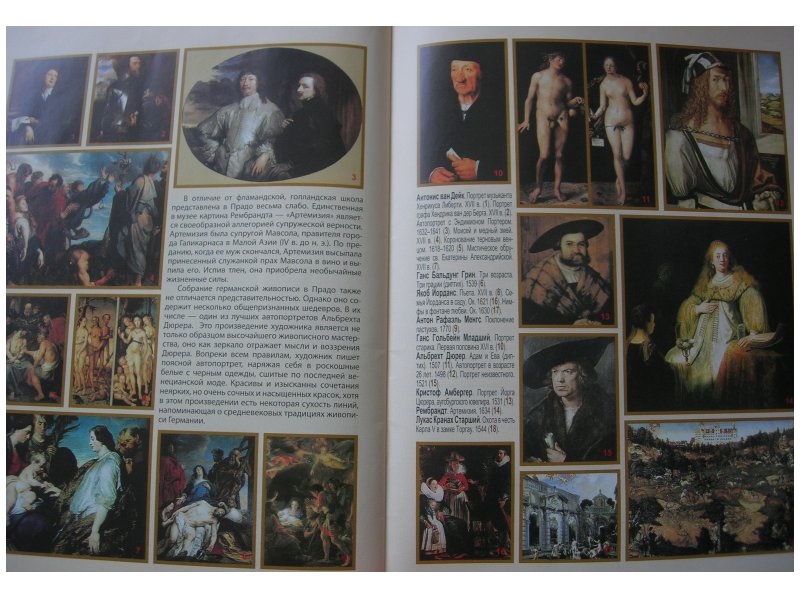Здесь также нашли свое место творения итальянских, фламандских и германских живописцев. В наши дни музей может гордиться шедеврами Тициана, Рубенса, Тьеполо, Босха, Дюрера, Корреджо, Ван Дейка, Лоррена и других знаменитых художников, представляющих основные живописные школы Европы. Этому созвездию имен музей прежде всего обязан вкусу и художественной культуре Филиппа II и его внука Филиппа IV.